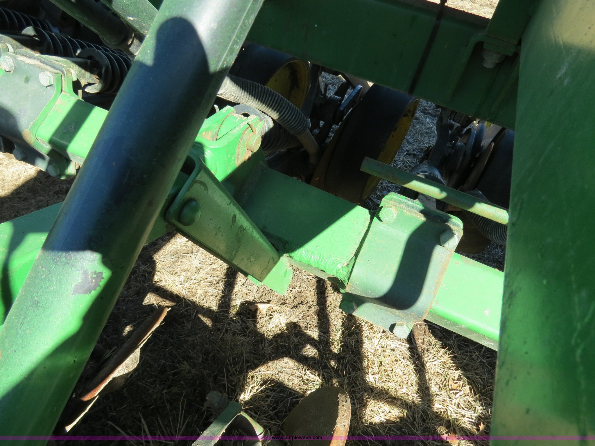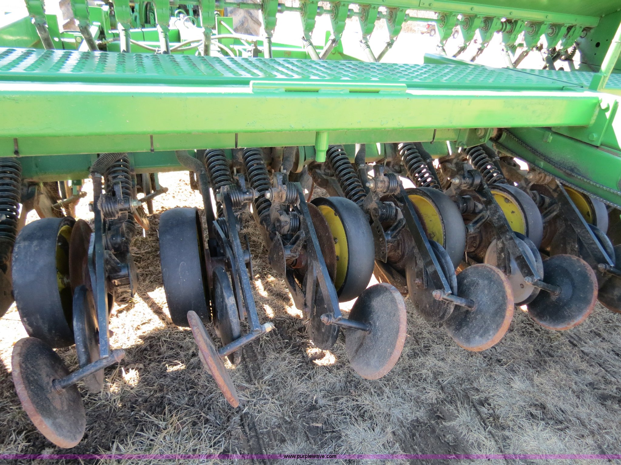 Purple Wave is selling a used Grain Drill or Seeder in Missouri. This item is a John Deere 750 15' no-till drill with the following: 24 row units, 7.5" spacing, 15'W, Bulk fill, Mechanical delivery, Mechanical meters, Ground meter drive system, Extra down pressure springs, 18" single disk openers, 15" seed firmers, Single press wheel/cast closer, Seed stoppers for 15" row spacing, Pin/slab hitch, Recently replaced 11L-15SL tires, Operators manual, Stored inside, Serial N00750X000214