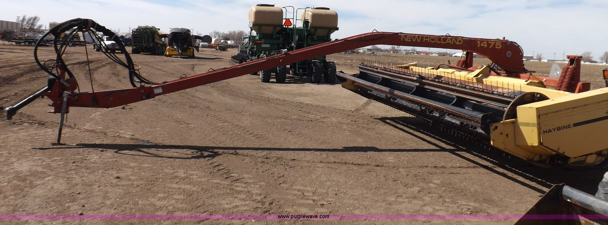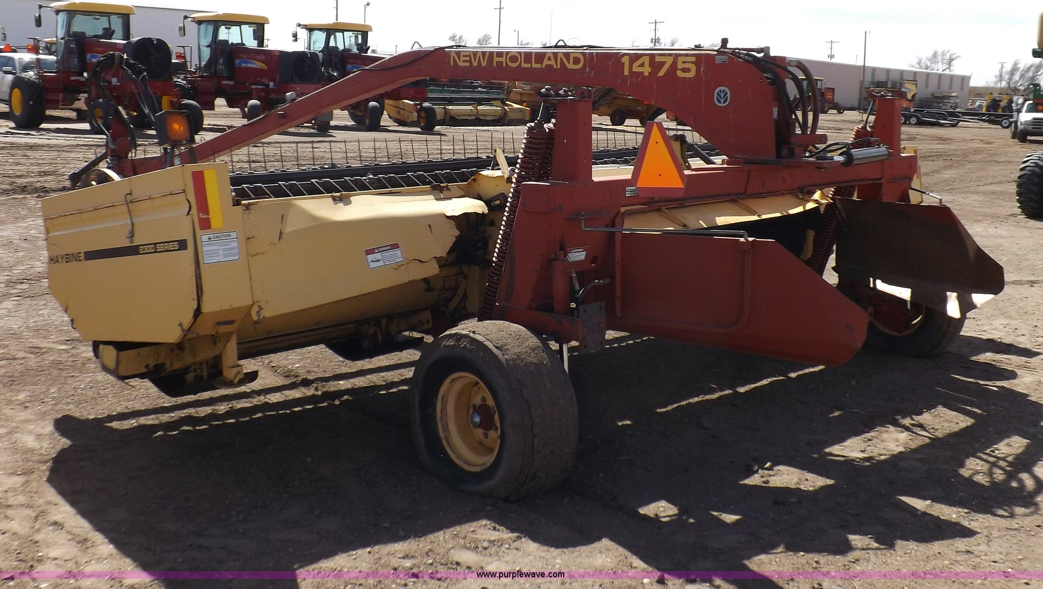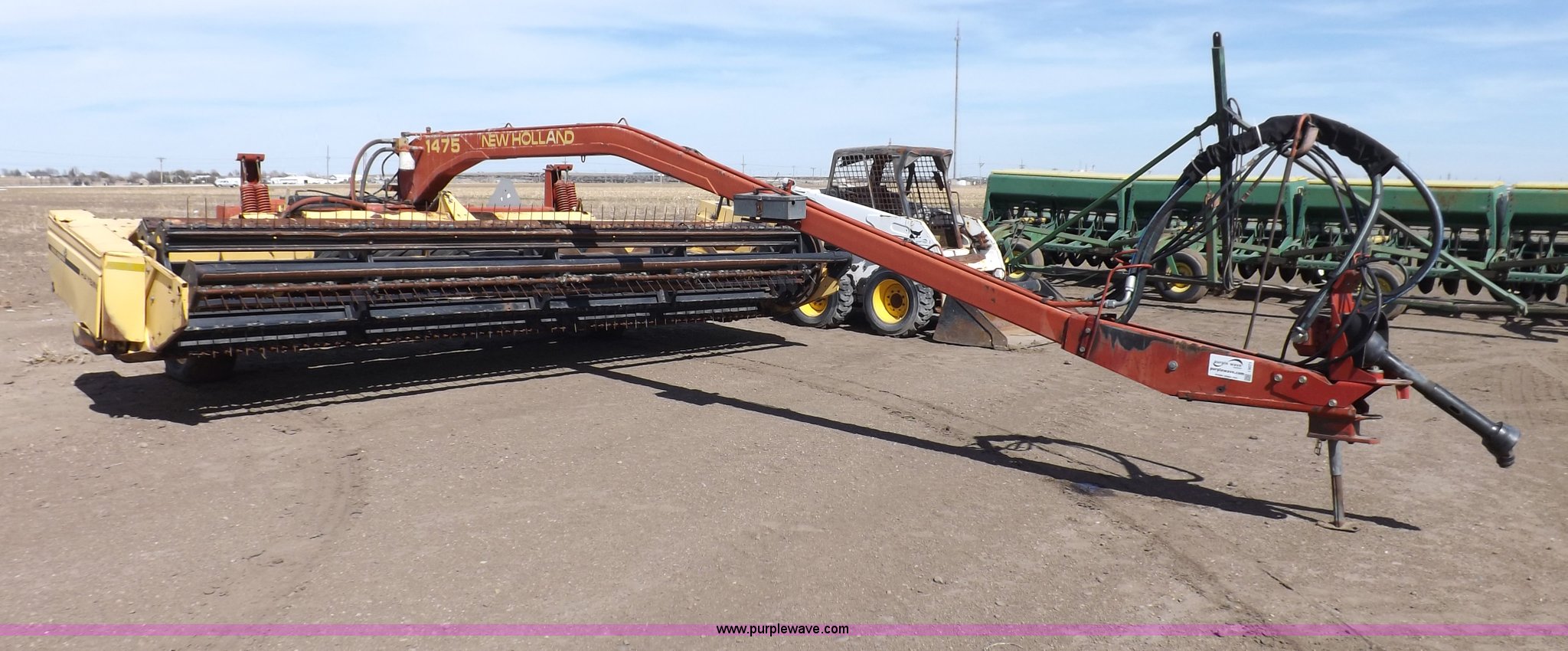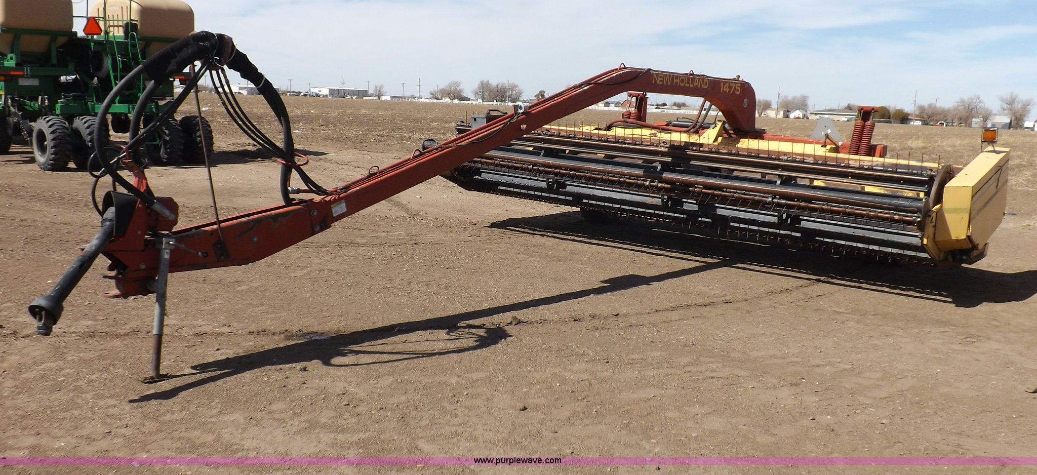 Purple Wave is selling a used Windrower Pull Type in Kansas. This item is a New Holland 1475 mower conditioner with the following: 18'W, Small 1000 PTO, Nylon crimpers, Nylon pan inserts, Adjustable windrow width, Pin hitch, Head model 2328, Serial 637418, Hitch model 1475, Serial 614935, 31x13.5-15 tires, Left tire low, Shrouds and covers bent and cracked, Hydraulic hose leak