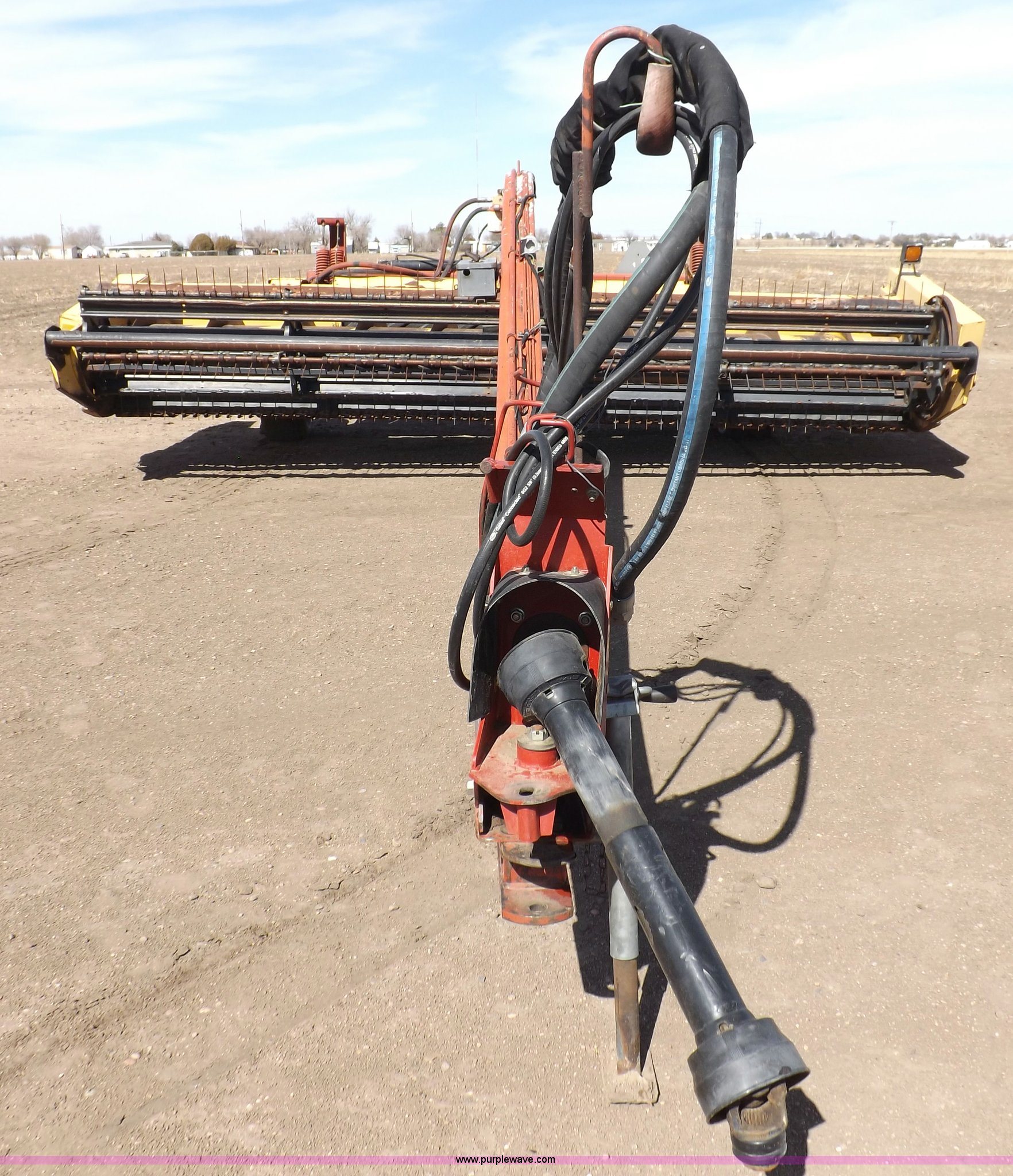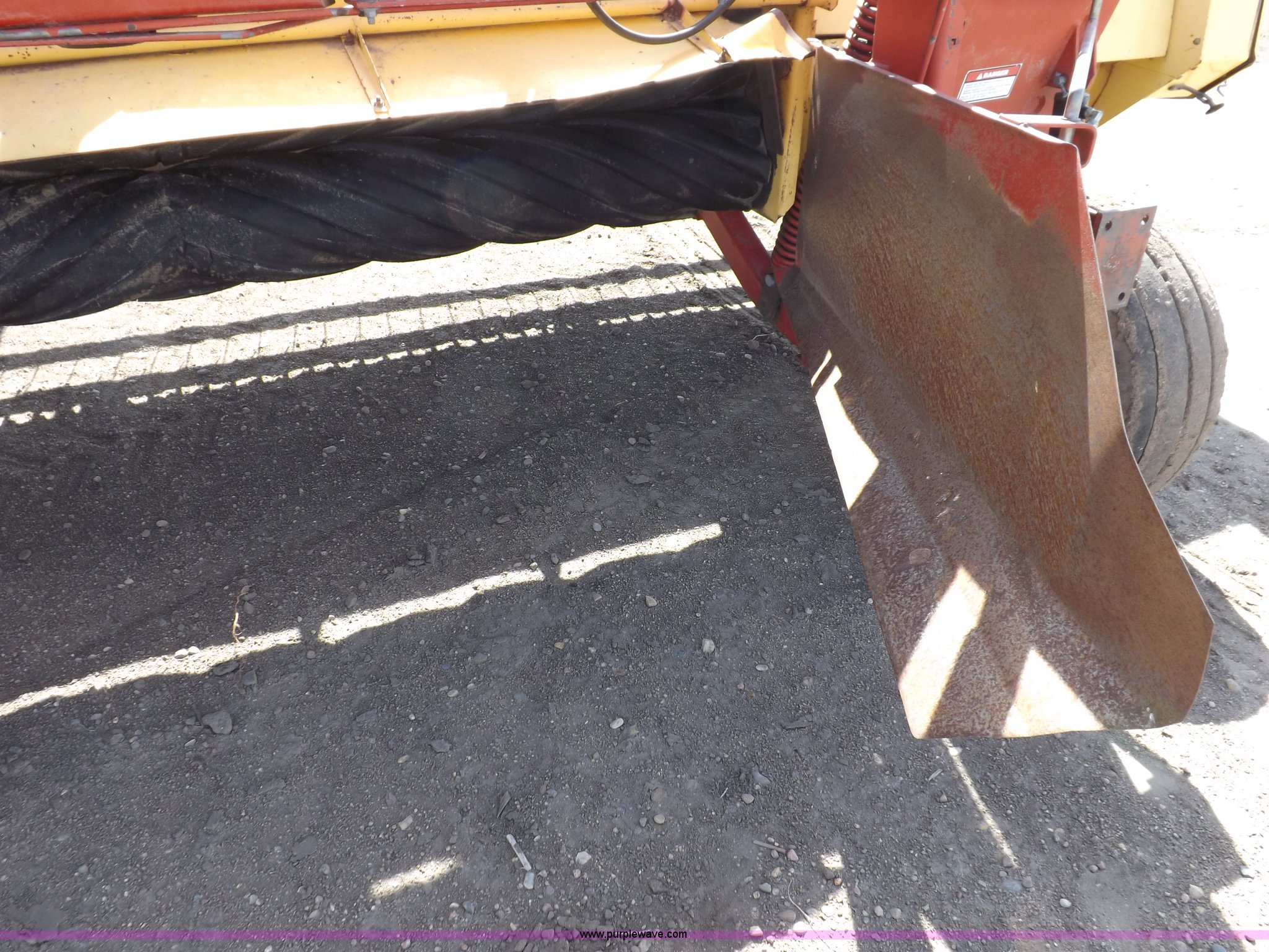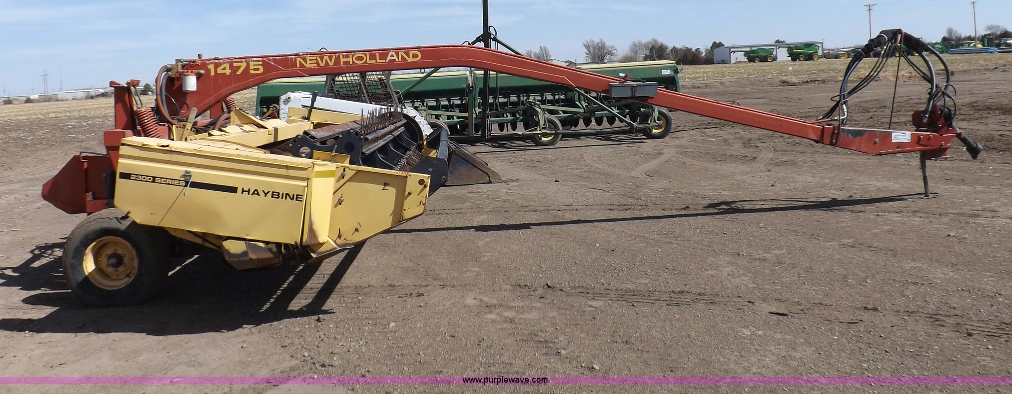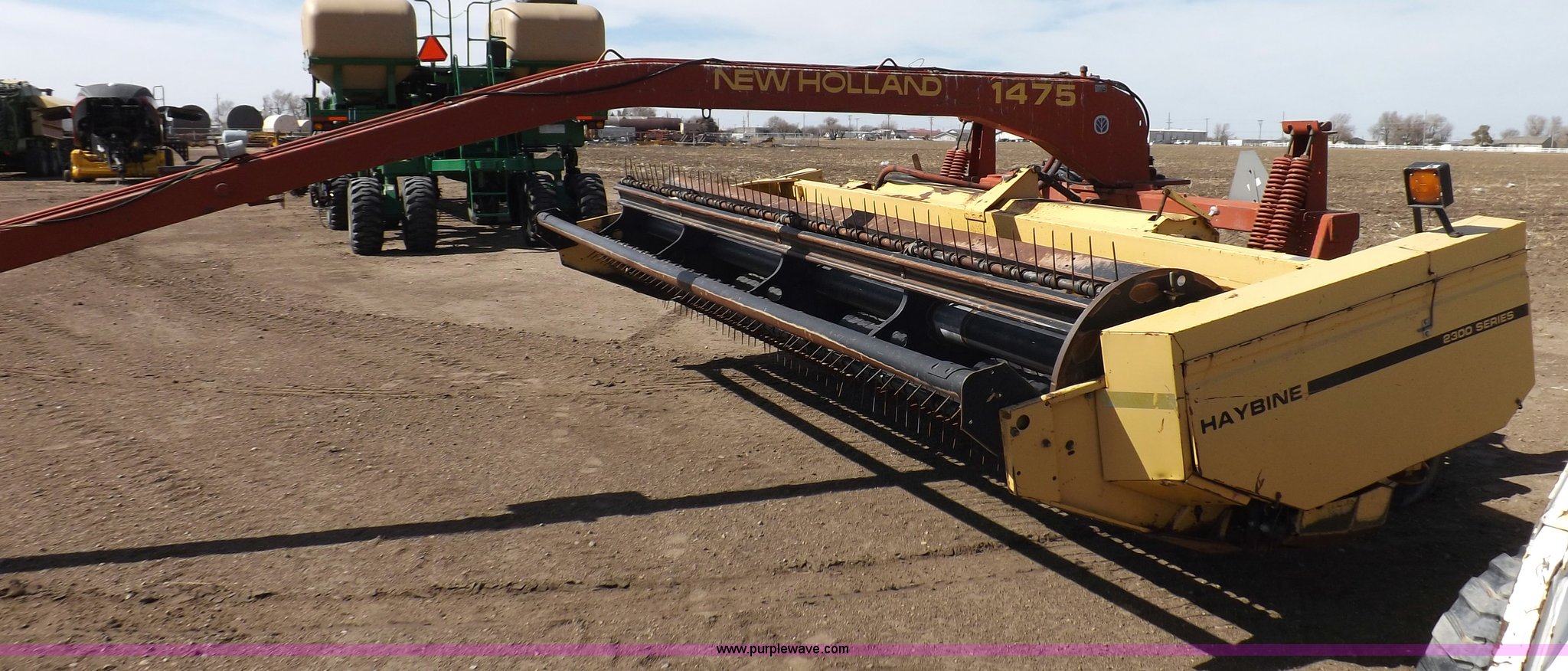 Purple Wave is selling a used Windrower Pull Type in Kansas. This item is a New Holland 1475 mower conditioner with the following: 18'W, Small 1000 PTO, Nylon crimpers, Nylon pan inserts, Adjustable windrow width, Pin hitch, Head model 2328, Serial 637418, Hitch model 1475, Serial 614935, 31x13.5-15 tires, Left tire low, Shrouds and covers bent and cracked, Hydraulic hose leak