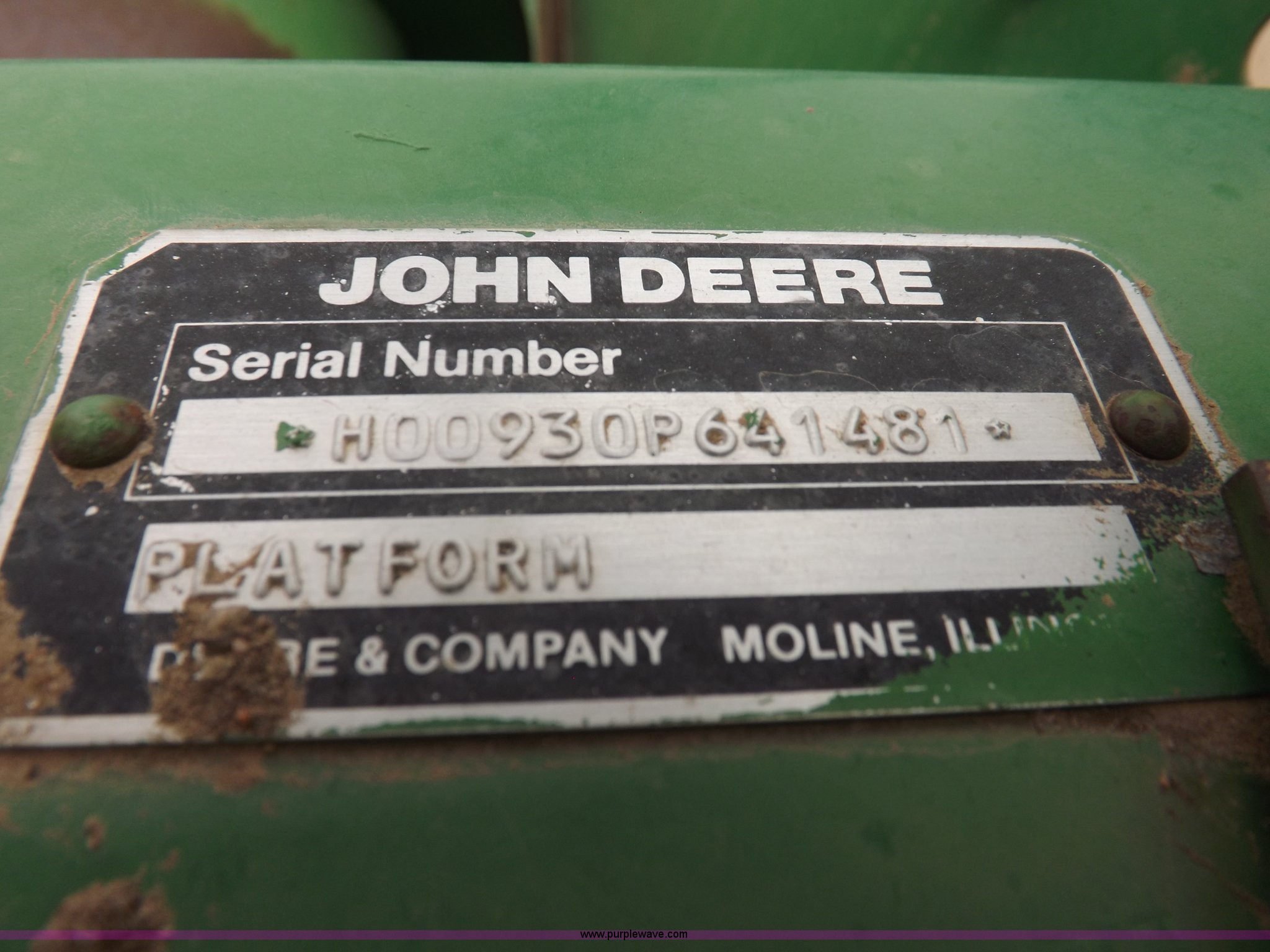 Purple Wave is selling a used Platform or Stripper Head in Kansas. This item is a 1991 John Deere 930 head with the following: 30'W, 23 row, Hydraulic reel lift cylinder, Lucke sunflower attachment, Stubble lights, Transport trailer not included, Serial H00930P641481