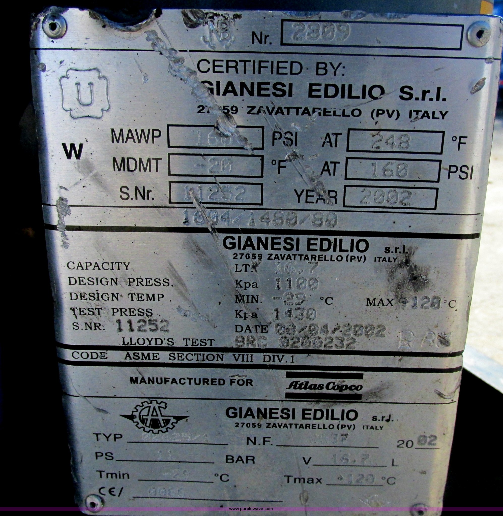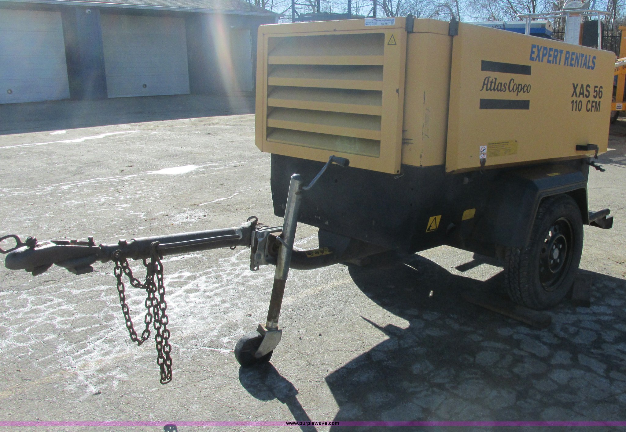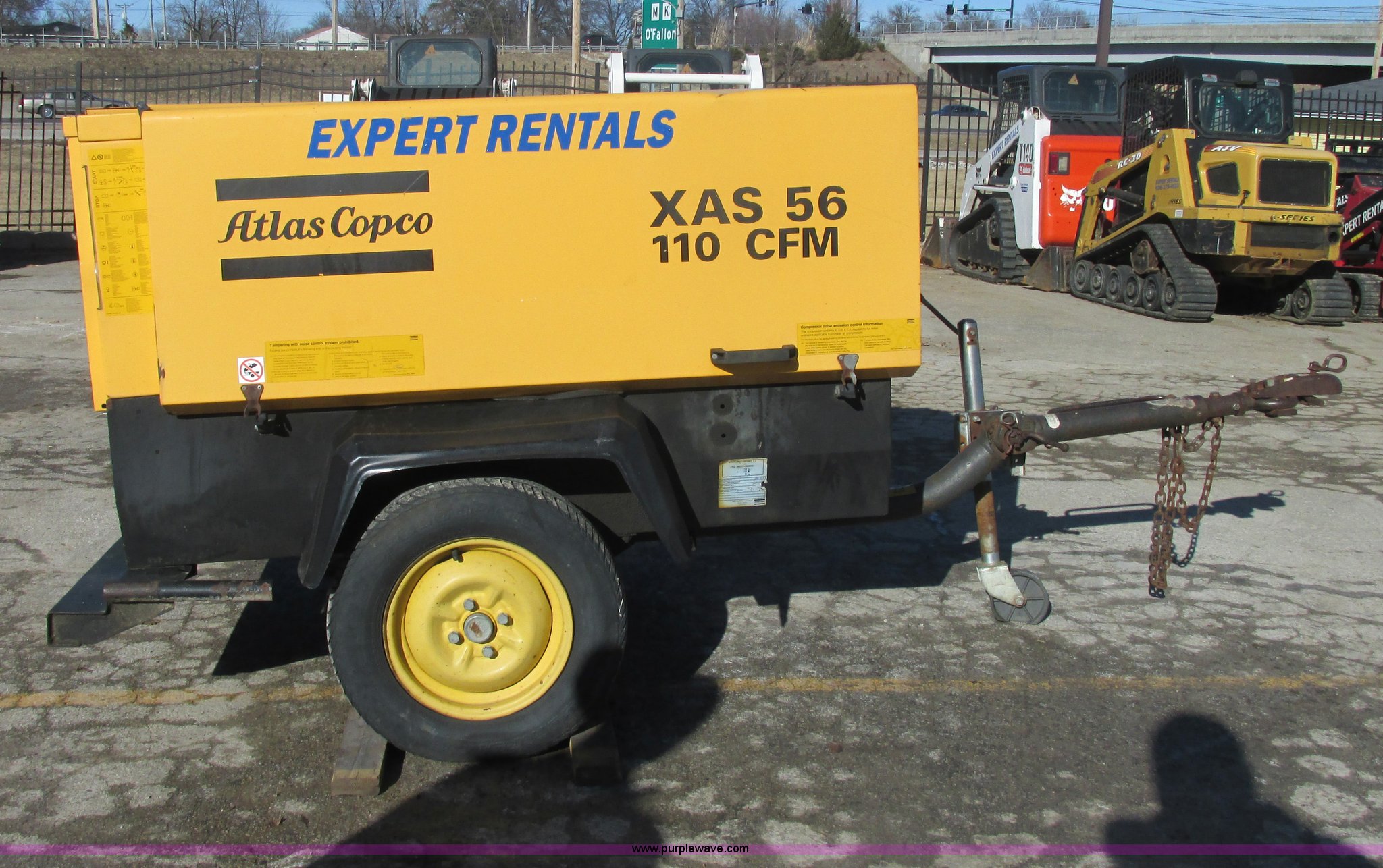 Purple Wave is selling a used Air Compressor in Missouri. This item is a 2002 Atlas Copco XA556 air compressor with the following: 1,782 hours on meter, Duetz two cylinder diesel engine, Oil cooled, Electric start, Serial F2M1011, 110 cfm, Dual air outlets, Lifting eye, Pintle hitch with 2" ball adapter, Adjustable, P155/8R13 tires, Hood latches missing