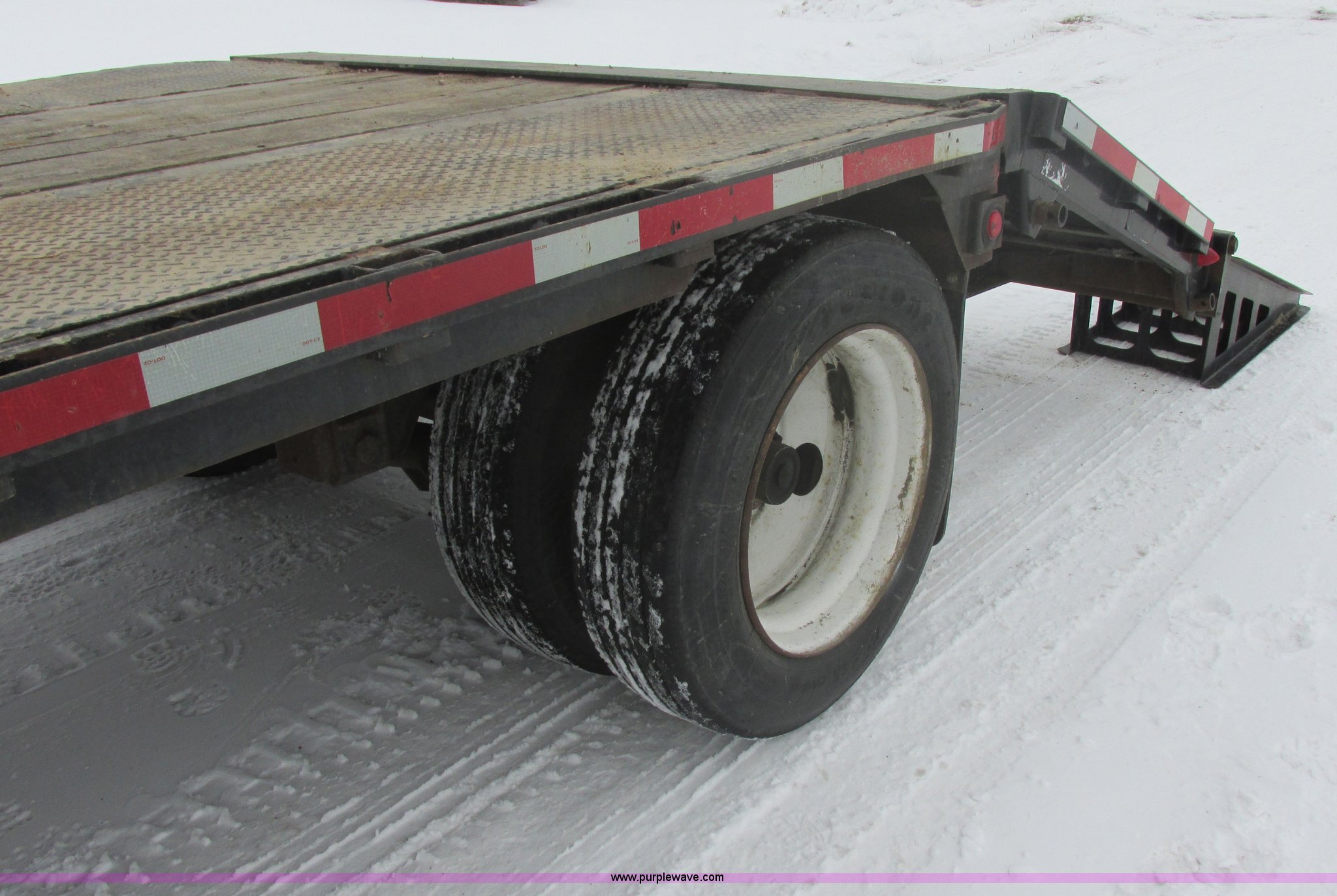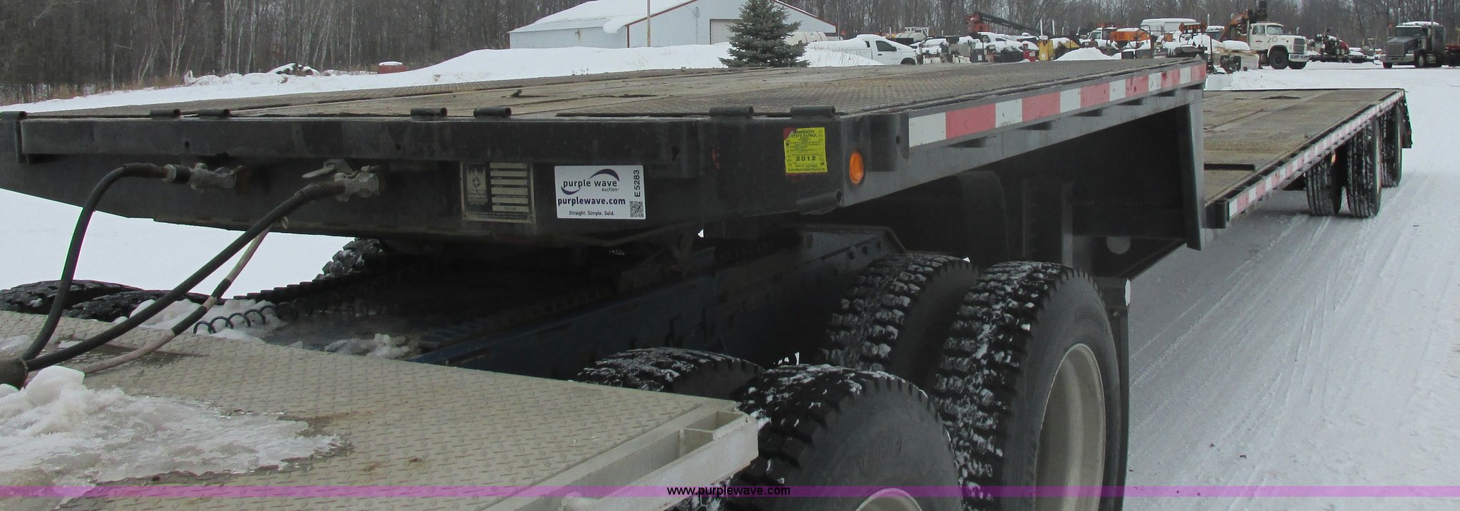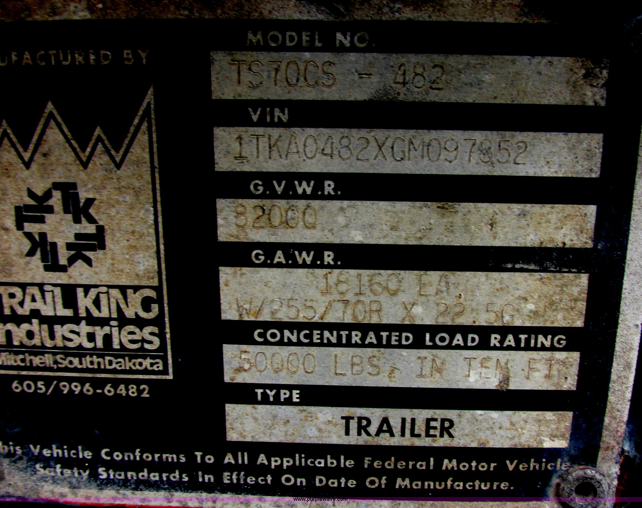 Purple Wave is selling a used Equip. Trailer in Minnesota. This item is a 1986 Trail King TS7DCS-482 spread axle drop deck equipment trailer with the following: 38'L x 102"W main deck, 10'4"L top deck, 5'L beaver tail, Wood and steel deck, 4'L x 22.5"W adjustable ramps, (7) ratchet tie downs, Stake pockets, LED lighting, 225/70R22.5 tires, GVWR 82,000 lbs, GAWR 18,160 lbs