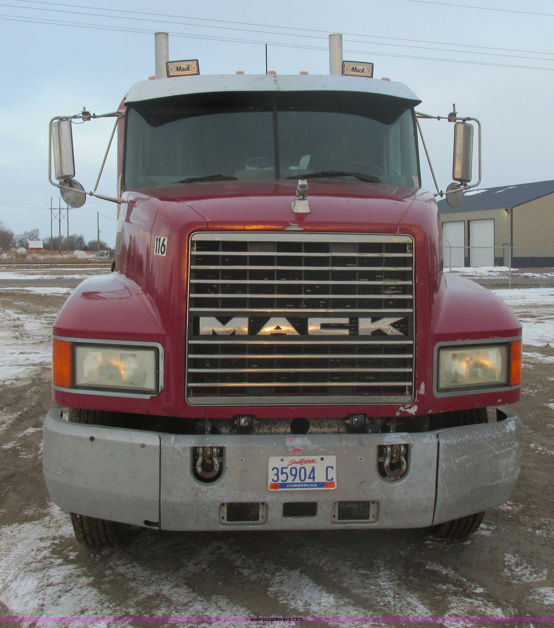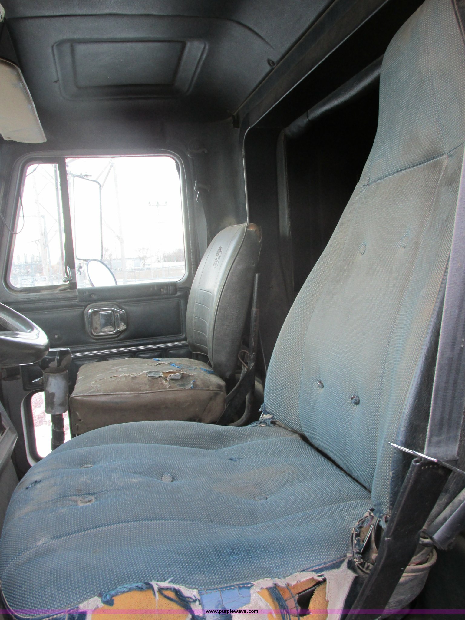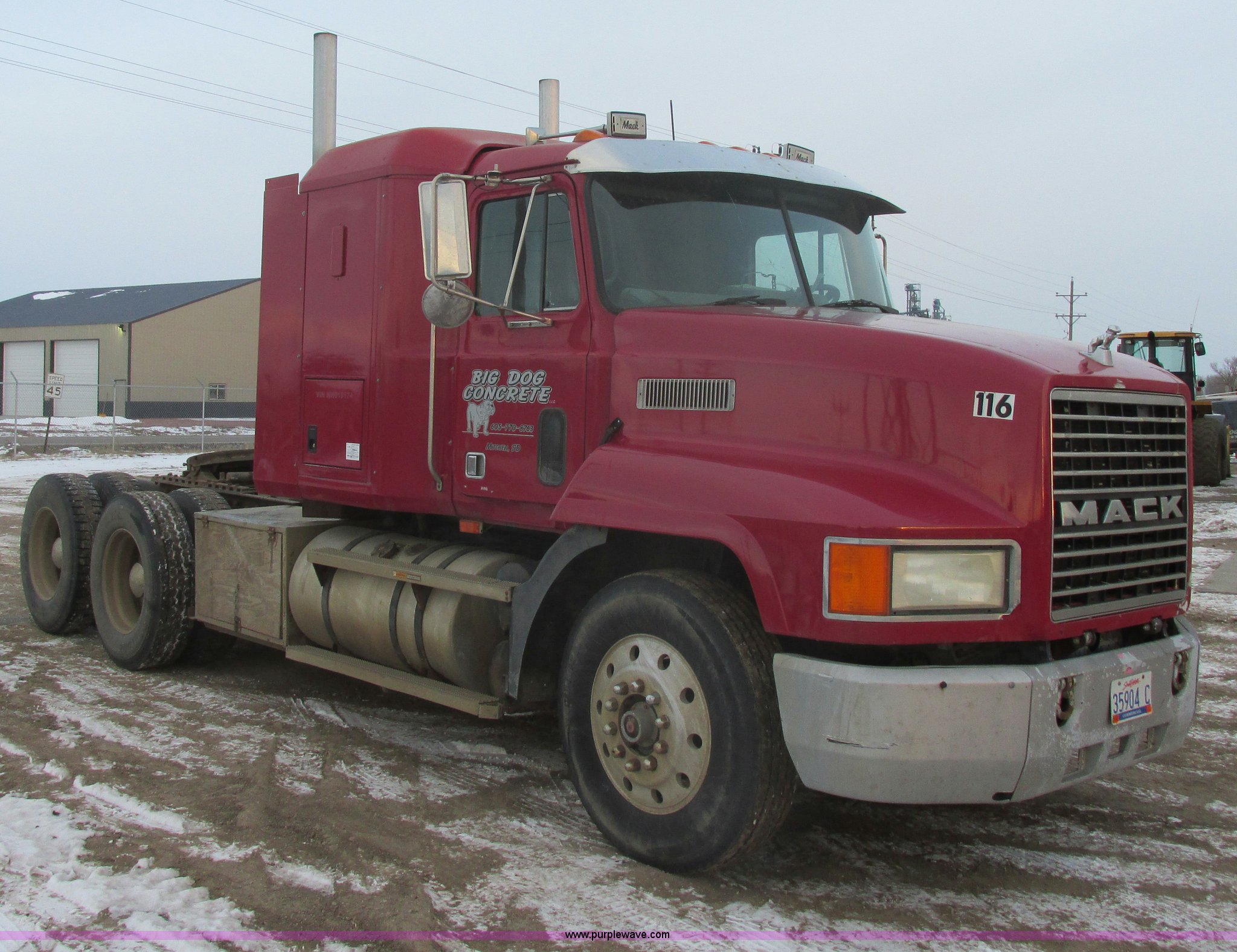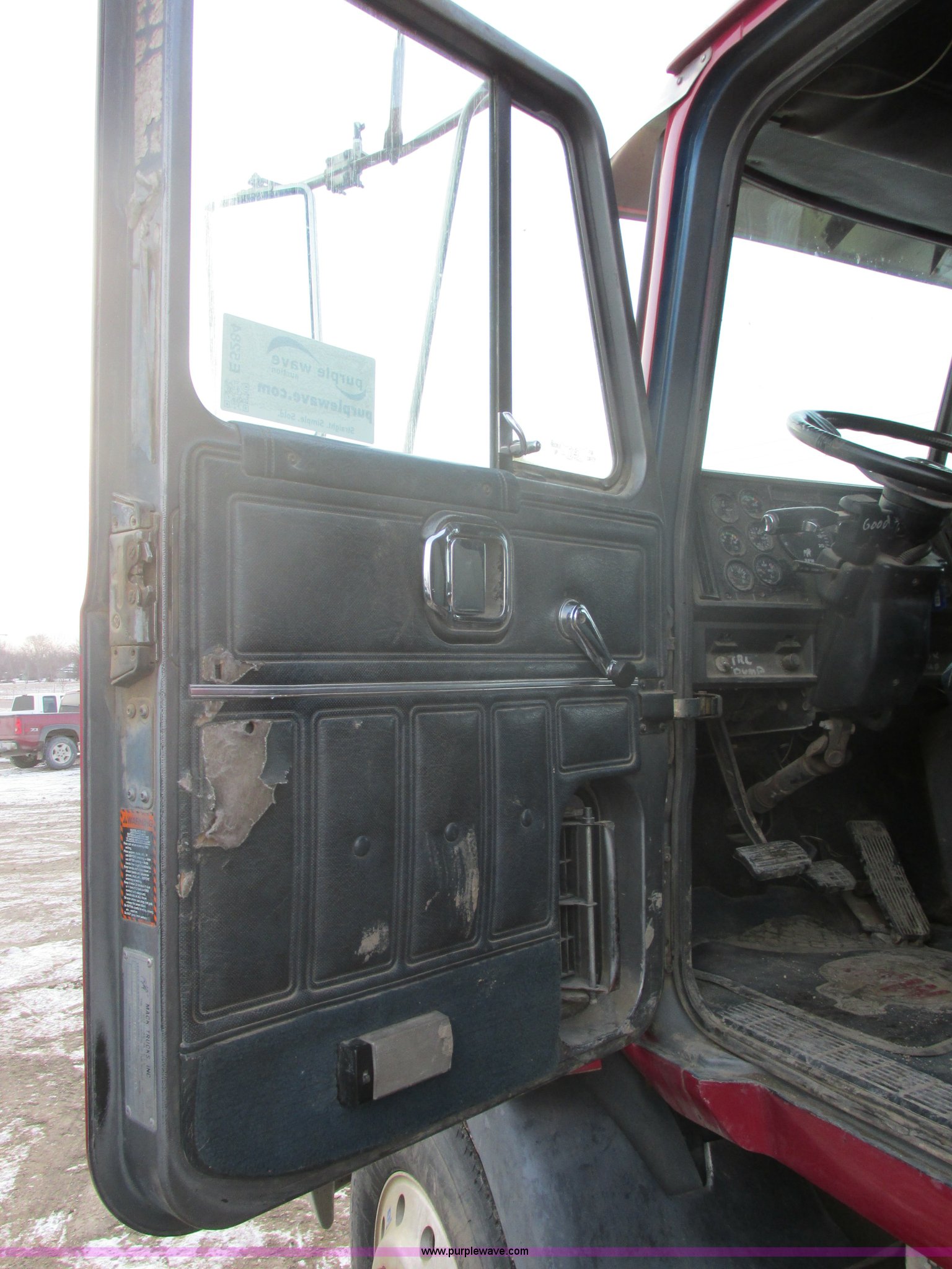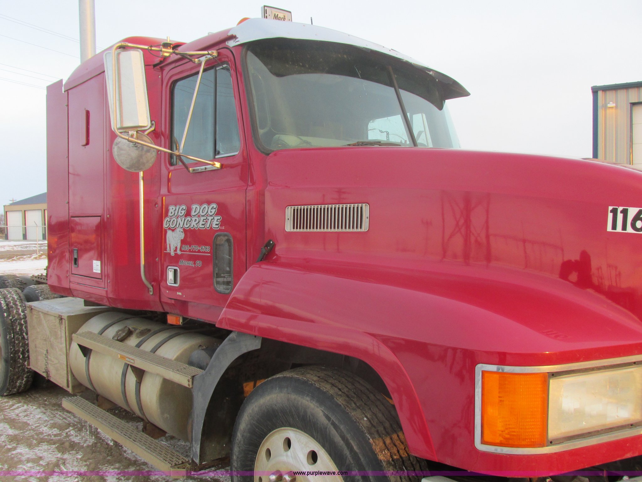 Purple Wave is selling a used Truck Tractor in South Dakota. This item is a 1992 Mack CH613 semi truck with the following: 949,820 miles on odometer, 24,807 hours on meter, Mack E7 12.0L L6 diesel engine, 350 HP, Eaton Road Ranger nine speed manual transmission, AC and heat, Tilt, AM/FM/CD, Passenger daylight door, Bostrom 915 air suspension seat, 36" sleeper, Storage, (2) toolboxes, 24" x 24" x 42", Steps, Visor, Block heater, Air slide fifth wheel, Dual 120 gallon fuel tanks, Dual exhaust stacks, Steel deck plate, Air suspension, Air brakes, Jake brake, Nut wheel covers, 208" wheelbase, 11R24.5 tires, GVWR 52,000 lbs, FAWR 12,000 lbs, IAWR 20,000 lbs, RAWR 20,000 lbs, Interior/exterior cosmetic damage, Passenger door does not seal tight, Passenger mirror broken, Seats ripped, Fenders missing, DOT certified in Feb. 2014