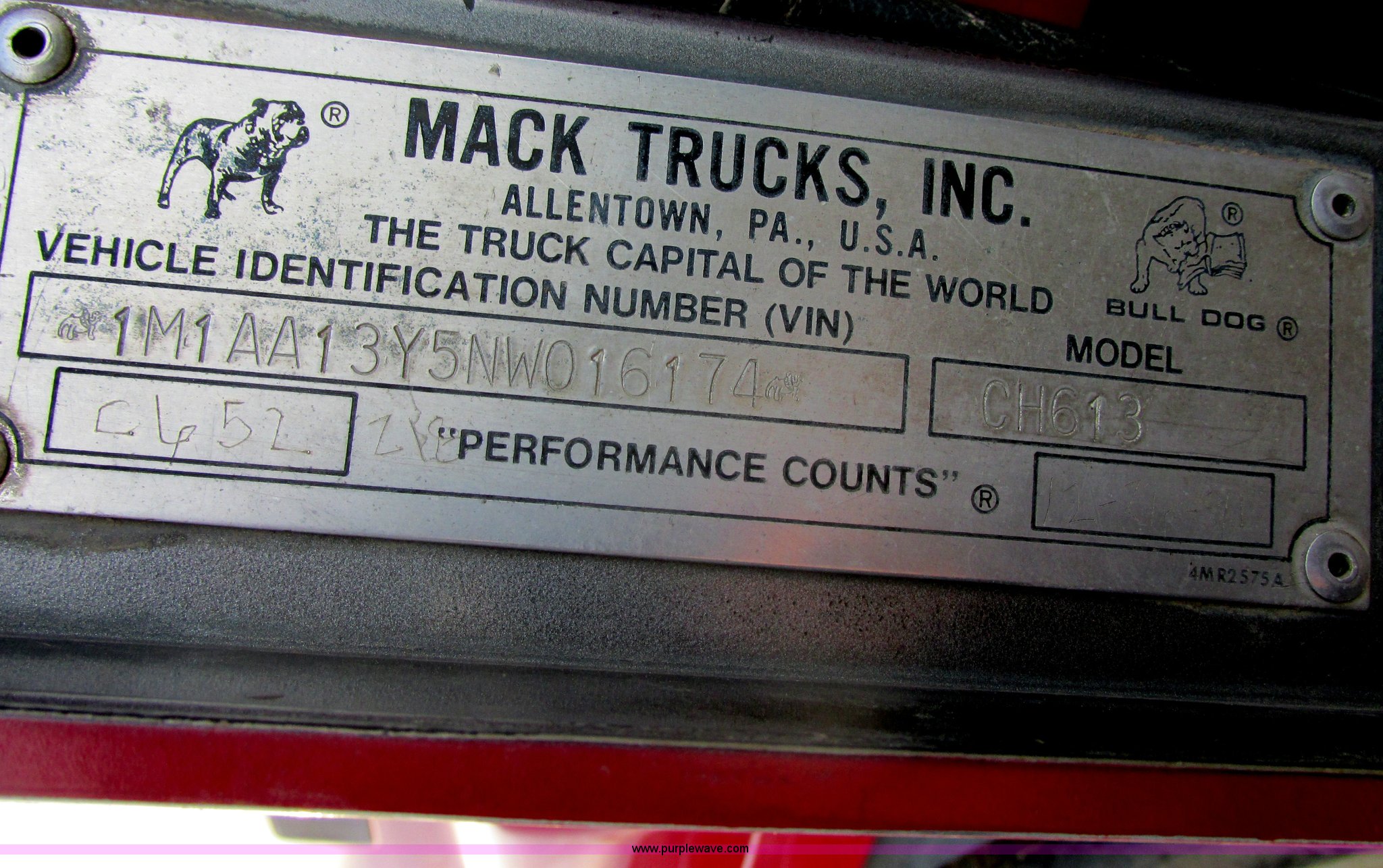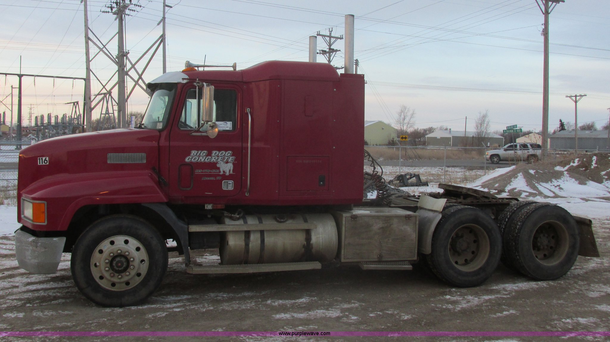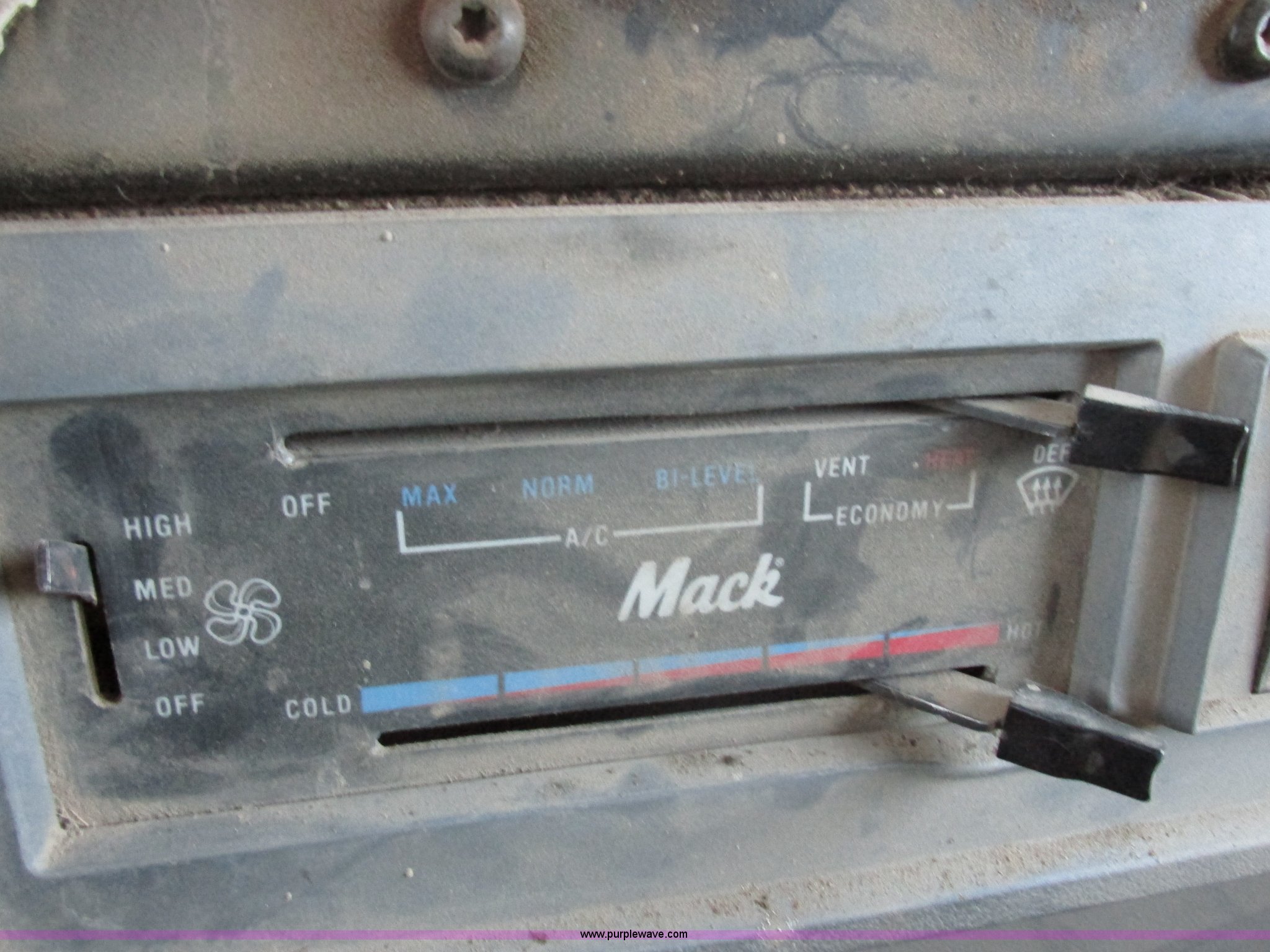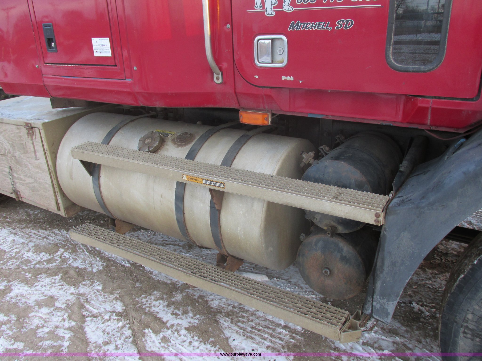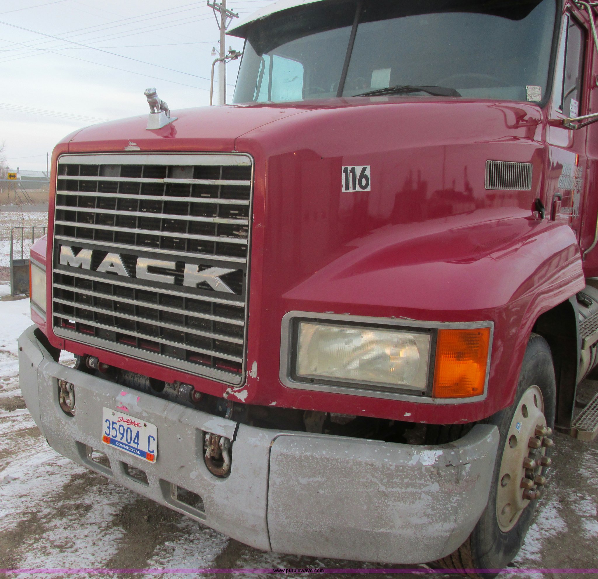 Purple Wave is selling a used Truck Tractor in South Dakota. This item is a 1992 Mack CH613 semi truck with the following: 949,820 miles on odometer, 24,807 hours on meter, Mack E7 12.0L L6 diesel engine, 350 HP, Eaton Road Ranger nine speed manual transmission, AC and heat, Tilt, AM/FM/CD, Passenger daylight door, Bostrom 915 air suspension seat, 36" sleeper, Storage, (2) toolboxes, 24" x 24" x 42", Steps, Visor, Block heater, Air slide fifth wheel, Dual 120 gallon fuel tanks, Dual exhaust stacks, Steel deck plate, Air suspension, Air brakes, Jake brake, Nut wheel covers, 208" wheelbase, 11R24.5 tires, GVWR 52,000 lbs, FAWR 12,000 lbs, IAWR 20,000 lbs, RAWR 20,000 lbs, Interior/exterior cosmetic damage, Passenger door does not seal tight, Passenger mirror broken, Seats ripped, Fenders missing, DOT certified in Feb. 2014
