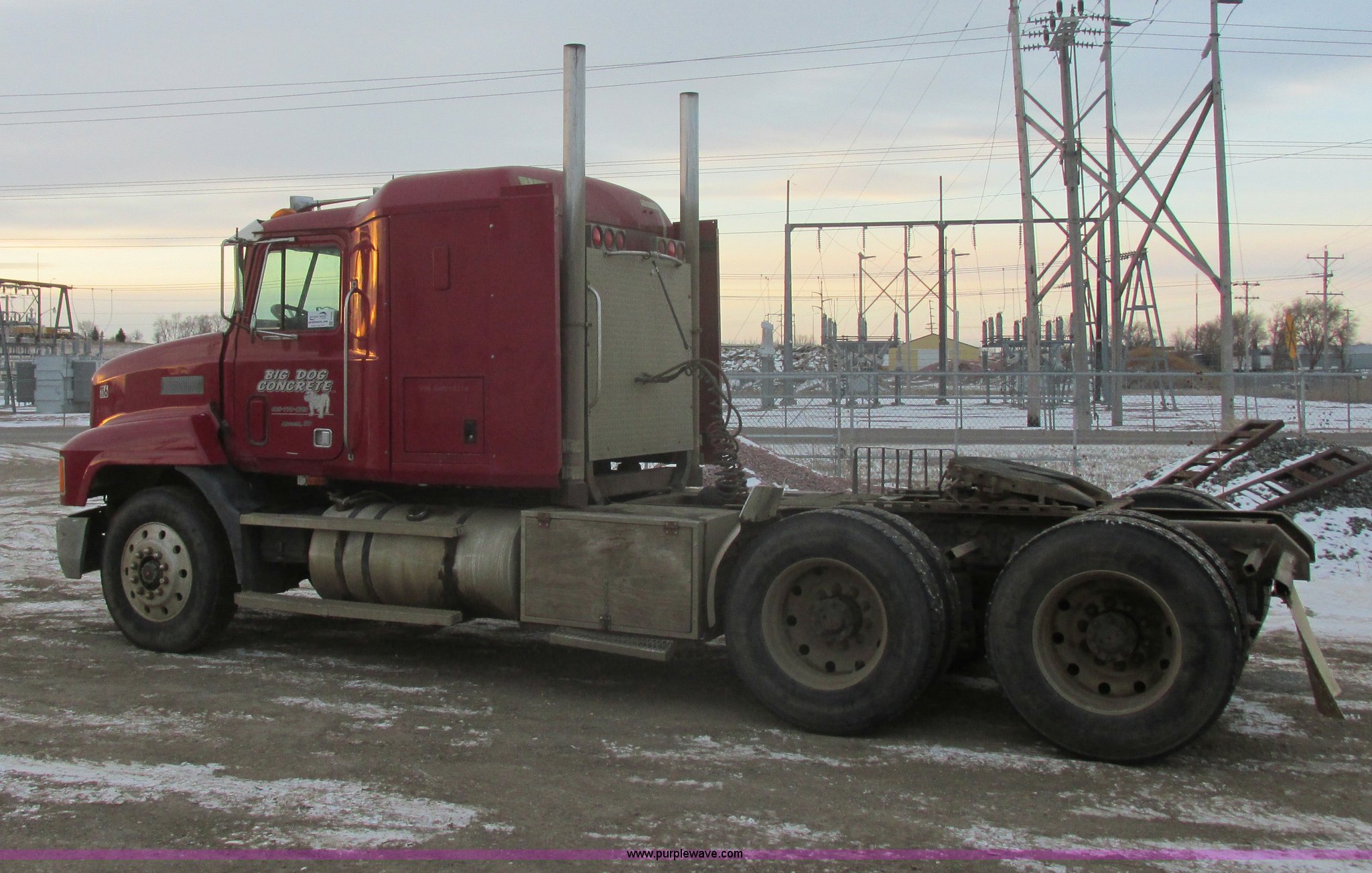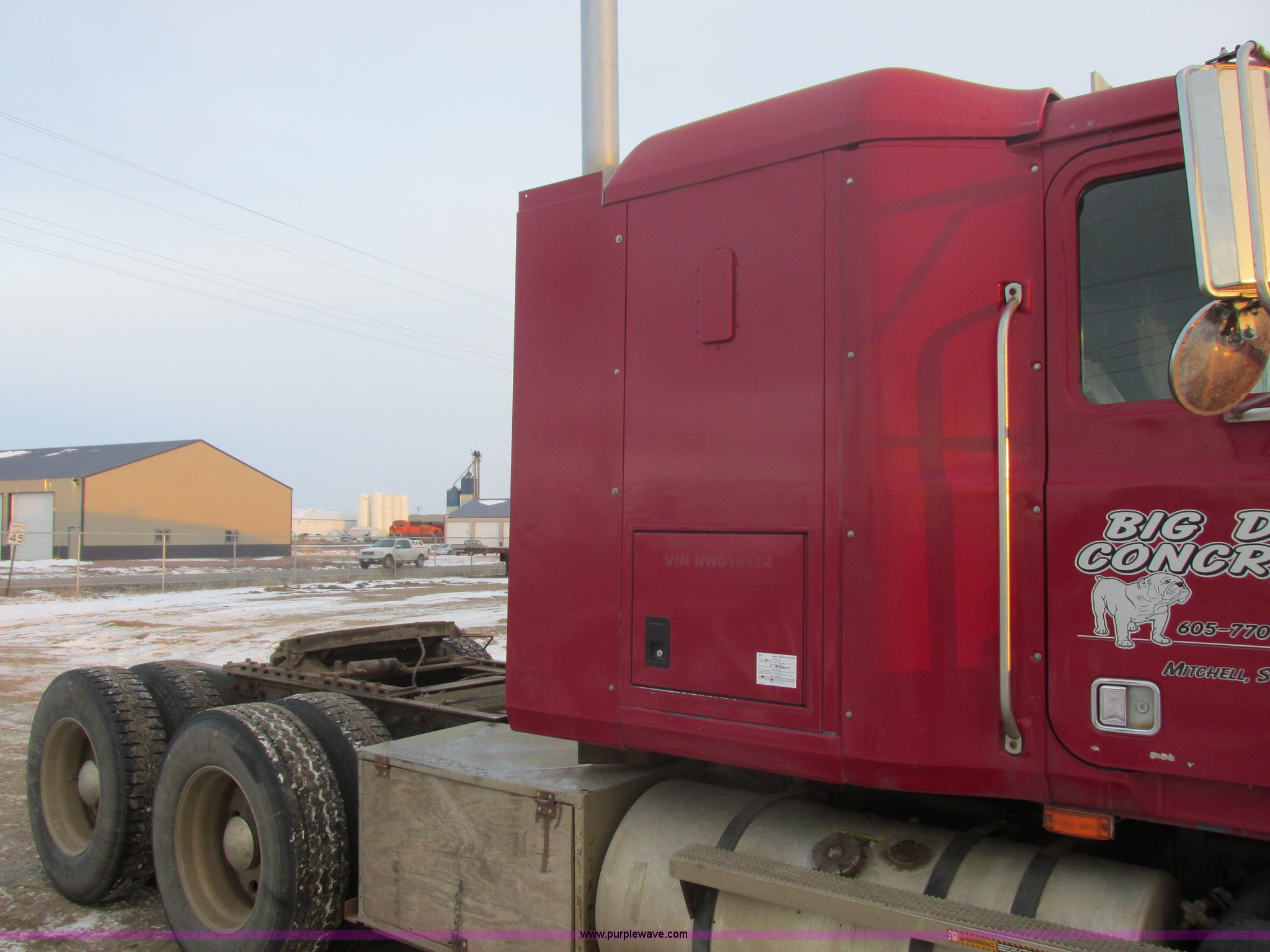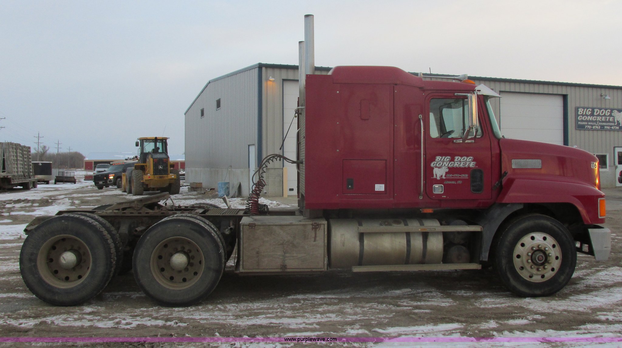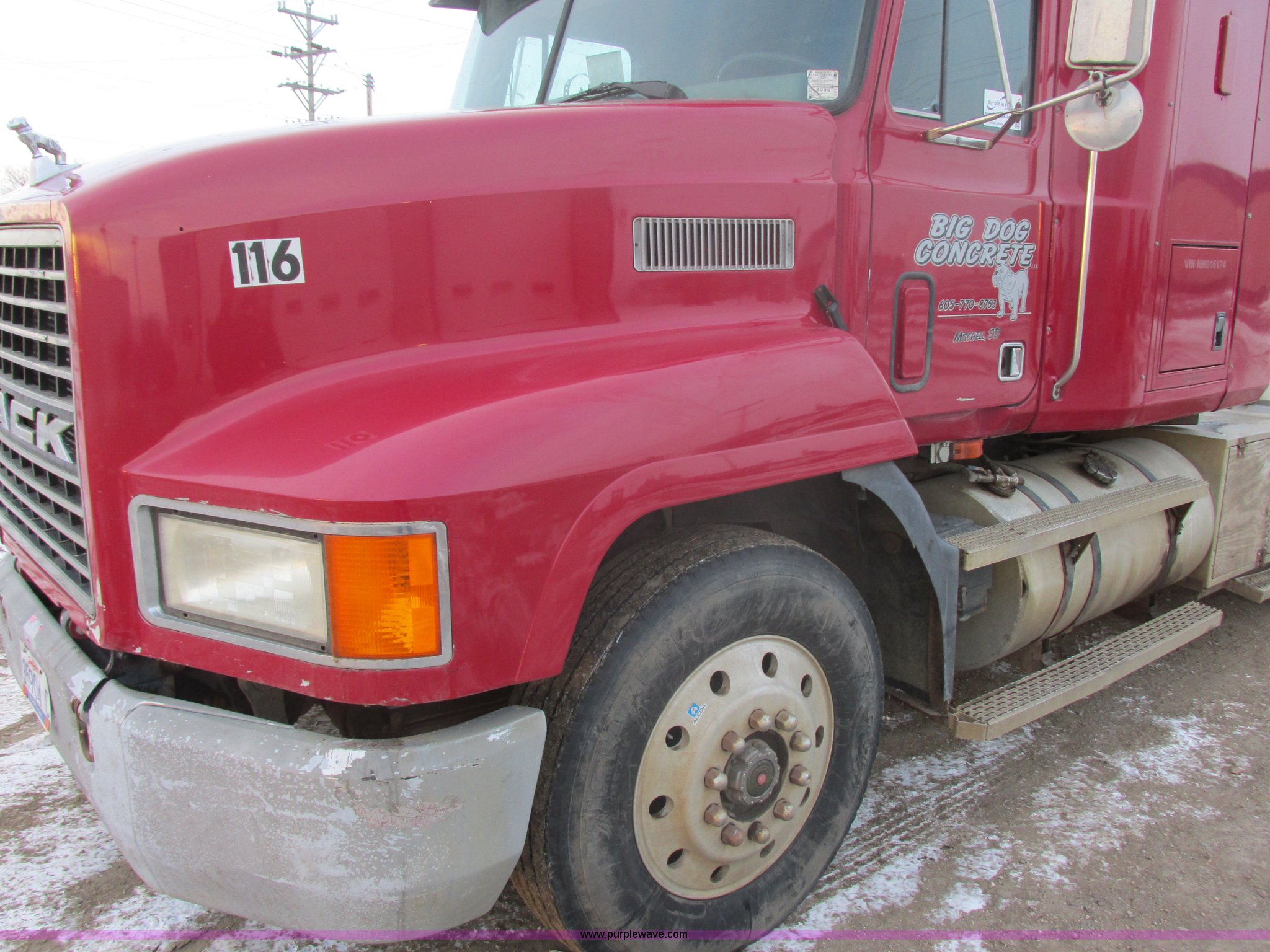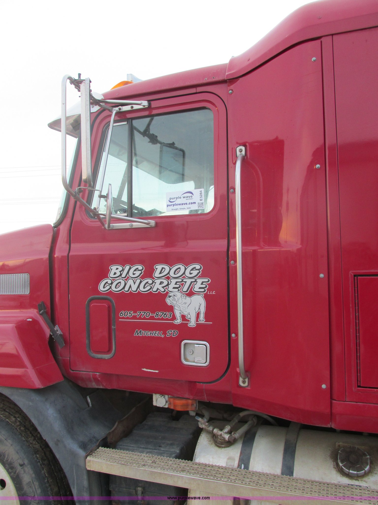 1992 Mack CH613 semi truck. 949,820 miles on odometer, 24,807 hours on meter, Mack E7 12.0L L6 diesel engine 350 HP, Eaton Road Ranger nine speed manual transmission, AC and heat, Tilt, AM/FM/CD, Passenger daylight door, Bostrom 915 air suspension seat, 36" sleeper Storage, (2) toolboxes 24" x 24" x 42", Steps, Visor, Block heater, Air slide fifth wheel, Dual 120 gallon fuel tanks, Dual exhaust stacks, Steel deck plate, Air suspension, Air brakes, Jake brake, Nut wheel covers, 208" wheelbase, 11R24.5 tires, GVWR 52,000 lbs, FAWR 12,000 lbs, IAWR 20,000 lbs, RAWR 20,000 lbs, Interior/exterior cosmetic damage, Passenger door does not seal tight, Passenger mirror broken, Seats ripped, Fenders missing, DOT certified in Feb. 2014. 1M1AA13Y5NW016174. View equipment video. Big Dog Concrete. 1660 E 8th Ave. Mitchell, SD 57301