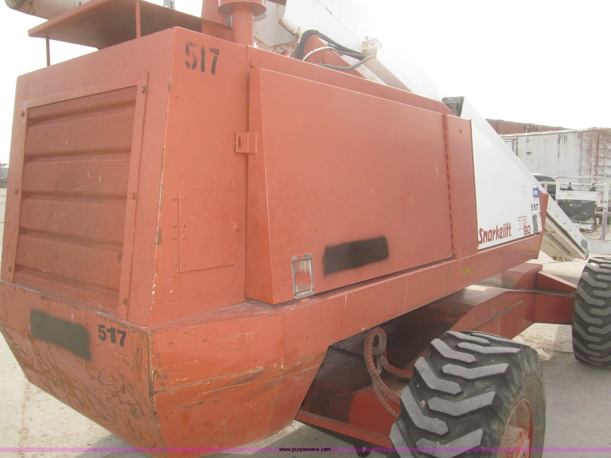 Purple Wave is selling a used Boom Lift in Nebraska. This item is a Snorkelift TB A60R boom lift with the following: 6,071 hours on meter, Wisconsin V465D four cylinder gas engine, Hydrostatic transmission, Four wheel drive, 60' maximum platform height, 66' maximum working height, 45' maximum reach, 600 lbs maximum lift capacity, (3) boom sections, 94"W x 30"D x 44"H I.D. basket dimensions, Ground and platform controls, Rotating turret and basket, 2,000 watt on-board generator, Continuous duty, Non-operational generator, 30'10"L x 95.5"W x 105"H stowed dimensions, Safety alarm, Magnetic oil pan heater, Firestone 15-19.5ML foam filled tires, 19,900 lbs. base operating weight, Rear turet leaks oil, Operator's manual, Serial 875450787, Unit# 517