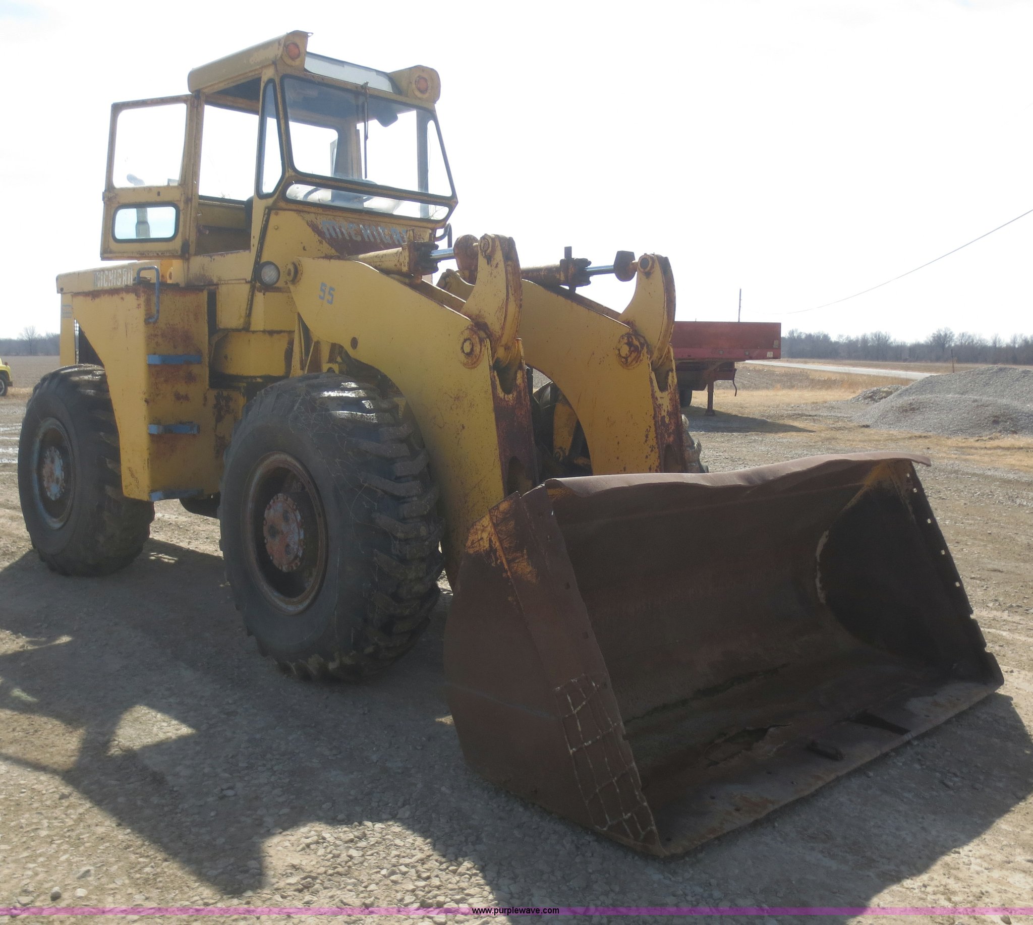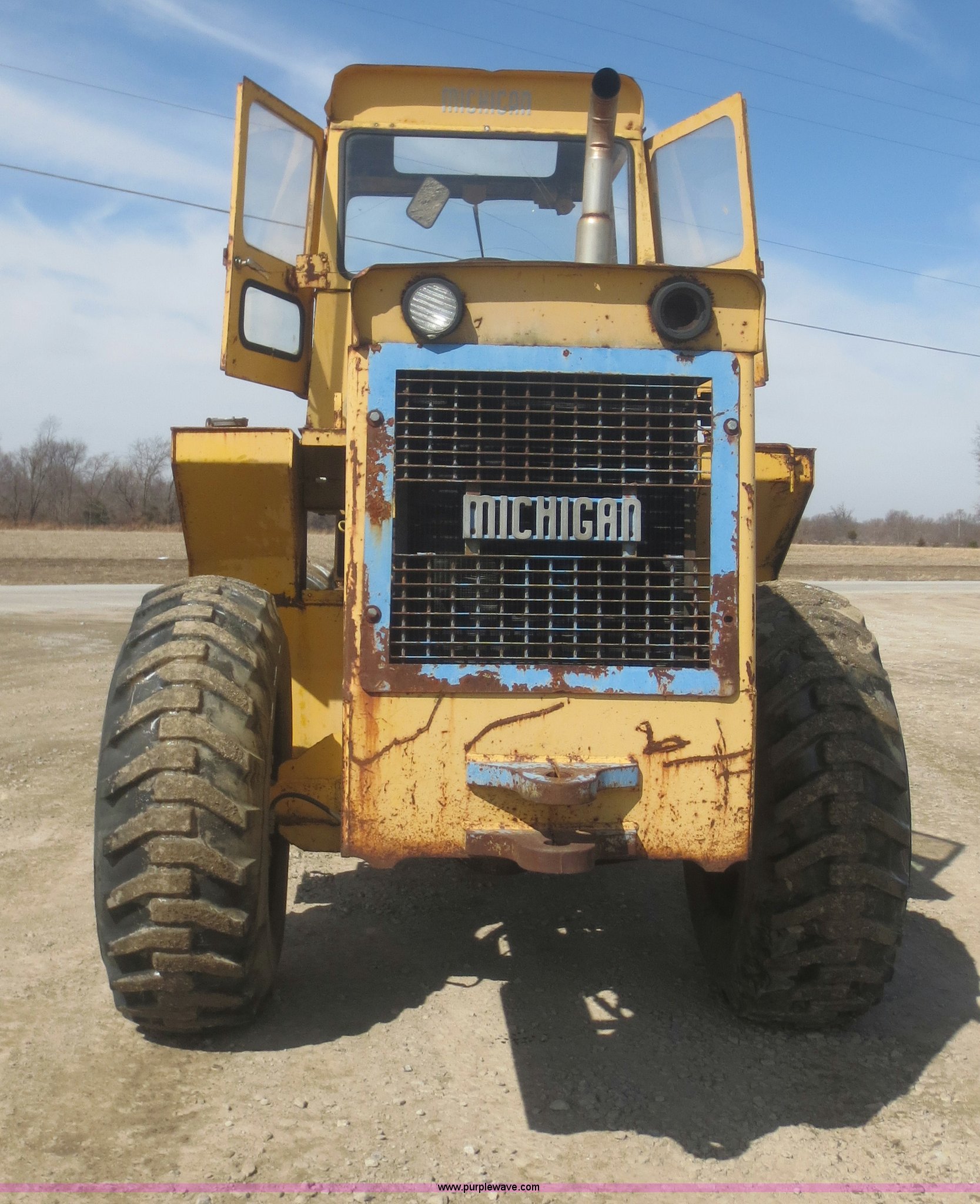 Purple Wave is selling a used Wheel Loader in Kansas. This item is a 1970 Michigan 55 wheel loader with the following: 9,924 hours on meter, Detroit Diesel 471 two stoke four cylinder diesel engine, Three speed shuttle shift transmission, Four wheel drive, GP 8'W bucket, 17.5-25 tires, 19,630 lbs. base operating weight, Cracked rear glass, Serial 416A145