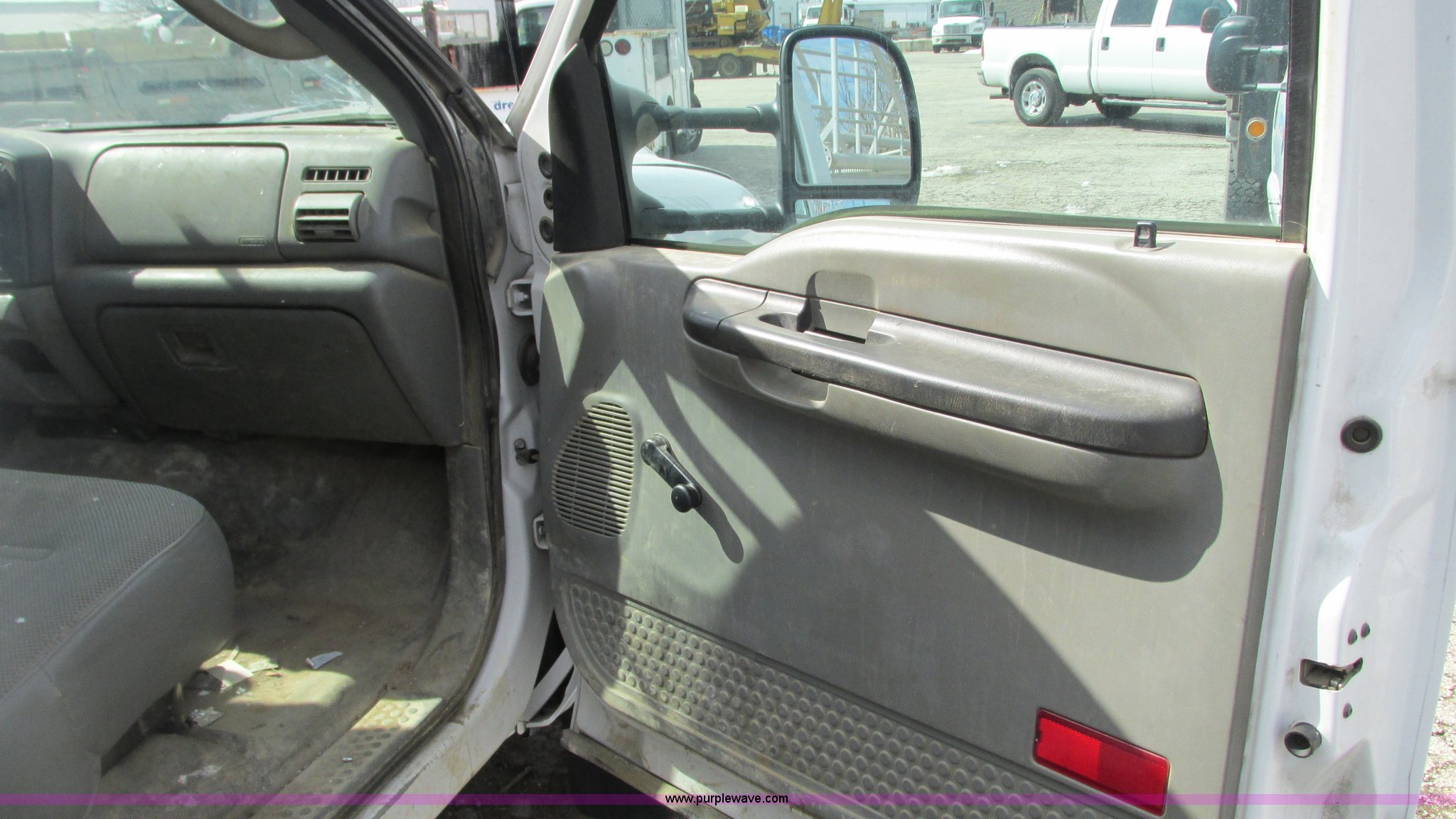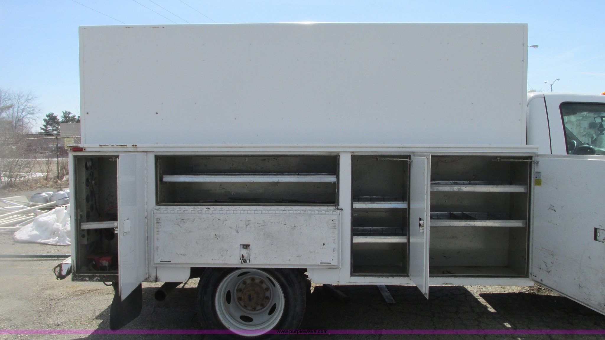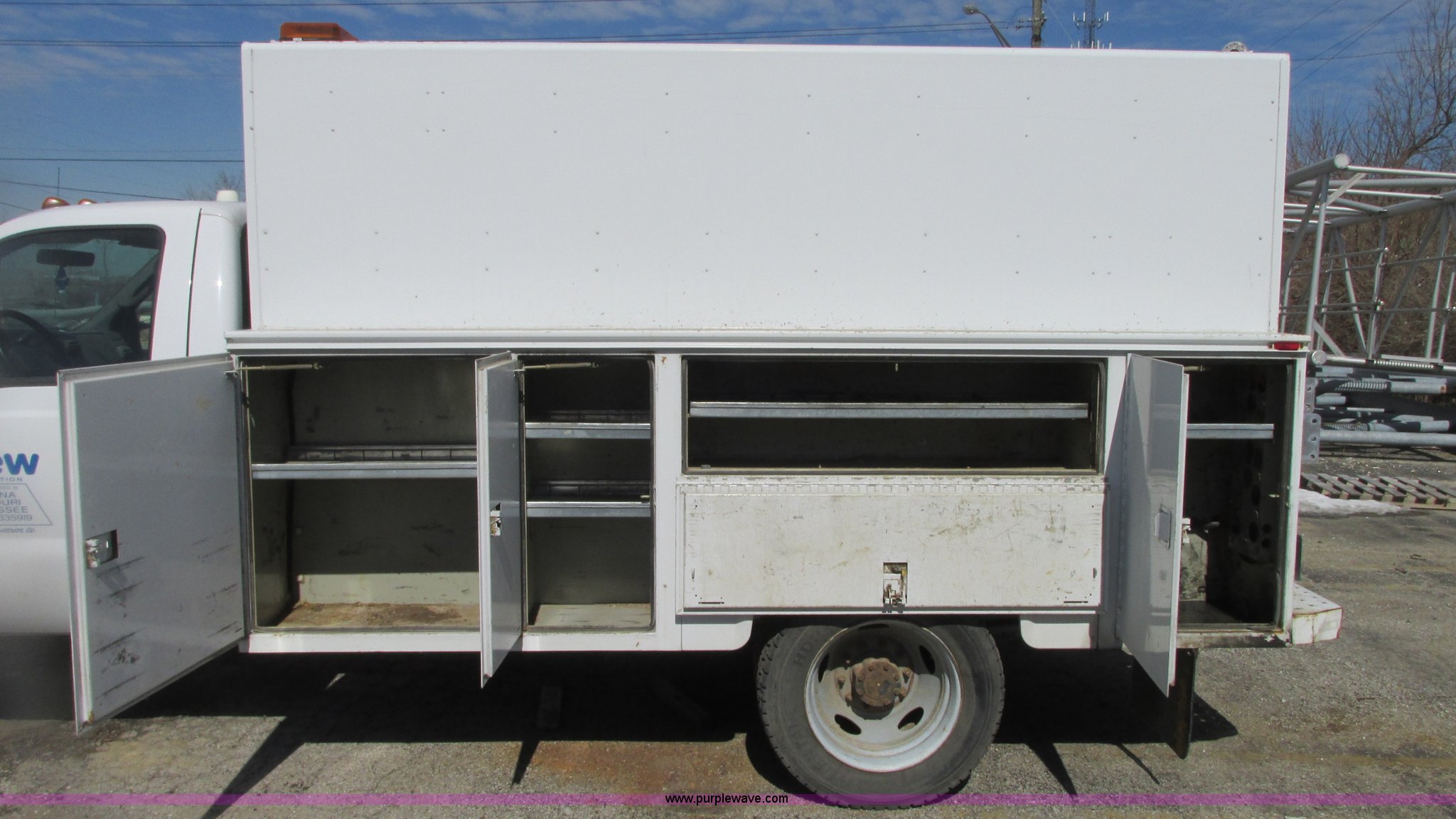 Purple Wave is selling a used Service Truck in Indiana. This item is a 2006 Ford F550 service truck with the following: 120,778 miles on odometer, 6.0L V8 OHV 32V turbo diesel engine, Unknown engine issues, Automatic transmission, Four wheel drive, AC and heat, Tilt, Cruise, AM/FM/CD, Manual windows and locks, Vinyl/cloth interior, Knapheide utility bed, 11'L x 54"W x 60"H, (8) compartments, Interior racks and bins, Heavy duty step bumper, Receiver hitch, Trailer wiring, 225/70R19.5 tires, Interior/exterior cosmetic damage, Possible clogged EGR valve, Batteries missing, Unit# 756