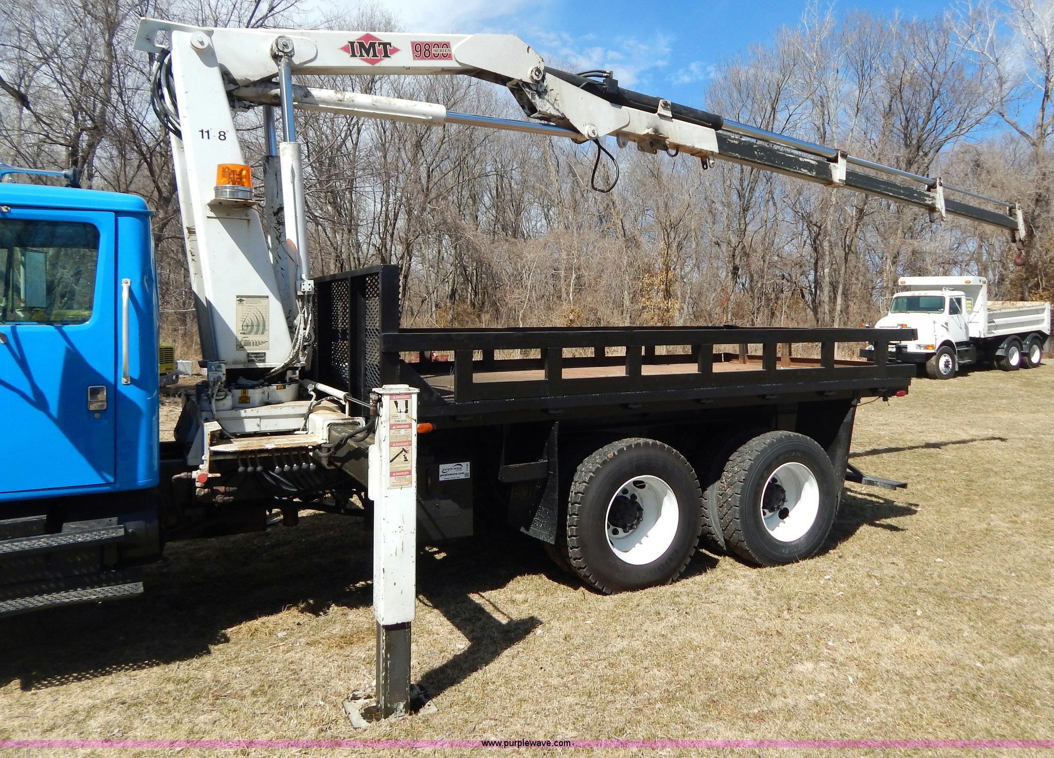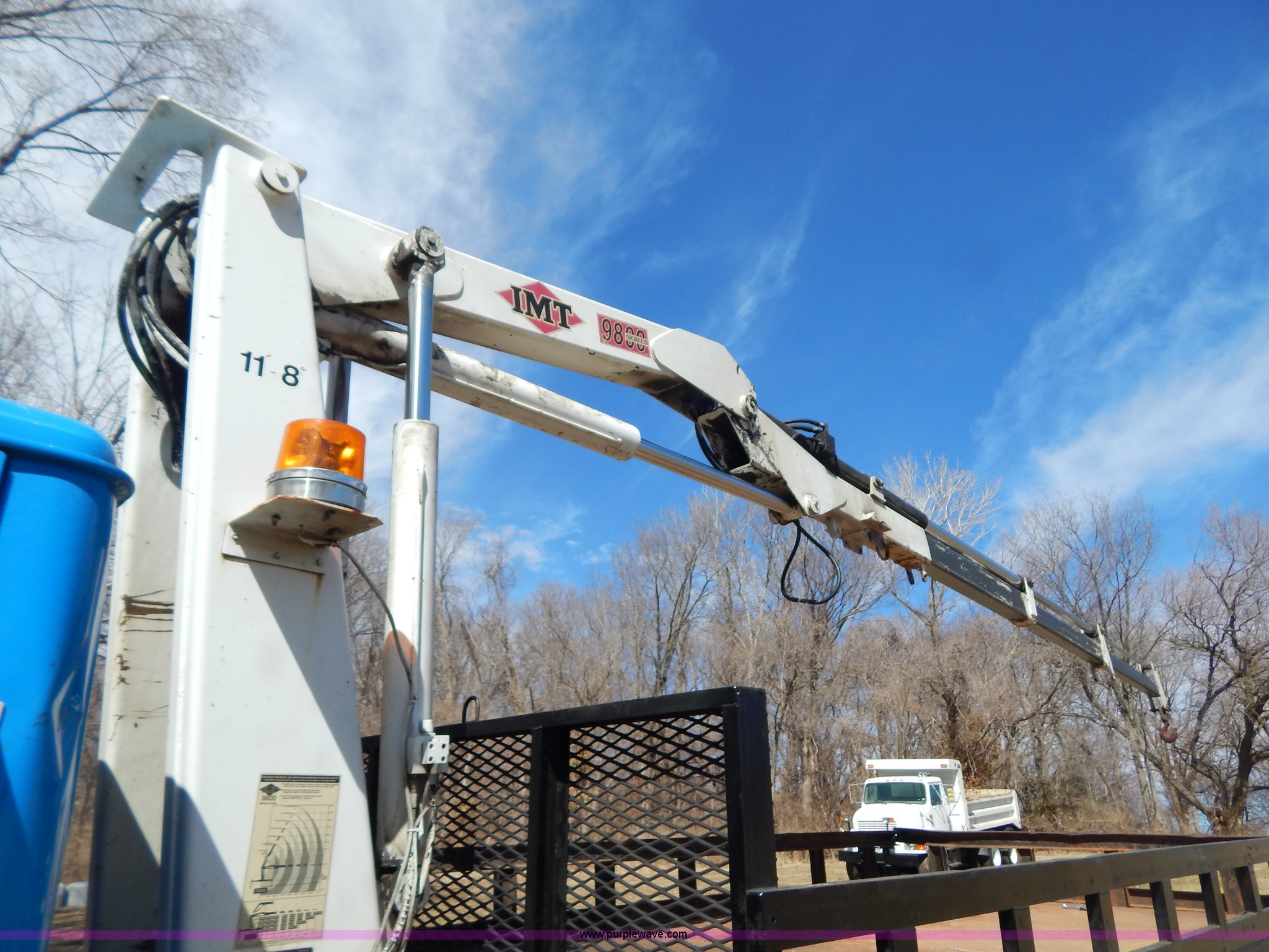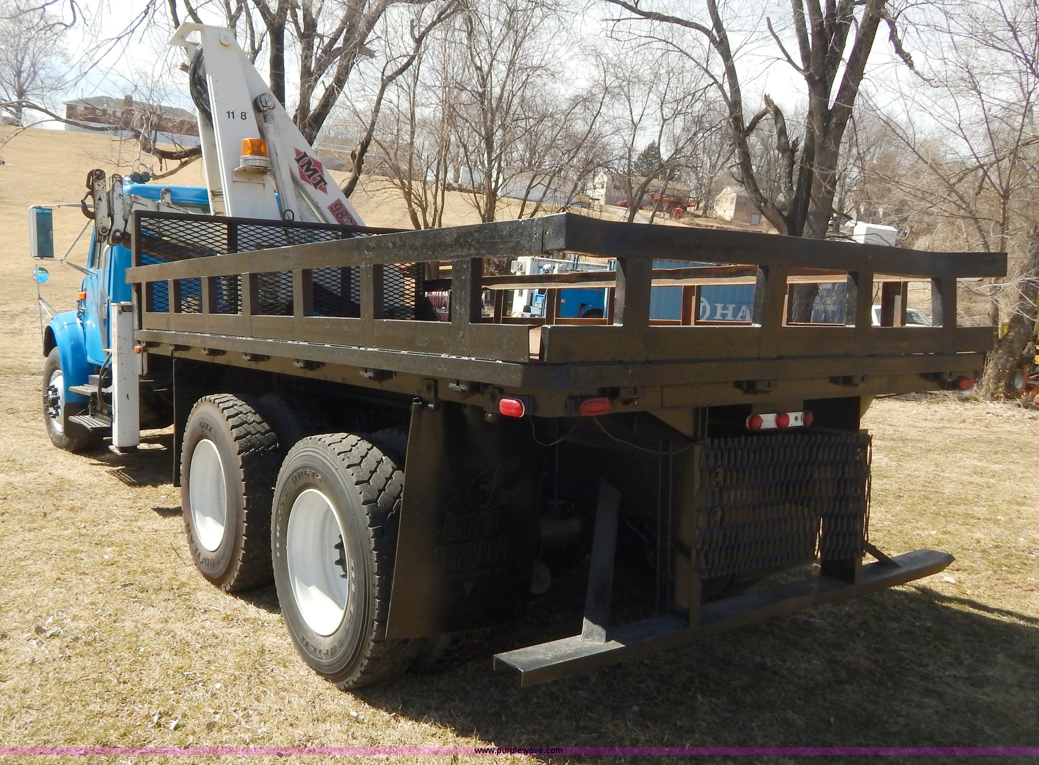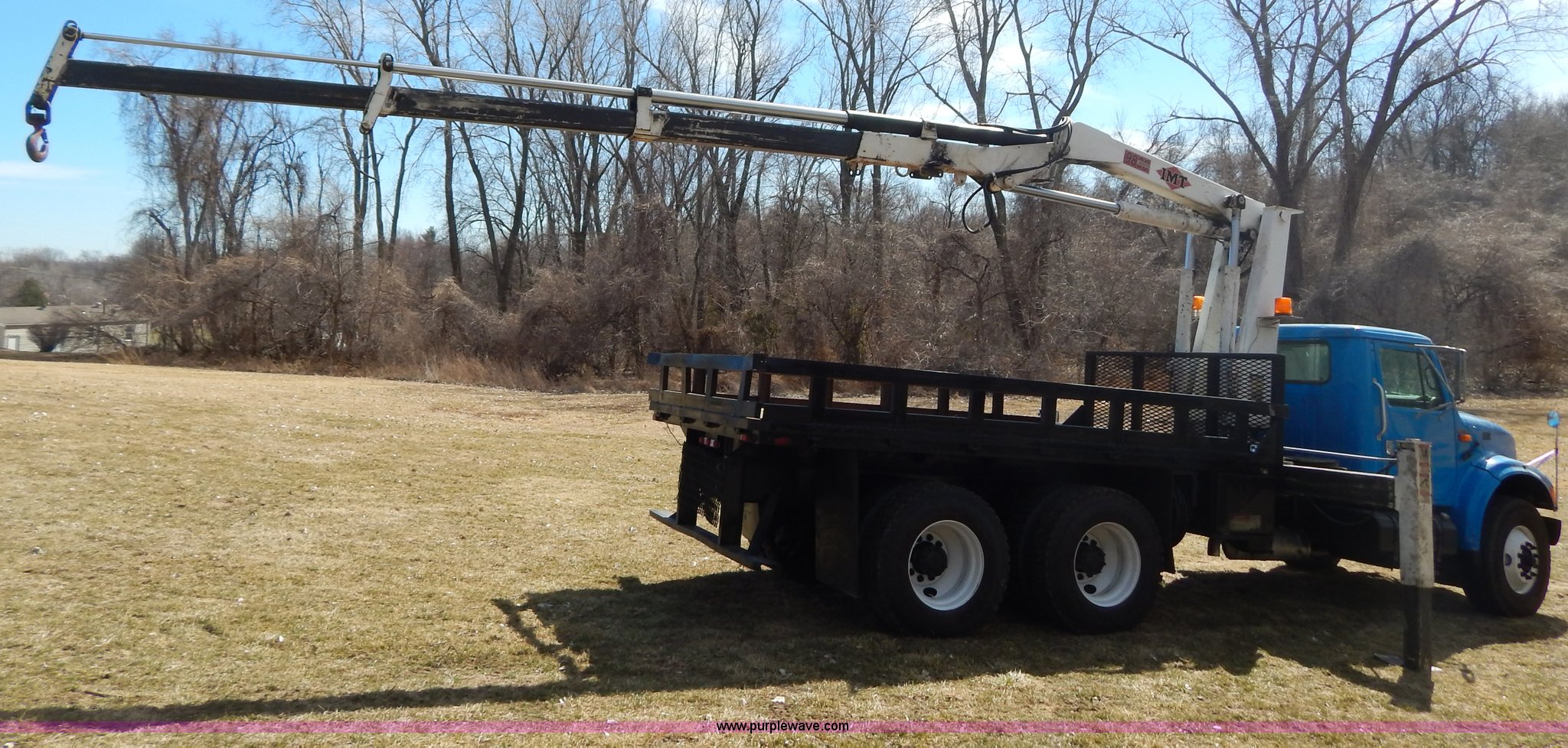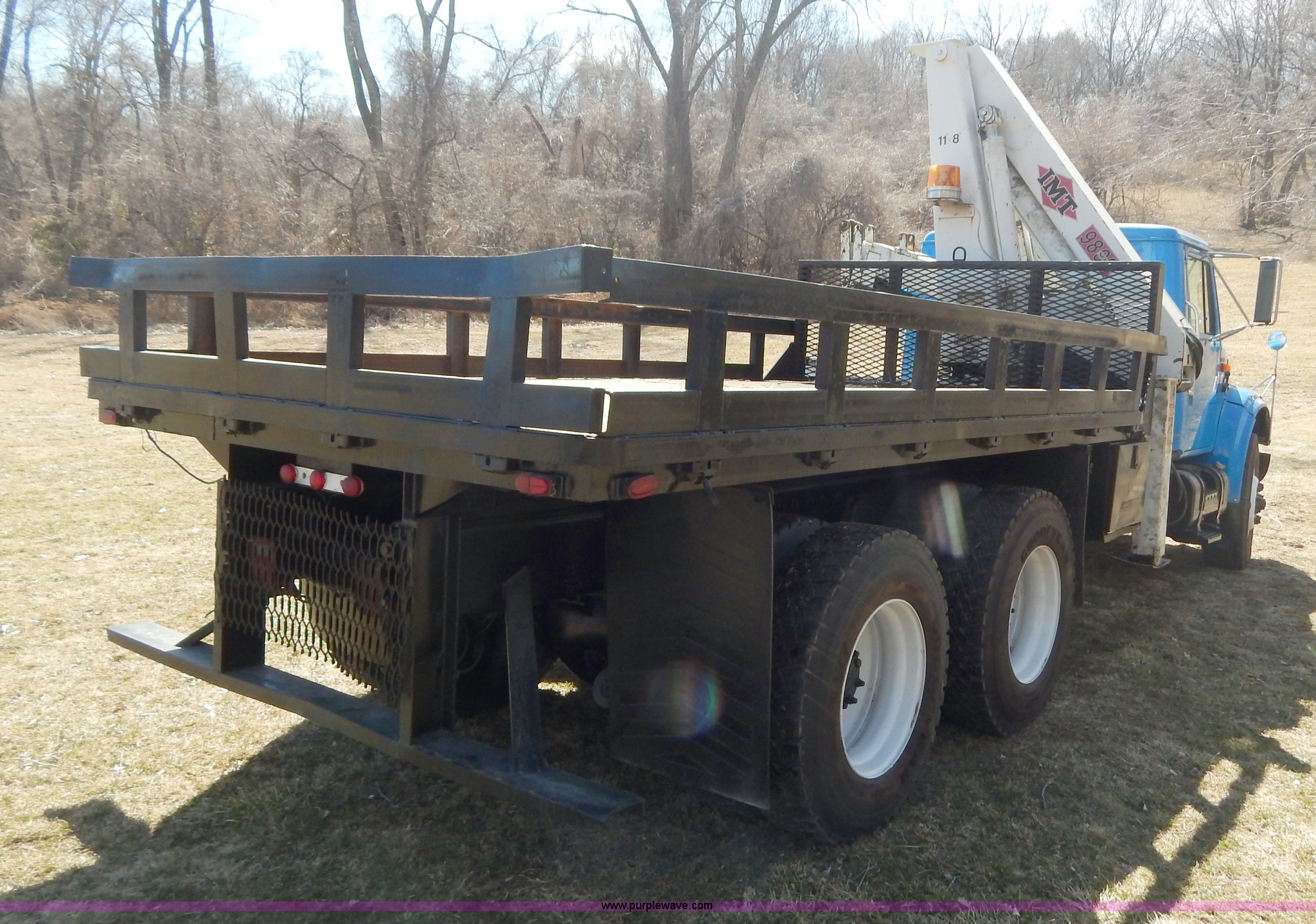 Purple Wave is selling a used Crane Truck in Missouri. This item is a 1996 International 4900 flatbed truck with crane with the following: 51,025 miles on odometer, 7,318 hours on meter, International DT530 8.7L L6 diesel engine, Allison automatic transmission, Heat, Air suspension seat, 15'L x 94"W flatbed, 16"H removable sideboards, IMT 9800 knuckle boom crane, 49'9" maximum height, Serial 1495951013, PTO, Air brakes, 315/80R22.5 front tires, 11R22.5 rear tires