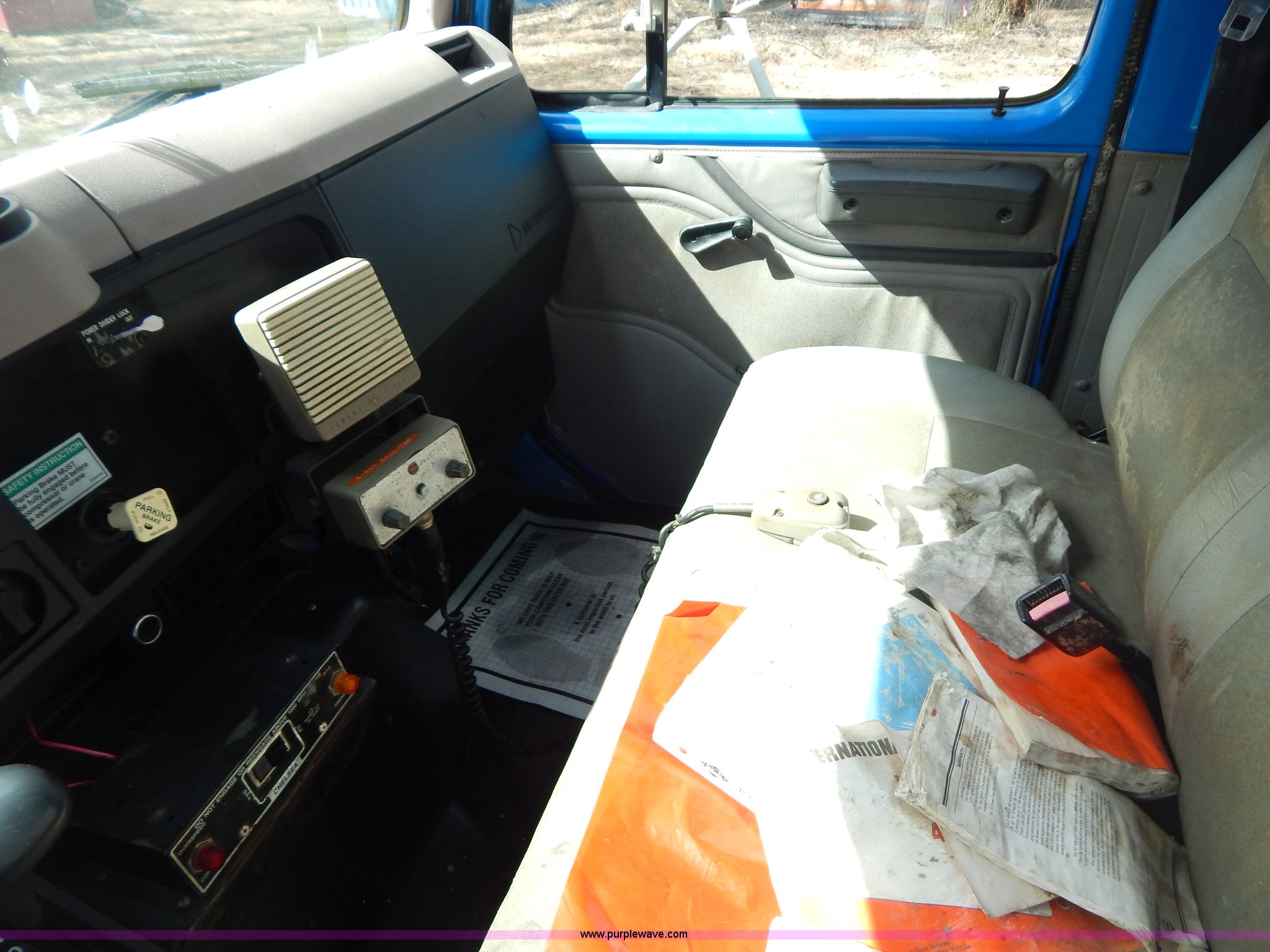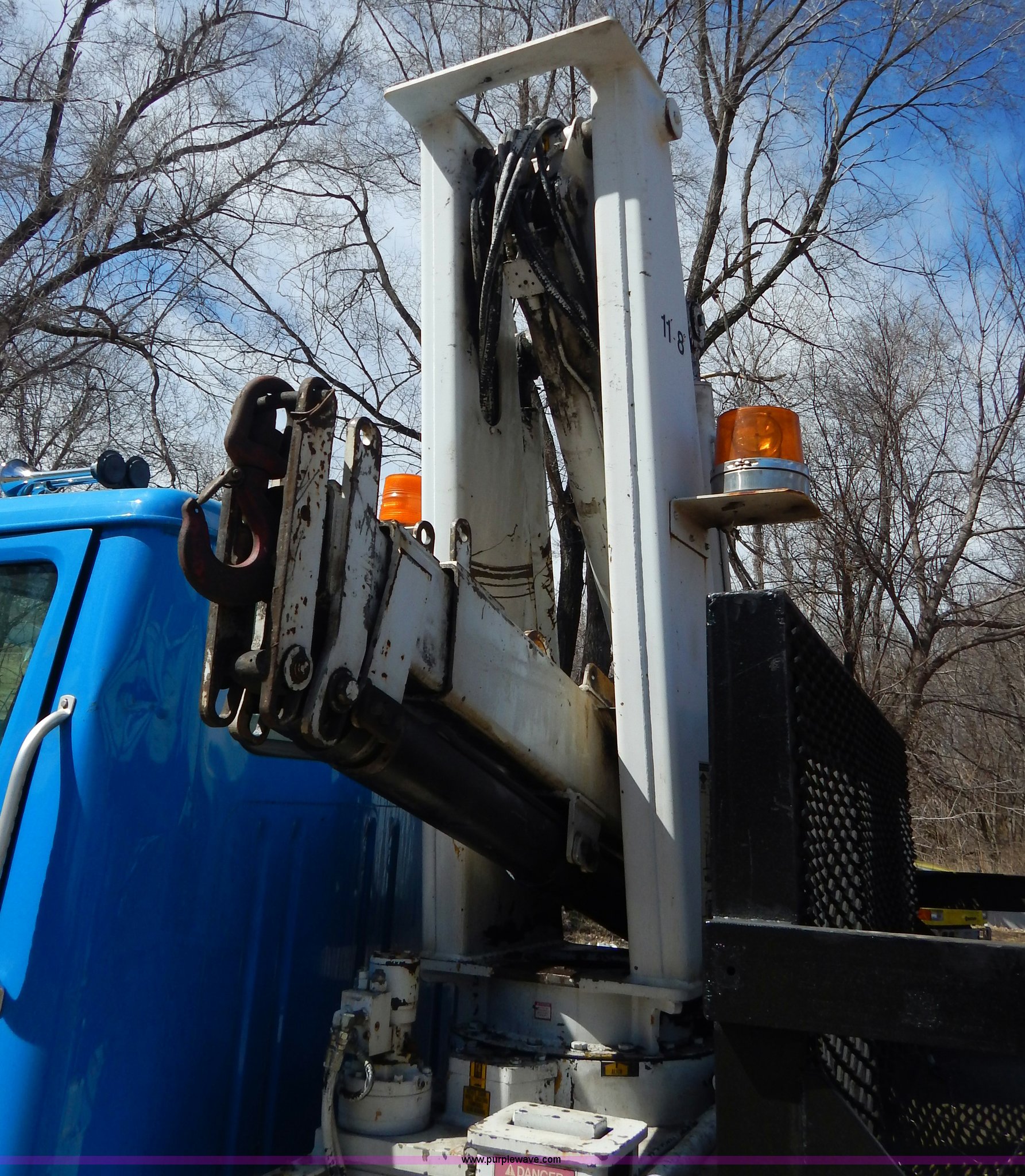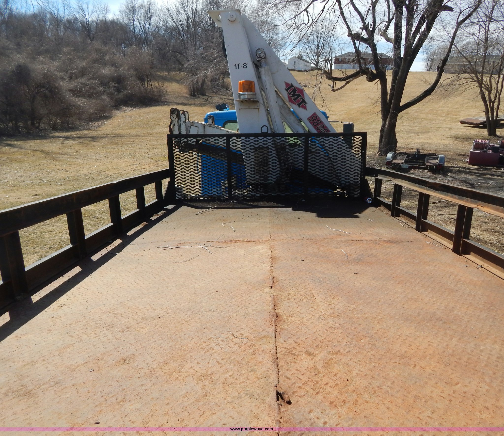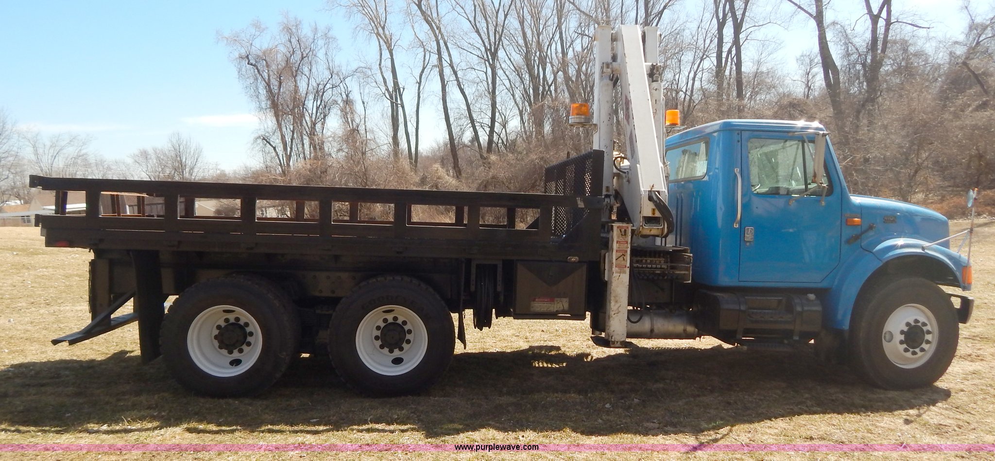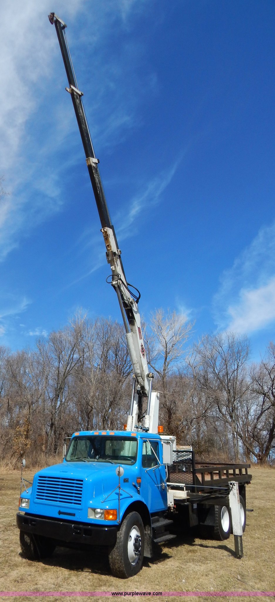 Purple Wave is selling a used Crane Truck in Missouri. This item is a 1996 International 4900 flatbed truck with crane with the following: 51,025 miles on odometer, 7,318 hours on meter, International DT530 8.7L L6 diesel engine, Allison automatic transmission, Heat, Air suspension seat, 15'L x 94"W flatbed, 16"H removable sideboards, IMT 9800 knuckle boom crane, 49'9" maximum height, Serial 1495951013, PTO, Air brakes, 315/80R22.5 front tires, 11R22.5 rear tires