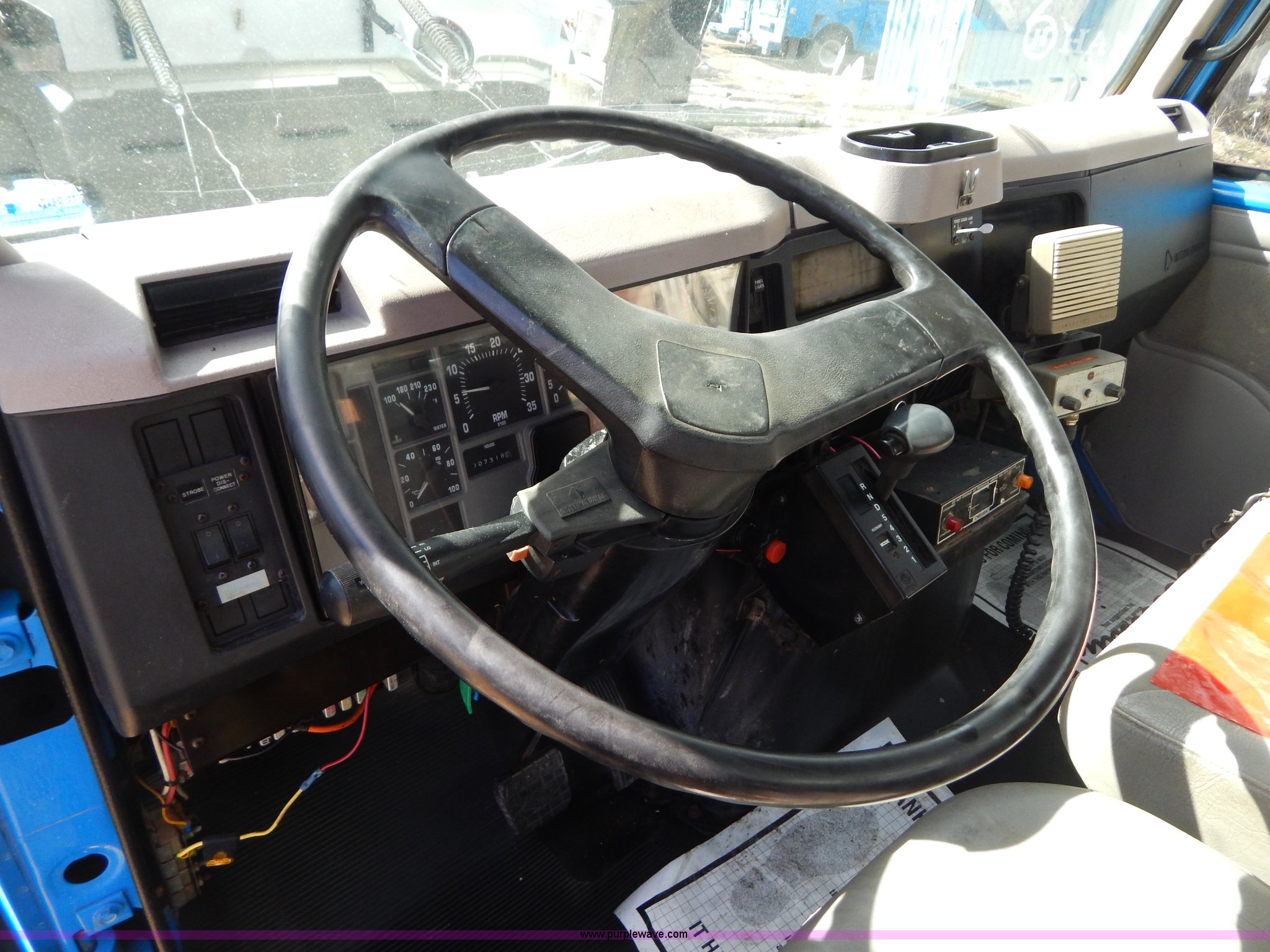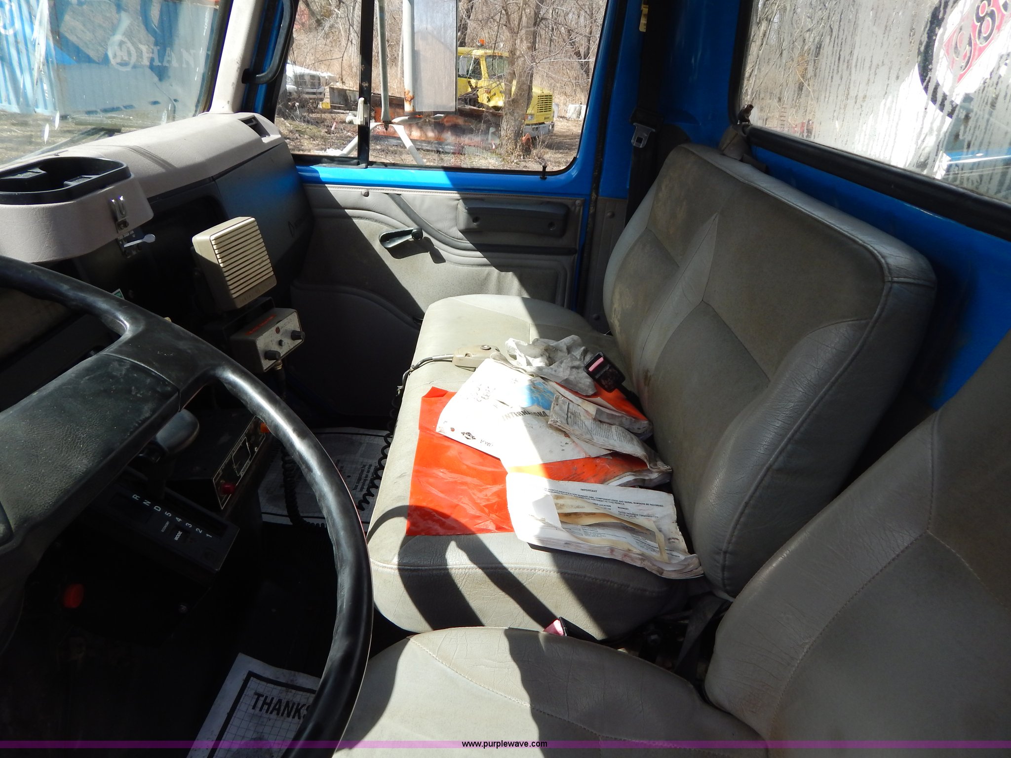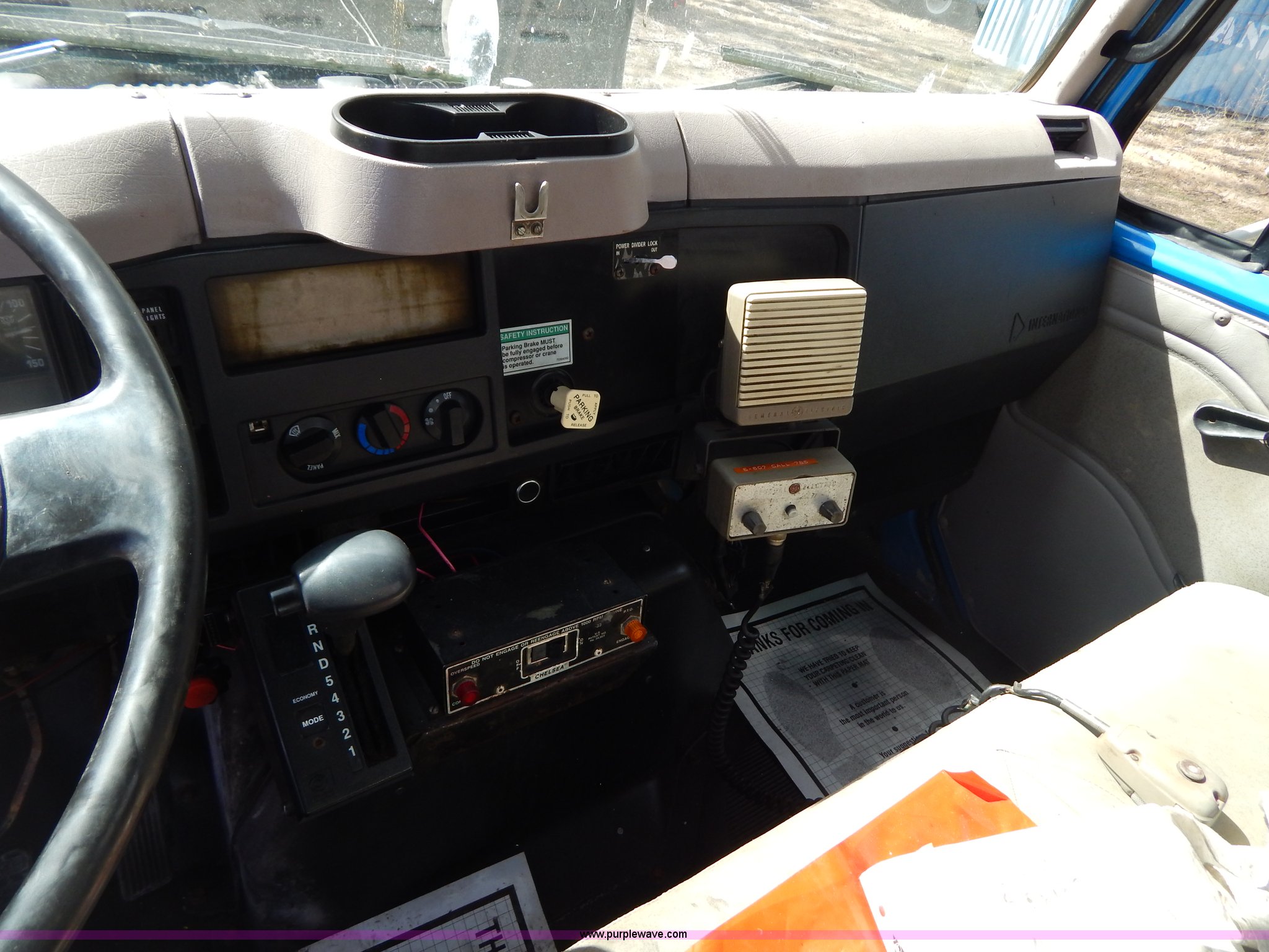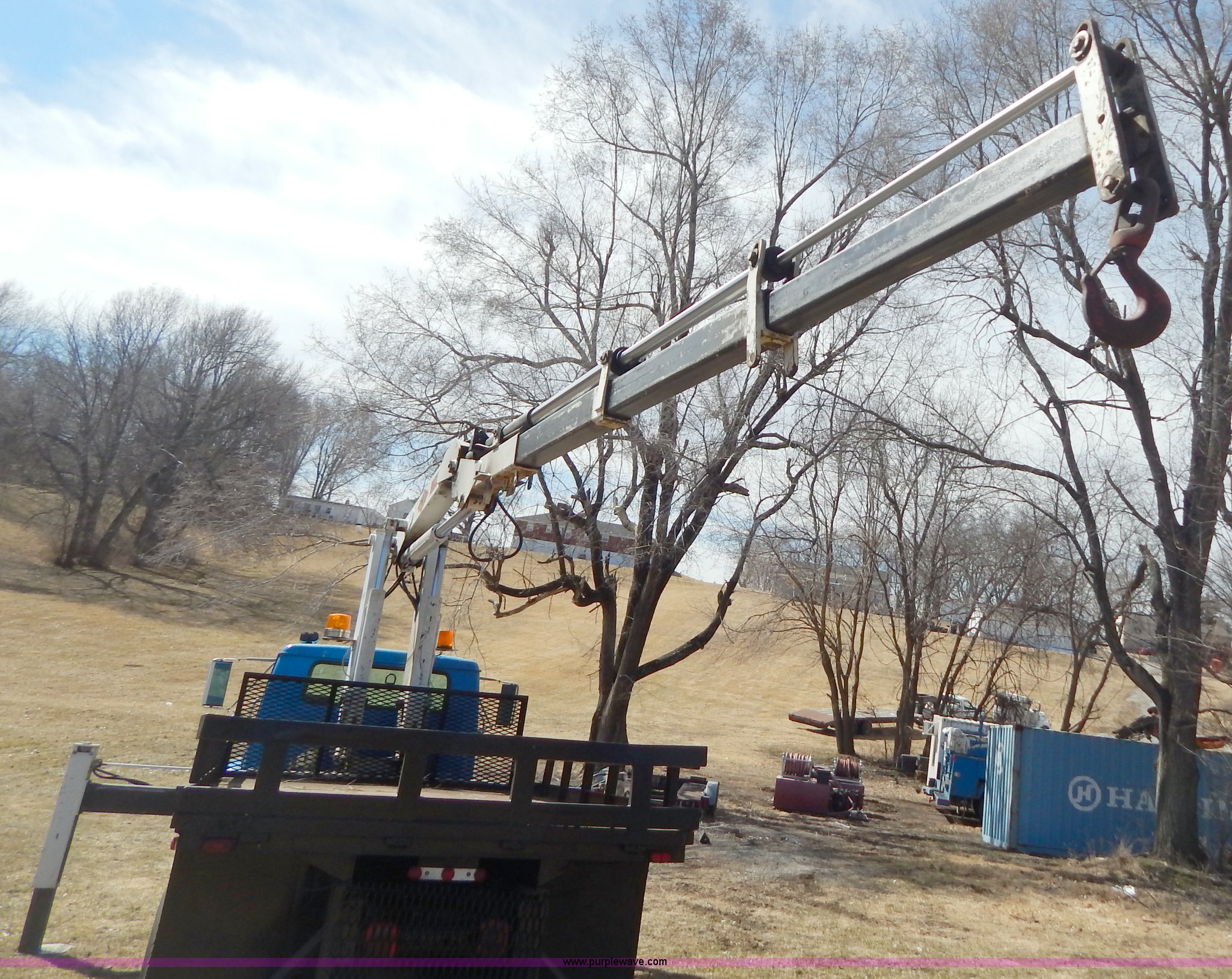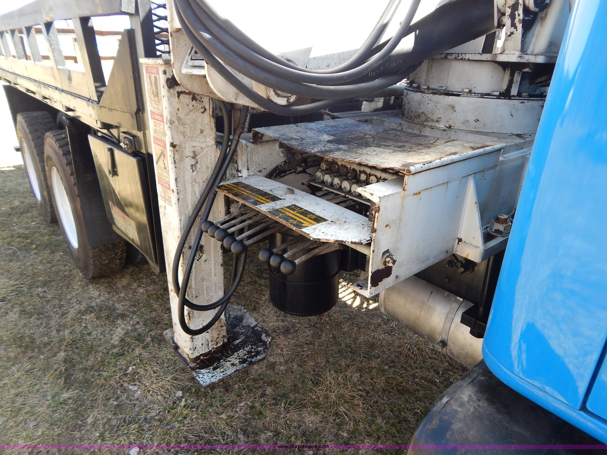 Purple Wave is selling a used Crane Truck in Missouri. This item is a 1996 International 4900 flatbed truck with crane with the following: 51,025 miles on odometer, 7,318 hours on meter, International DT530 8.7L L6 diesel engine, Allison automatic transmission, Heat, Air suspension seat, 15'L x 94"W flatbed, 16"H removable sideboards, IMT 9800 knuckle boom crane, 49'9" maximum height, Serial 1495951013, PTO, Air brakes, 315/80R22.5 front tires, 11R22.5 rear tires