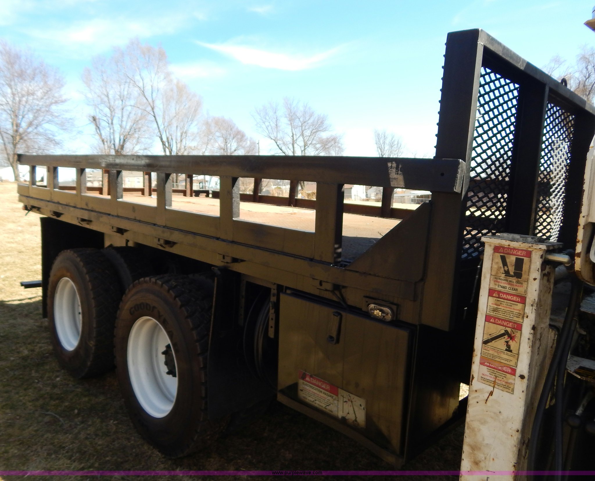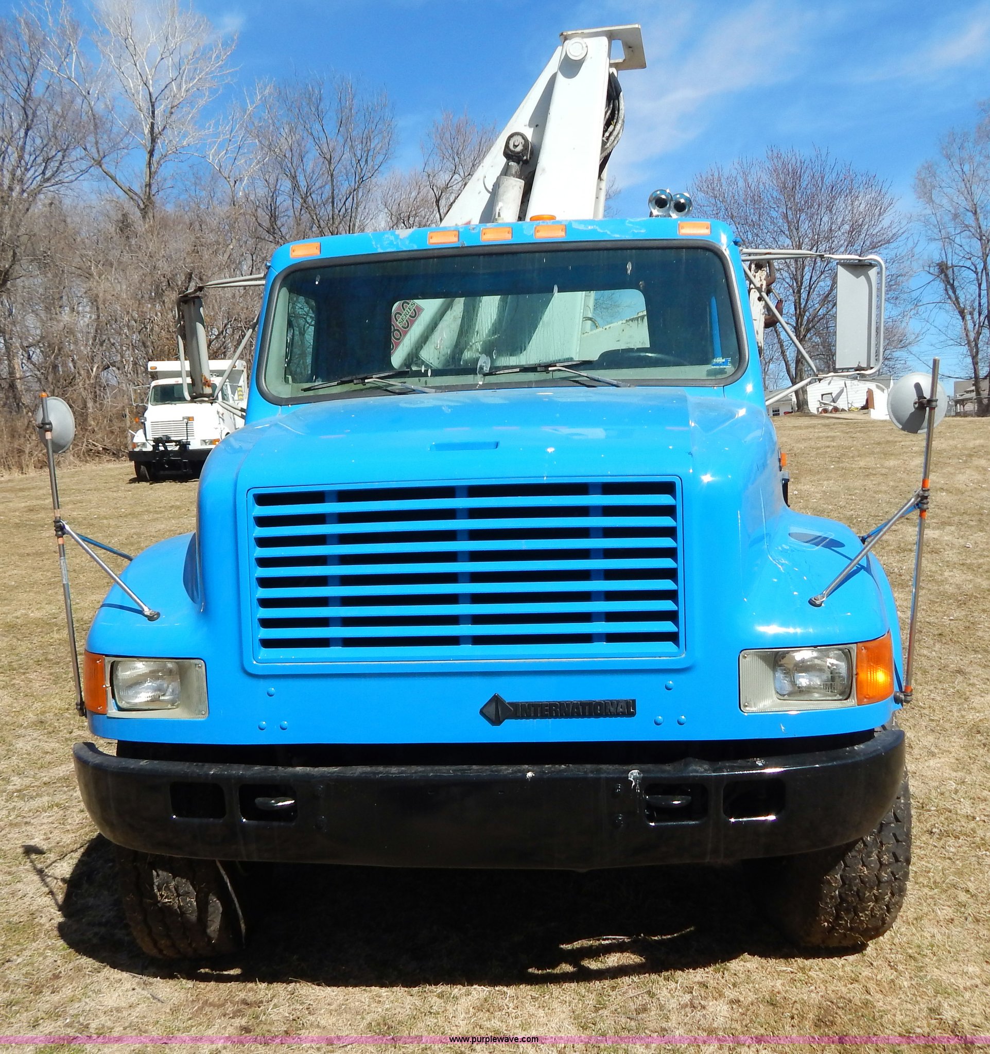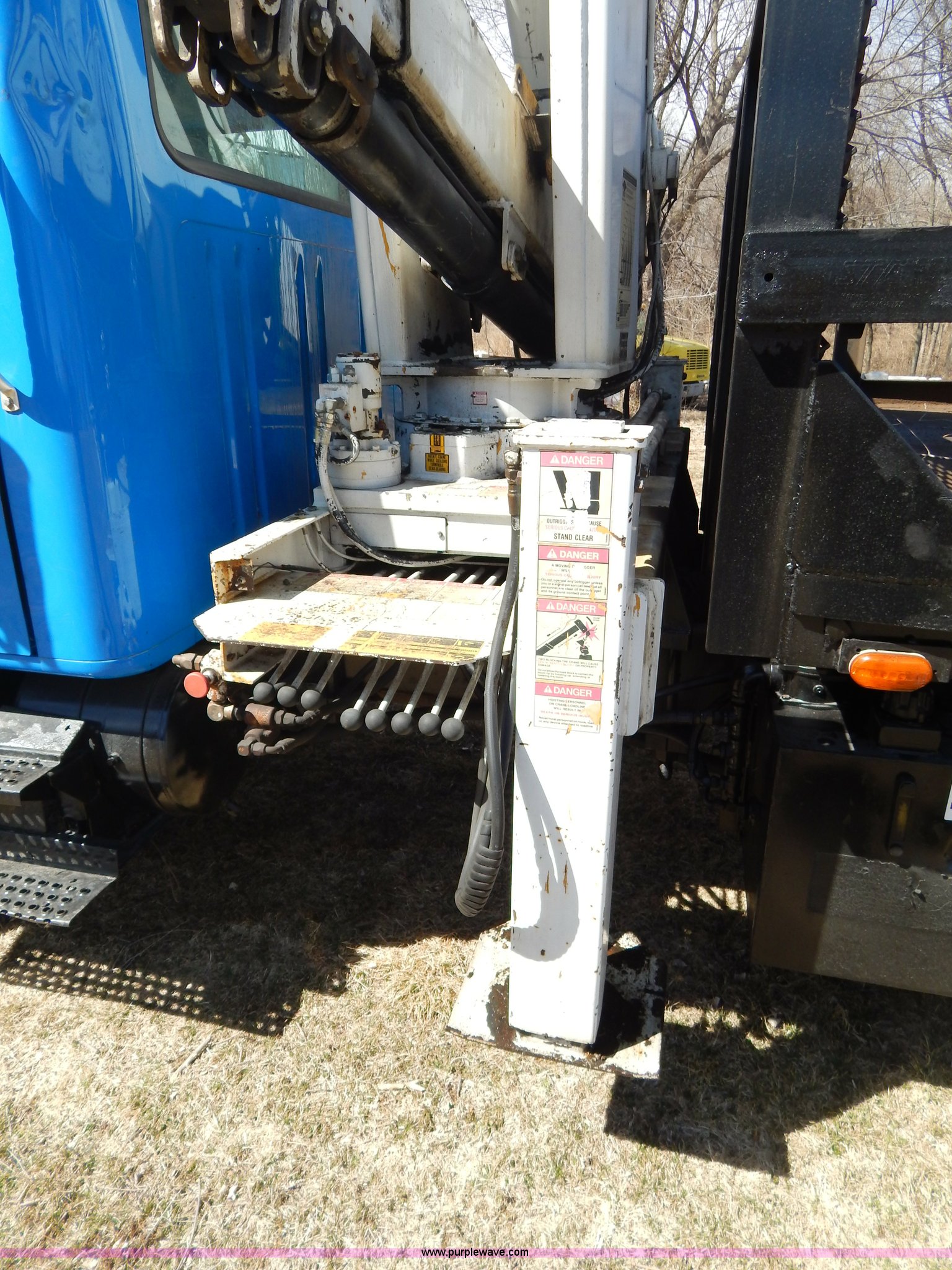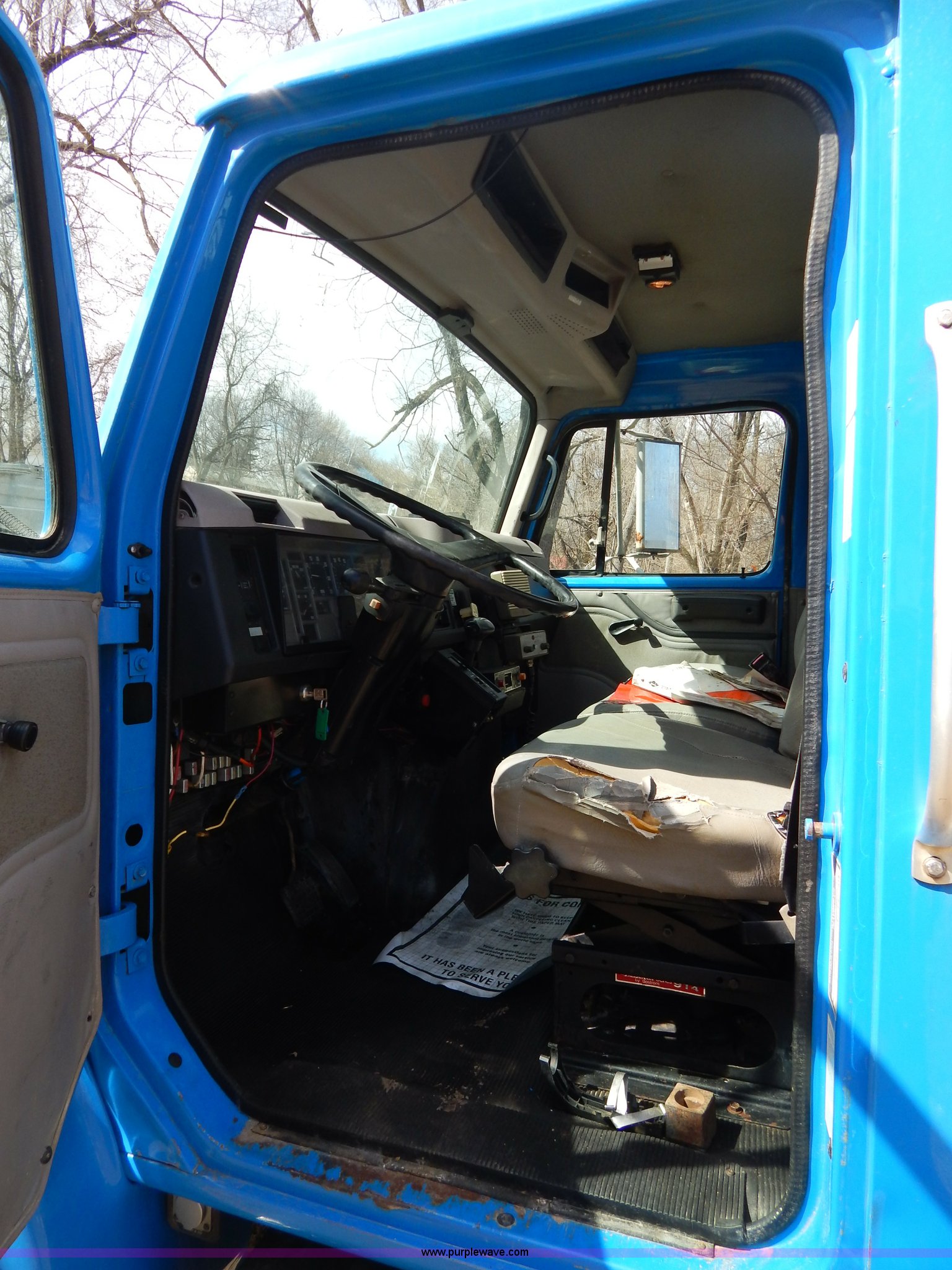 Purple Wave is selling a used Crane Truck in Missouri. This item is a 1996 International 4900 flatbed truck with crane with the following: 51,025 miles on odometer, 7,318 hours on meter, International DT530 8.7L L6 diesel engine, Allison automatic transmission, Heat, Air suspension seat, 15'L x 94"W flatbed, 16"H removable sideboards, IMT 9800 knuckle boom crane, 49'9" maximum height, Serial 1495951013, PTO, Air brakes, 315/80R22.5 front tires, 11R22.5 rear tires