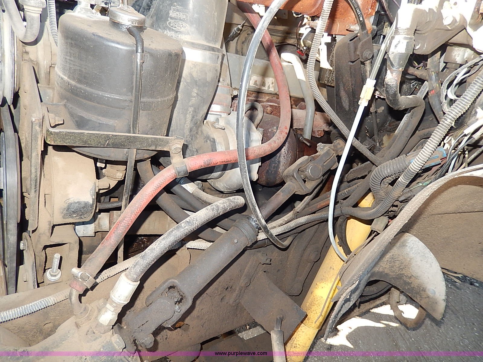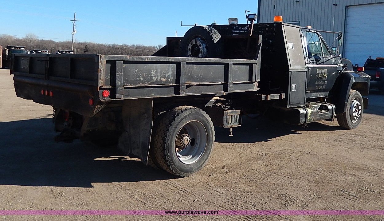 Purple Wave is selling a used Construction Dump Truck in Kansas. This item is a 1989 Ford F700 Custom Cab dump bed truck with the following: 292,129 miles on odometer, 6.6L L6 turbo diesel engine, Automatic transmission, Heat, AM/FM, Manual windows and locks, Vinyl interior, Block heater, Backup alarm, Work lights, 9' x 8' dump bed, Electric hoist, 12" removable sides, Steel construction, Hide-a-way gooseneck hitch, Auxiliary diesel fuel tank, Rawson-Koenig storage box, 50 gallon fuel tank, Fenders, Receiver hitch, Trailer wiring, 245/70R19.5 tires, Interior/exterior cosmetic damage, Transmission leaks, Cosmetic damage to hood, Roof liner needs repaired, Cracked dash