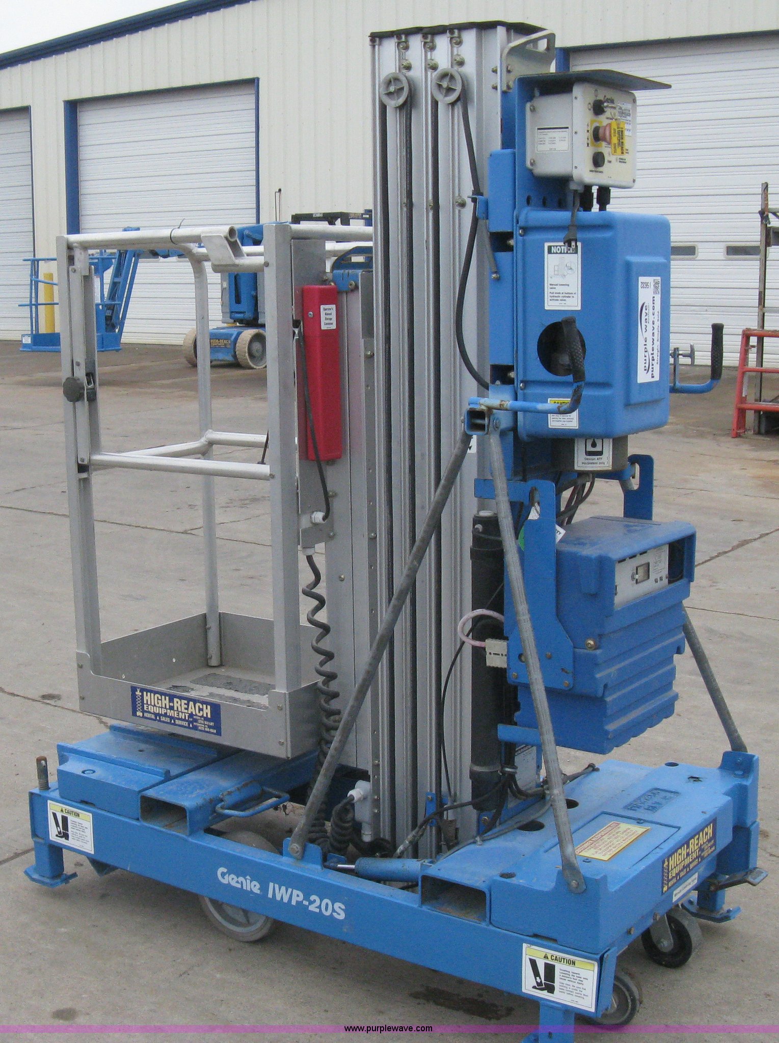 2001 Genie IWP205 electric man lift. Model IWP205DC, 300 lbs maximum lift capacity, 20' maximum platform height, 110V, Fork slot carrier, Wheels, 1,450 lbs. base operating weight, Serial 4001-3930. View equipment video. High Reach Equipment. 3624 W 30th Street S. Wichita, KS 67217