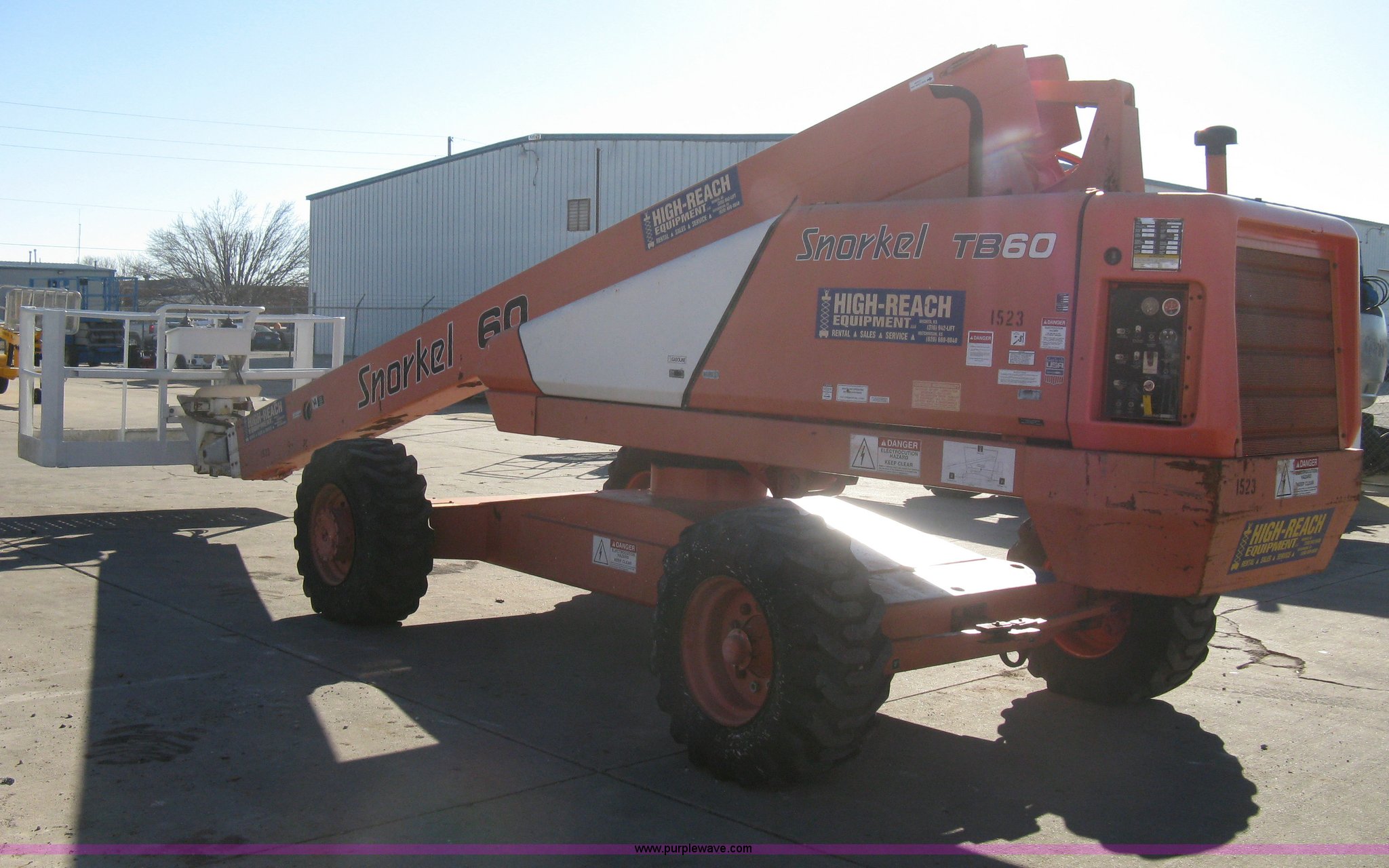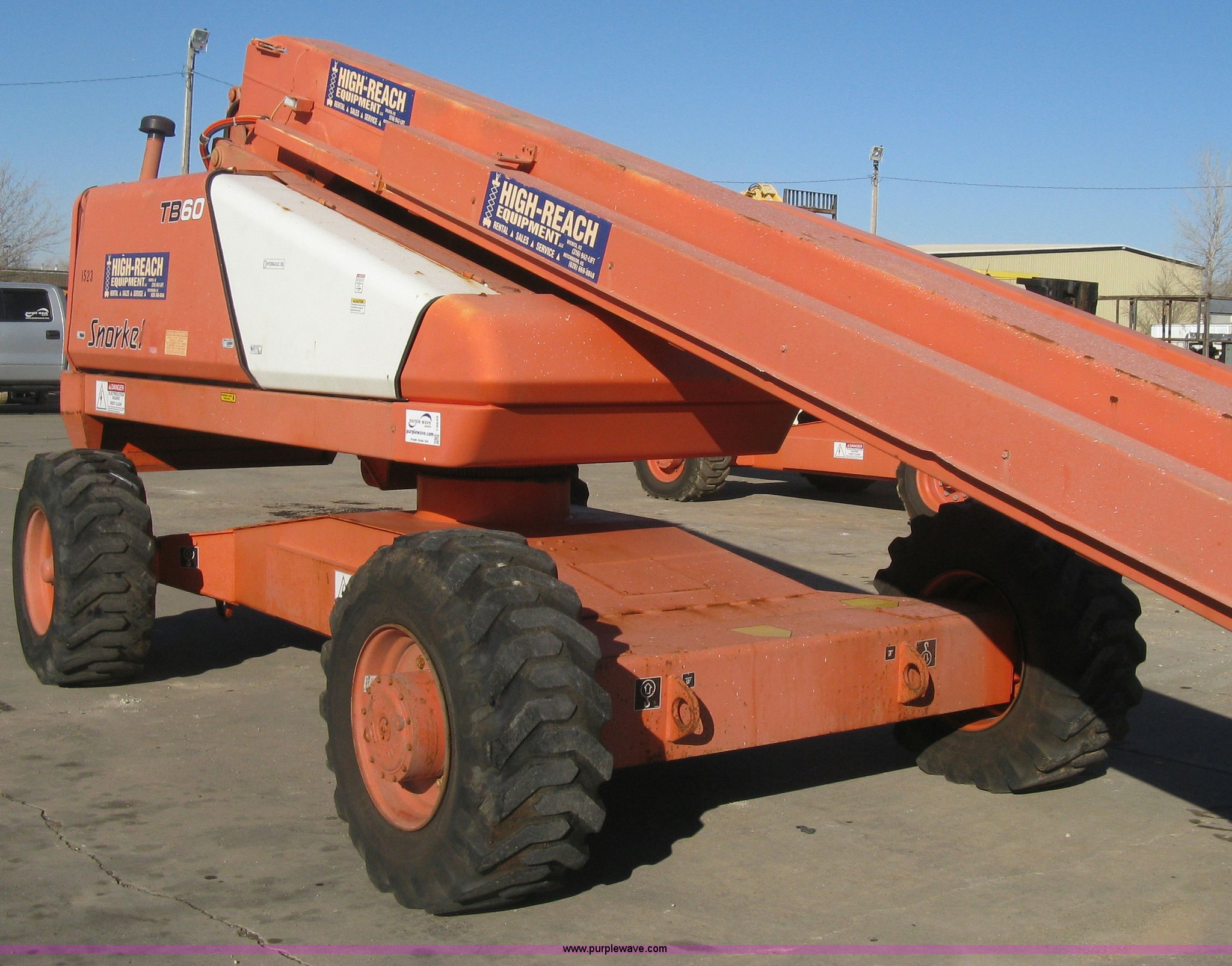 1999 Snorkel TB60 boom lift has sold in Wichita, Kansas for $7480. Item I5645 sold on March 27th, 2014.