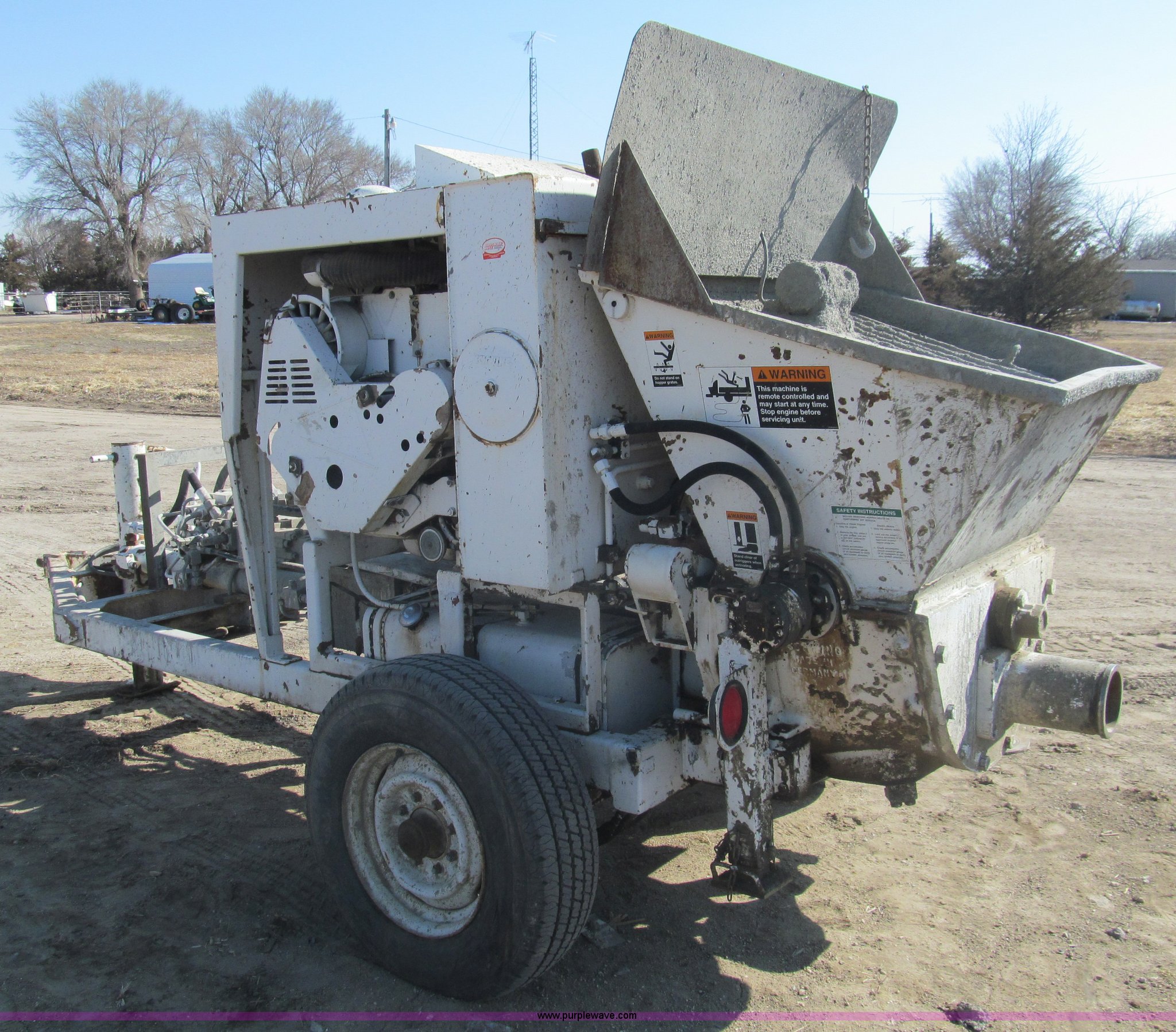 Purple Wave is selling a used Concrete Pump in Kansas. This item is a 1994 Schwing BPA750D-18R concrete pump with the following: 3,924 hours on meter, Deutz four cylinder diesel engine, 70' of 3" flexible concrete hose, 100' of 3" rigid hose, (2) 20' of 2"W joints, 75 yard per hour pump, Pintle hitch, 9.50-16.5 tires