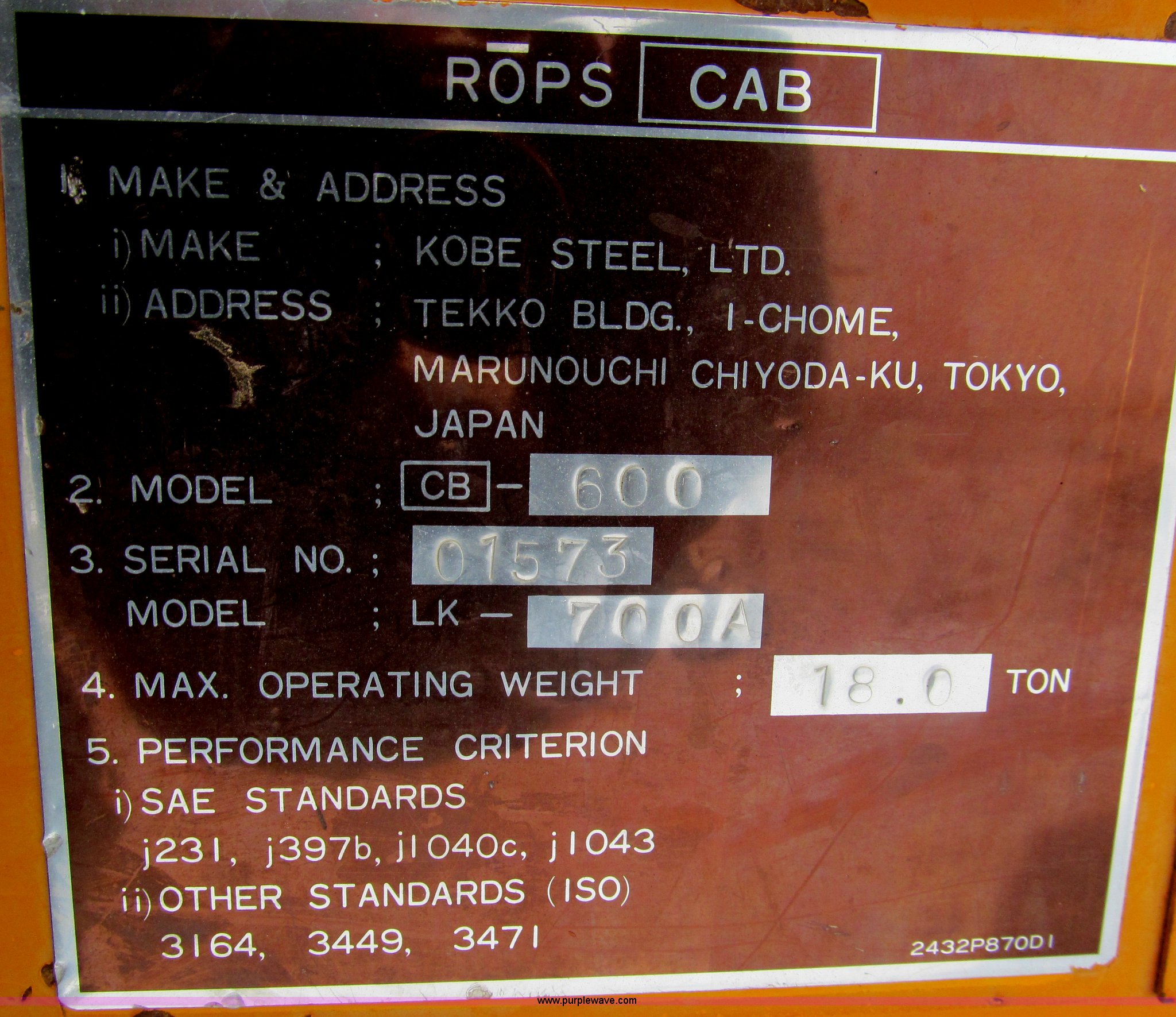 Purple Wave is selling a used Wheel Loader in Kansas. This item is a Kobelco LK700A wheel loader with the following: 5,706 hours on meter, Nissan six cylinder diesel engine, Two speed powershift transmission, Four wheel drive, ROPS cab, Model CB-600, Heat, Serial 01573, Two lever bucket control, 10' toothed bucket, 4.5 yard capacity, 23.5-25 tires, 36,380 lbs. base operating weight, Cracked windshield, Serial LK700-1573