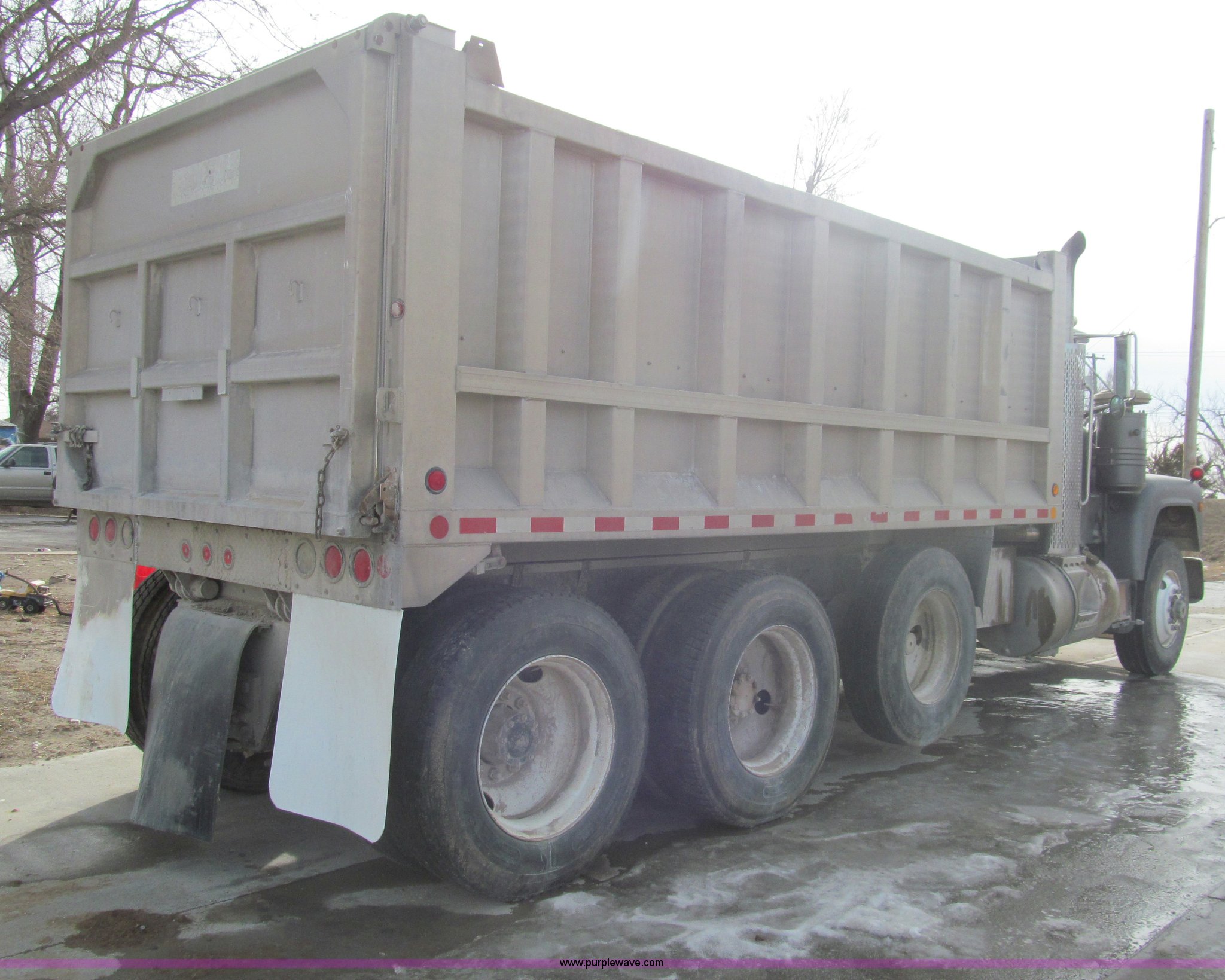 Purple Wave is selling a used Construction Dump Truck in Kansas. This item is a 1991 Mack RD688S triple axle dump truck with the following: 177,891 miles on odometer, 6,141 actual hours, Mack E7 12.0L L6 diesel engine, 10 speed manual transmission, Twin screw, AC and heat, Tilt, Air suspension seat, Heated mirrors, 17' dump bed, Plastic liner, Air end gate, Exterior visor, Chrome bumper, Receiver hitch, 4" ball, Dual 79 gallon fuel tanks, PTO, Spring suspension, Air brakes, Jake brake, Pusher axle, 11R24.5 tires
