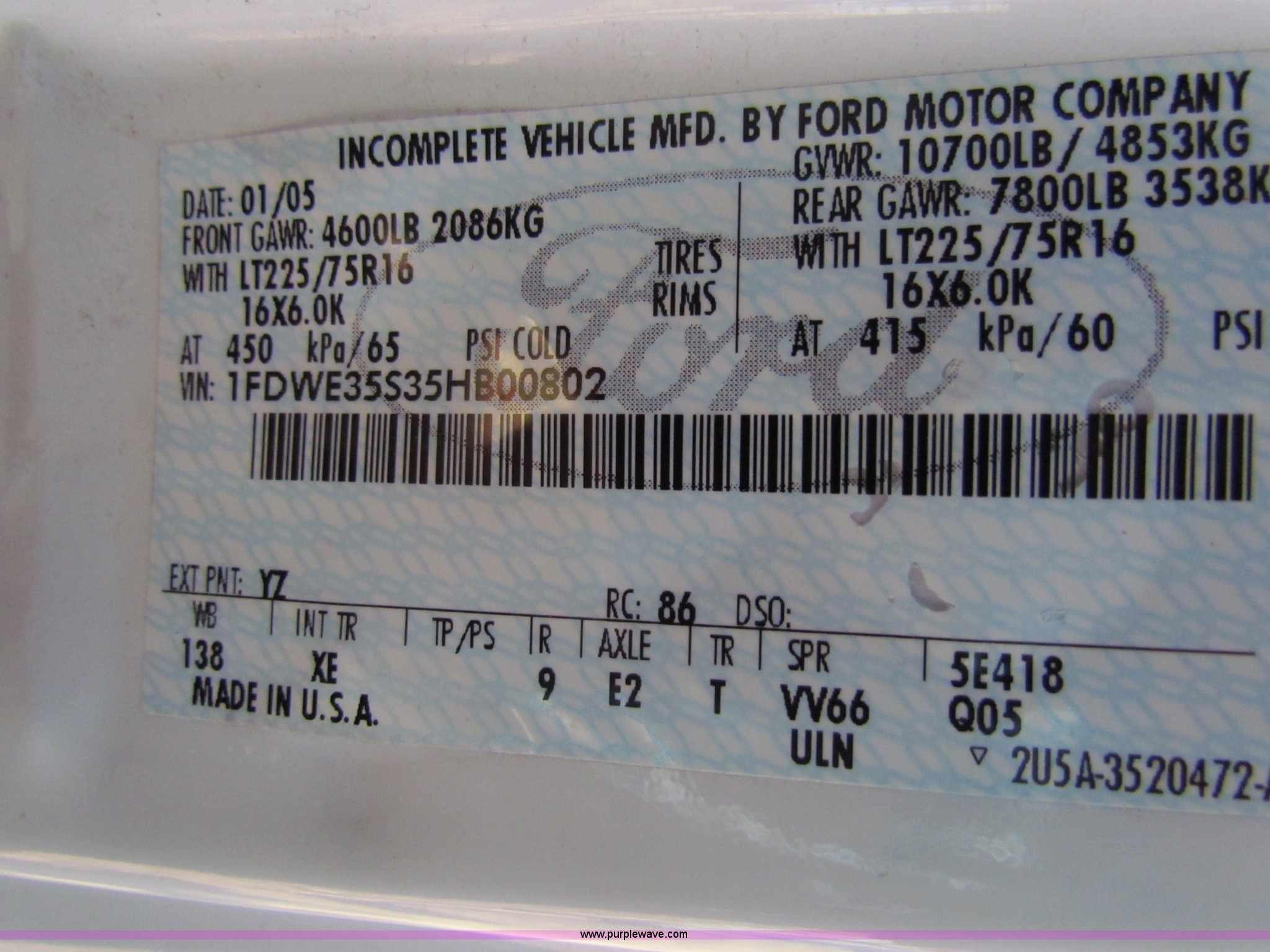 Purple Wave is selling a used Bus in Kansas. This item is a 2005 Ford E350 Super Duty bus with the following: 119,733 miles on odometer, 6.8L V10 SOHC 20V gas engine, Automatic transmission, AC and heat, Tilt, Cruise, AM/FM/cassette, Manual windows and locks, Power seats, 10 passenger capacity, AeroTech body, 225/75R16 tires, GVWR 10,700 lbs, Interior/exterior cosmetic damage, Wheelchair lift broken