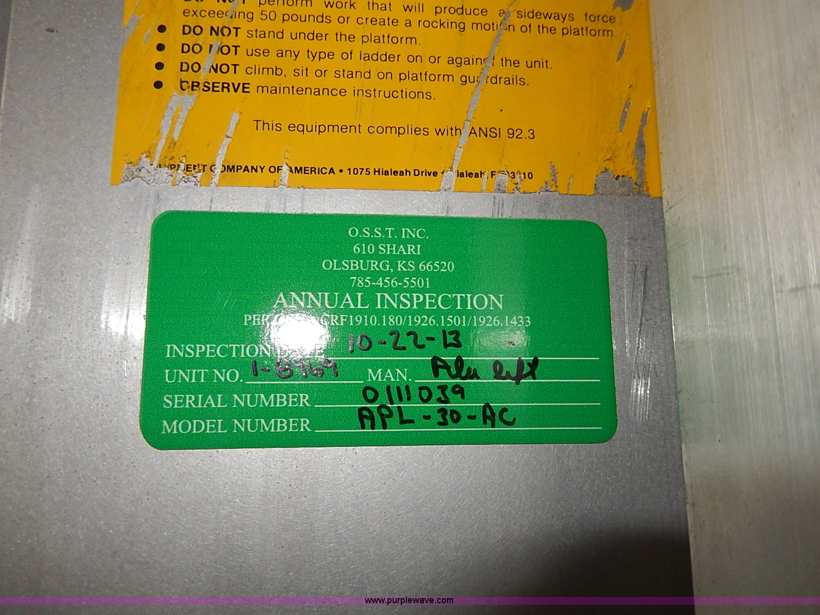 Purple Wave is selling a used Tools in Kansas. This item is a Alumaloft APL30AC electric platform lift with the following: 30' reach, Annual inspection completed October 2013, Serial 111039