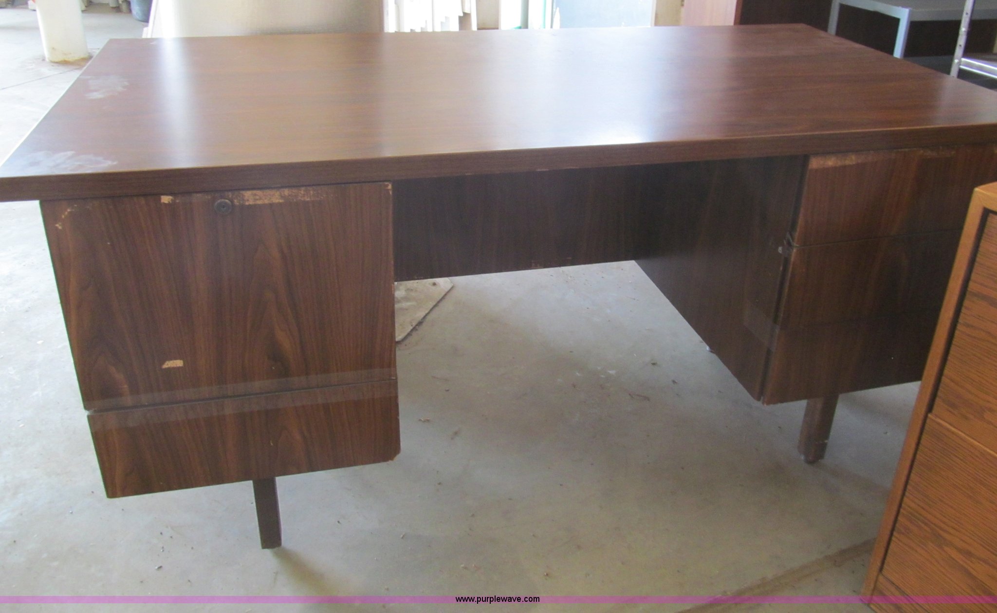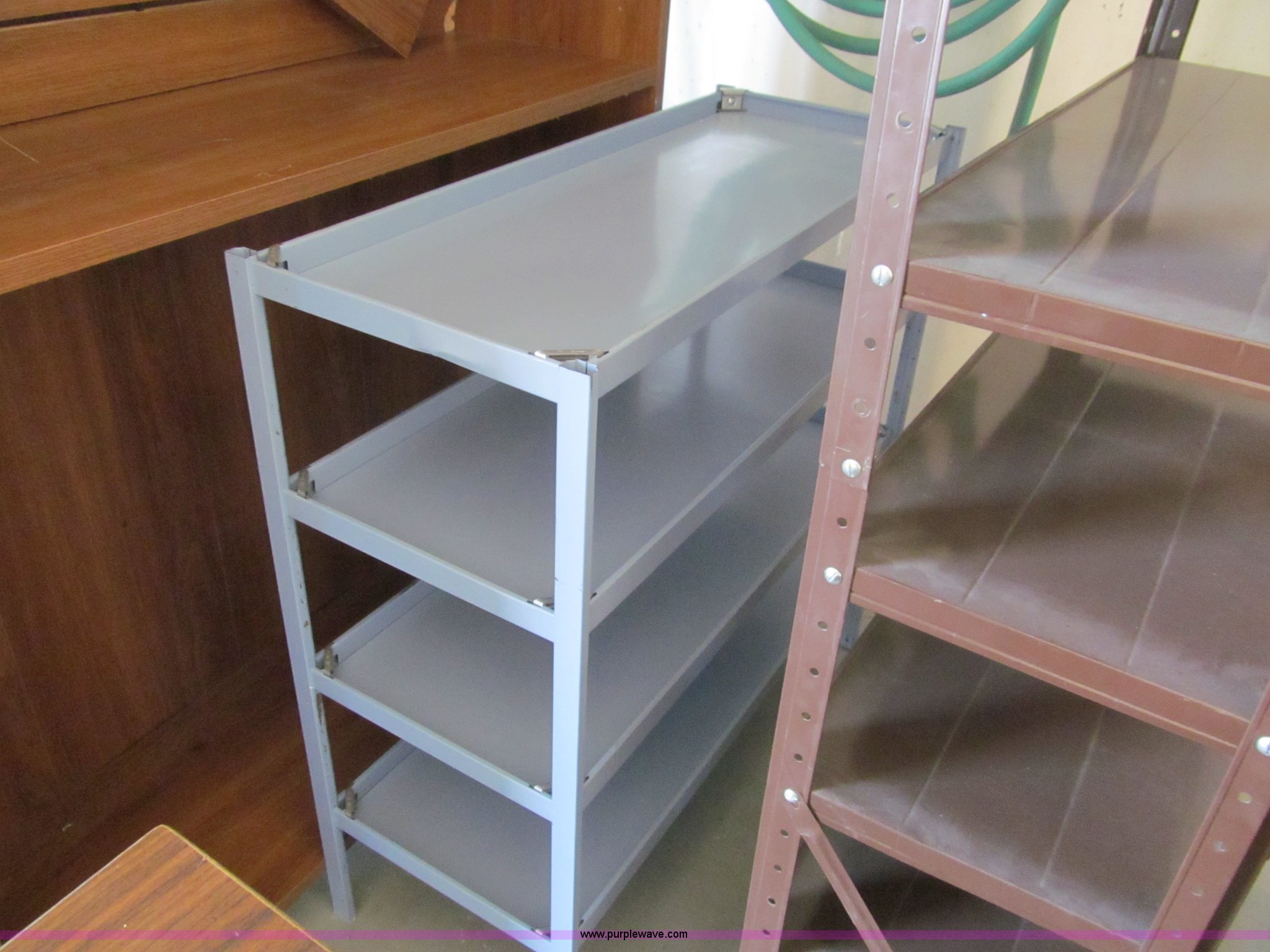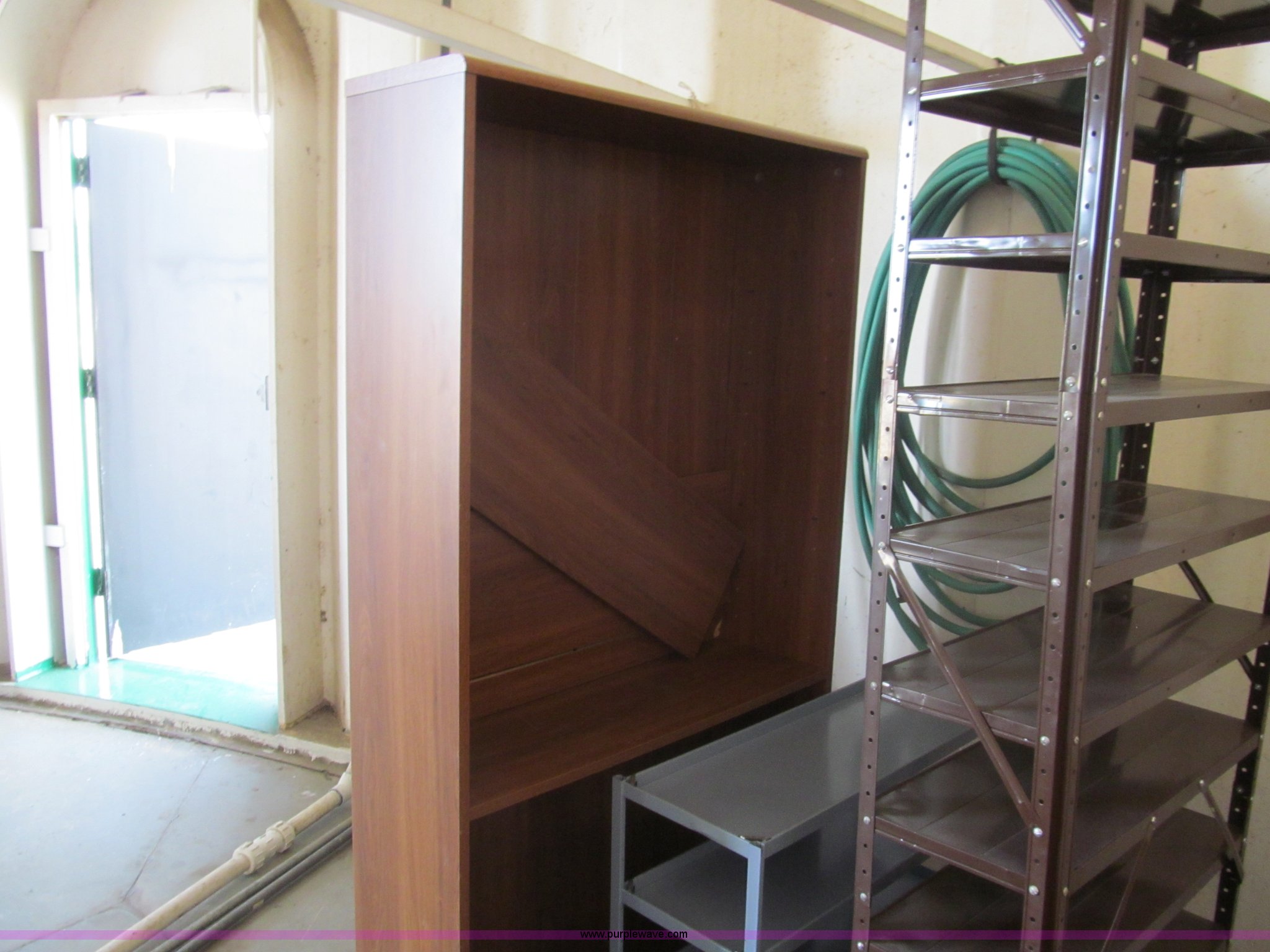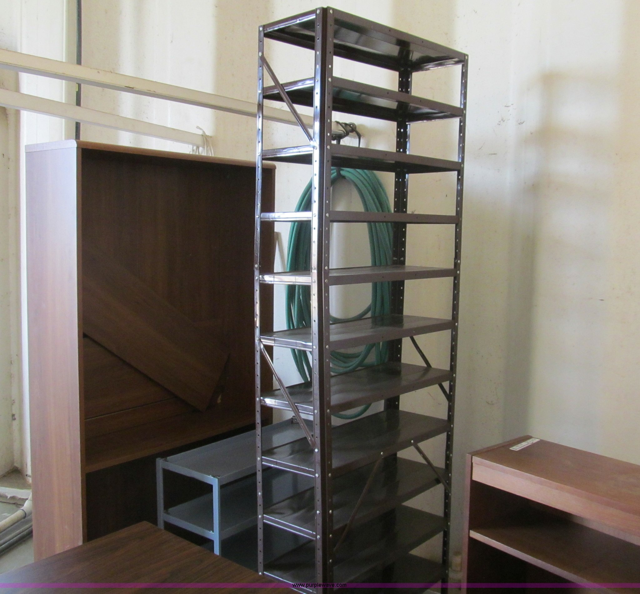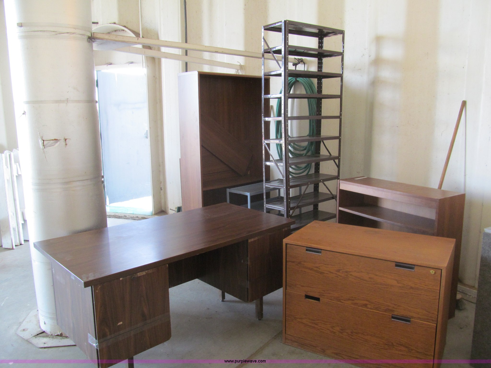 Purple Wave is selling a used Furniture in Kansas. This item is a Assorted wood furniture with the following: Desk, 60"L x 30"W x 3'H, Chest of drawers, 36"L x 20"W x 28"H, Bookshelf, 36"L x 36"W x 17"H, Metal shelving rack, 30"L x 12"W x 86"H