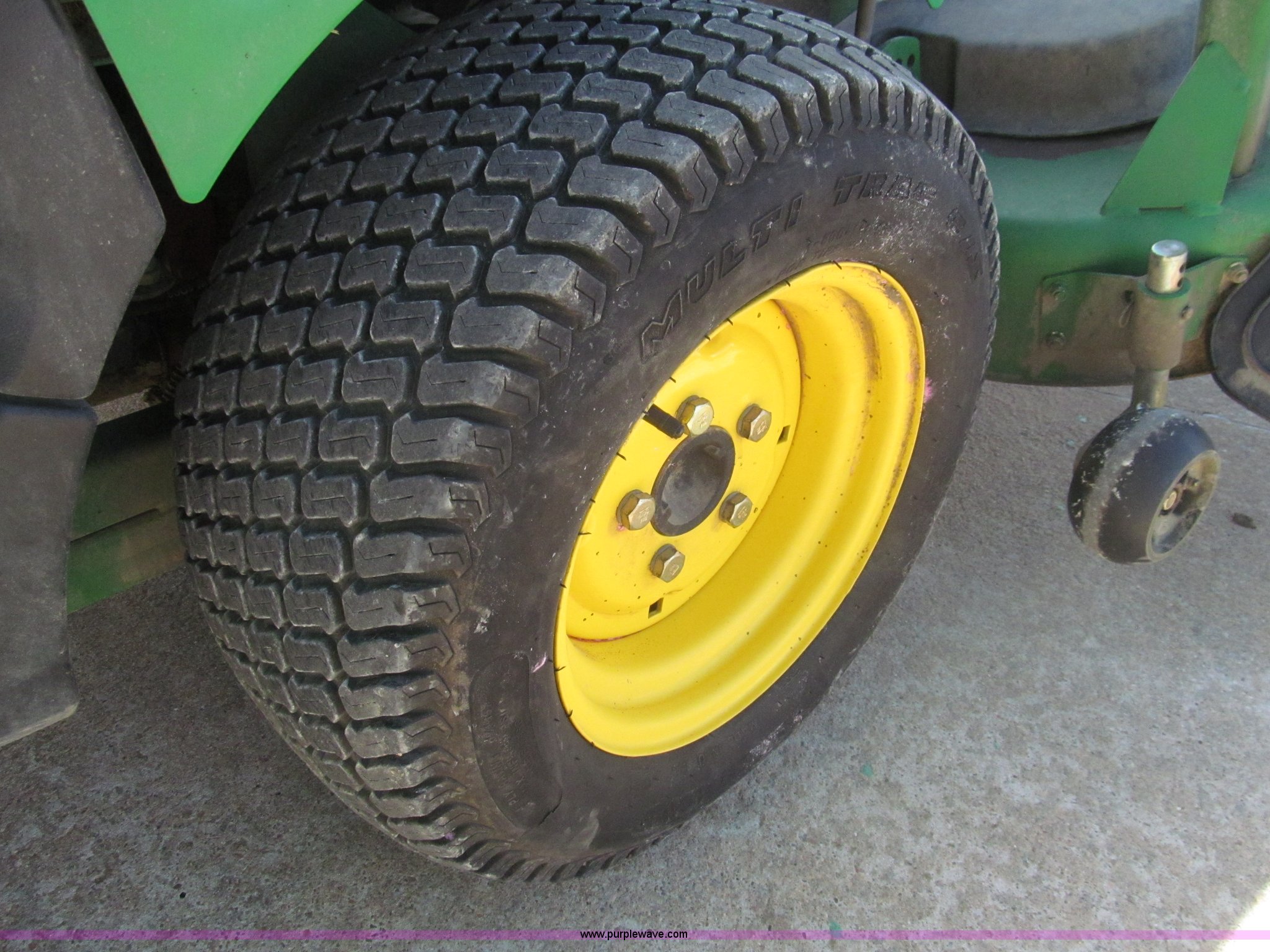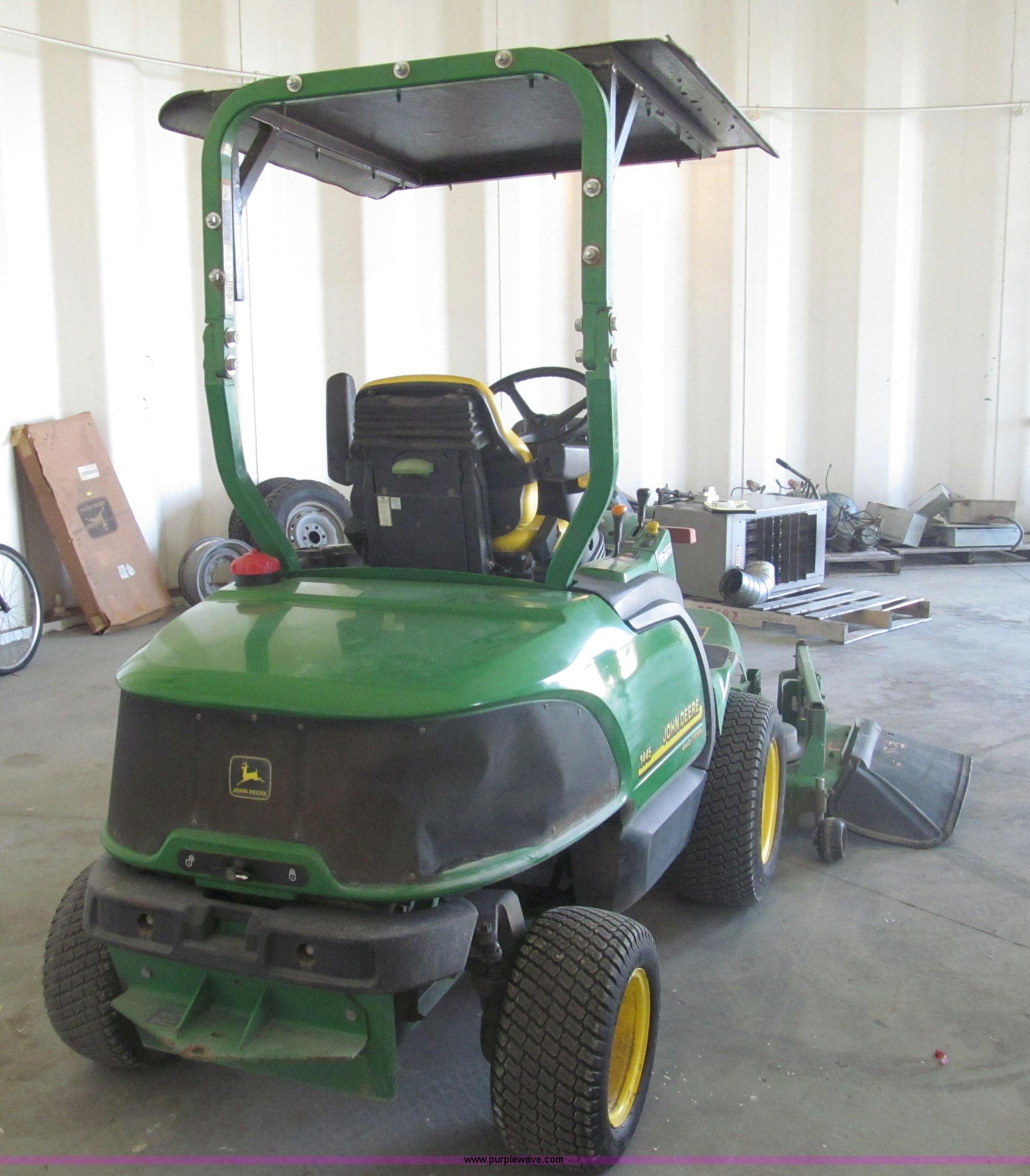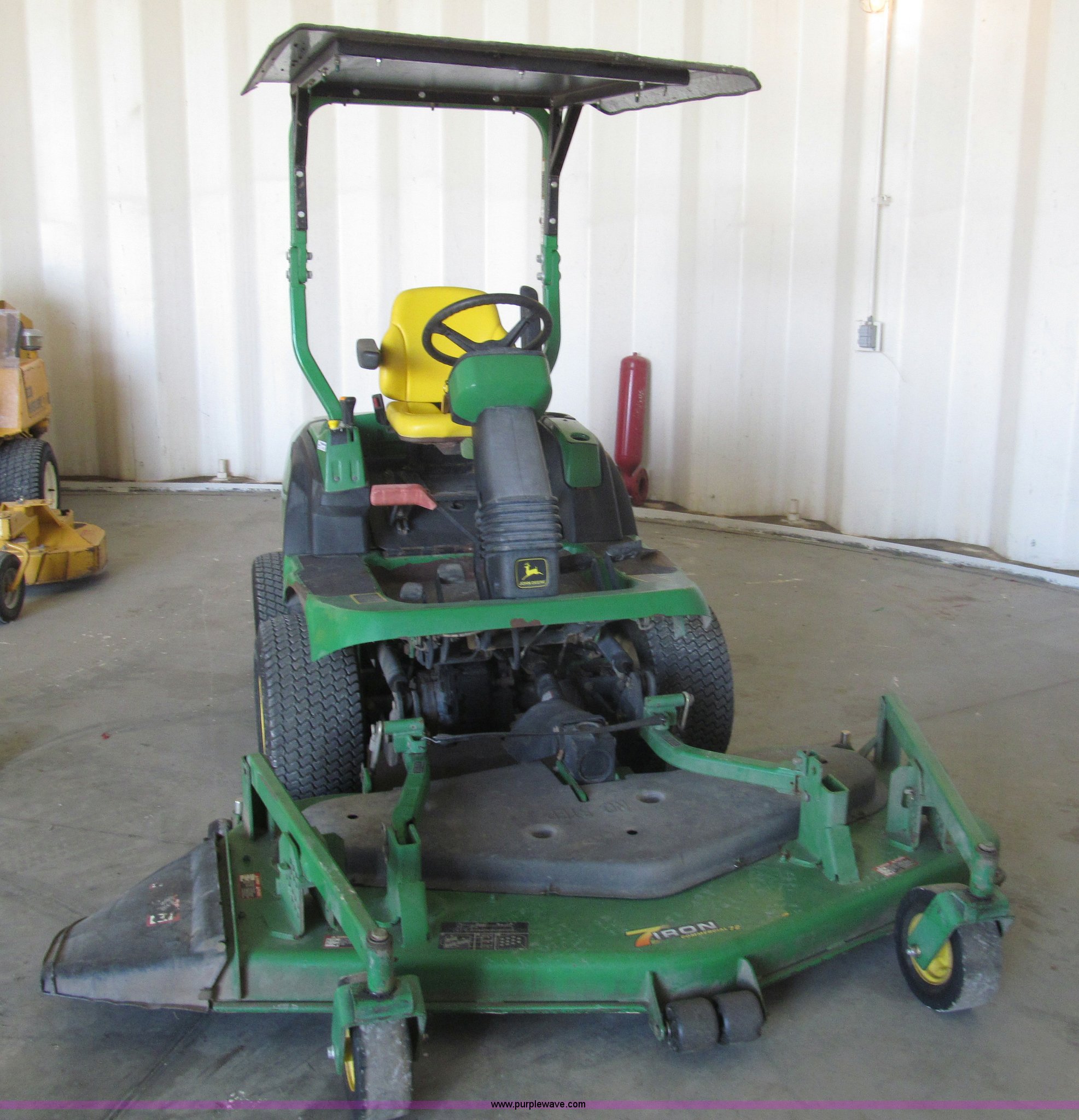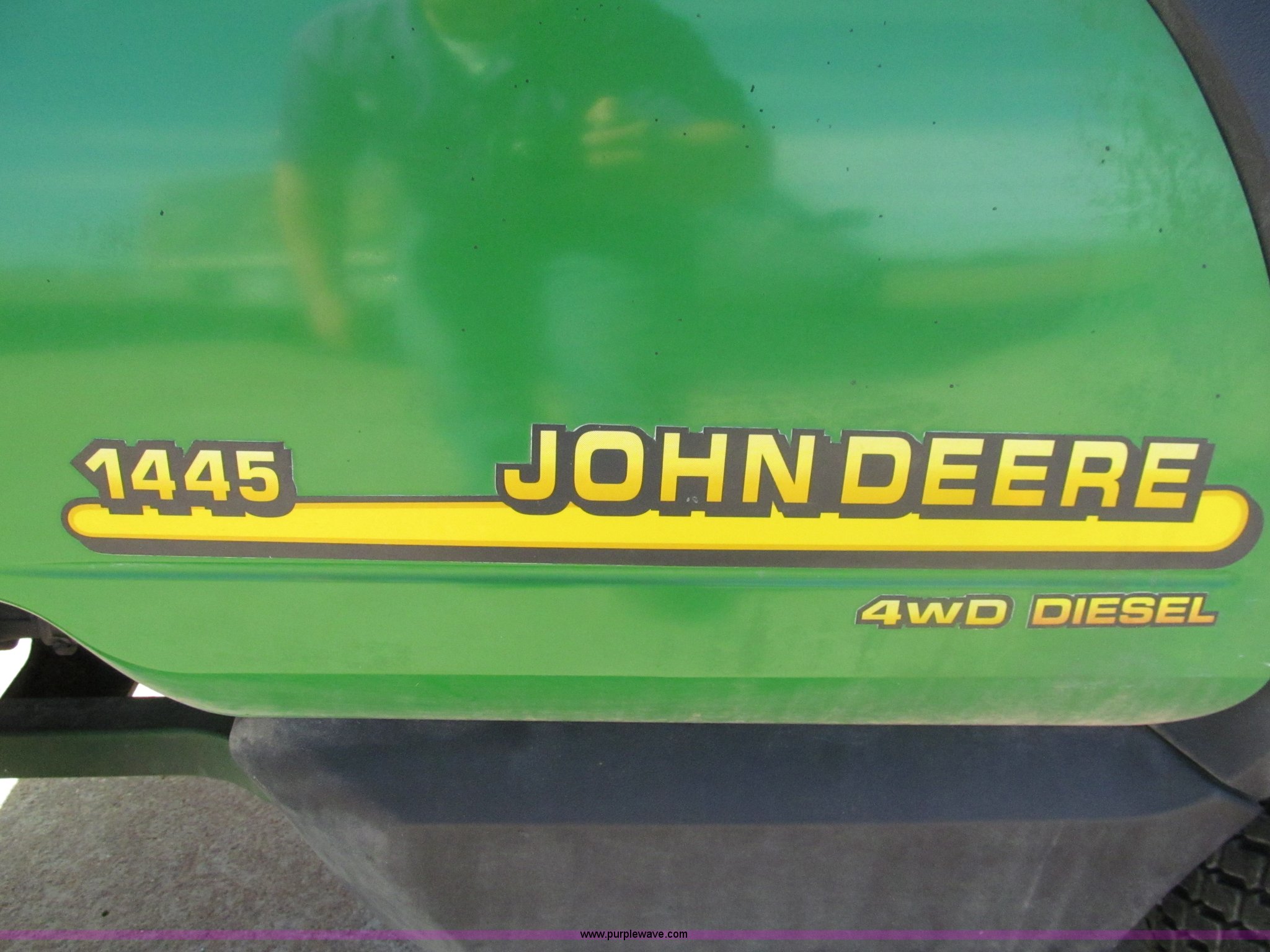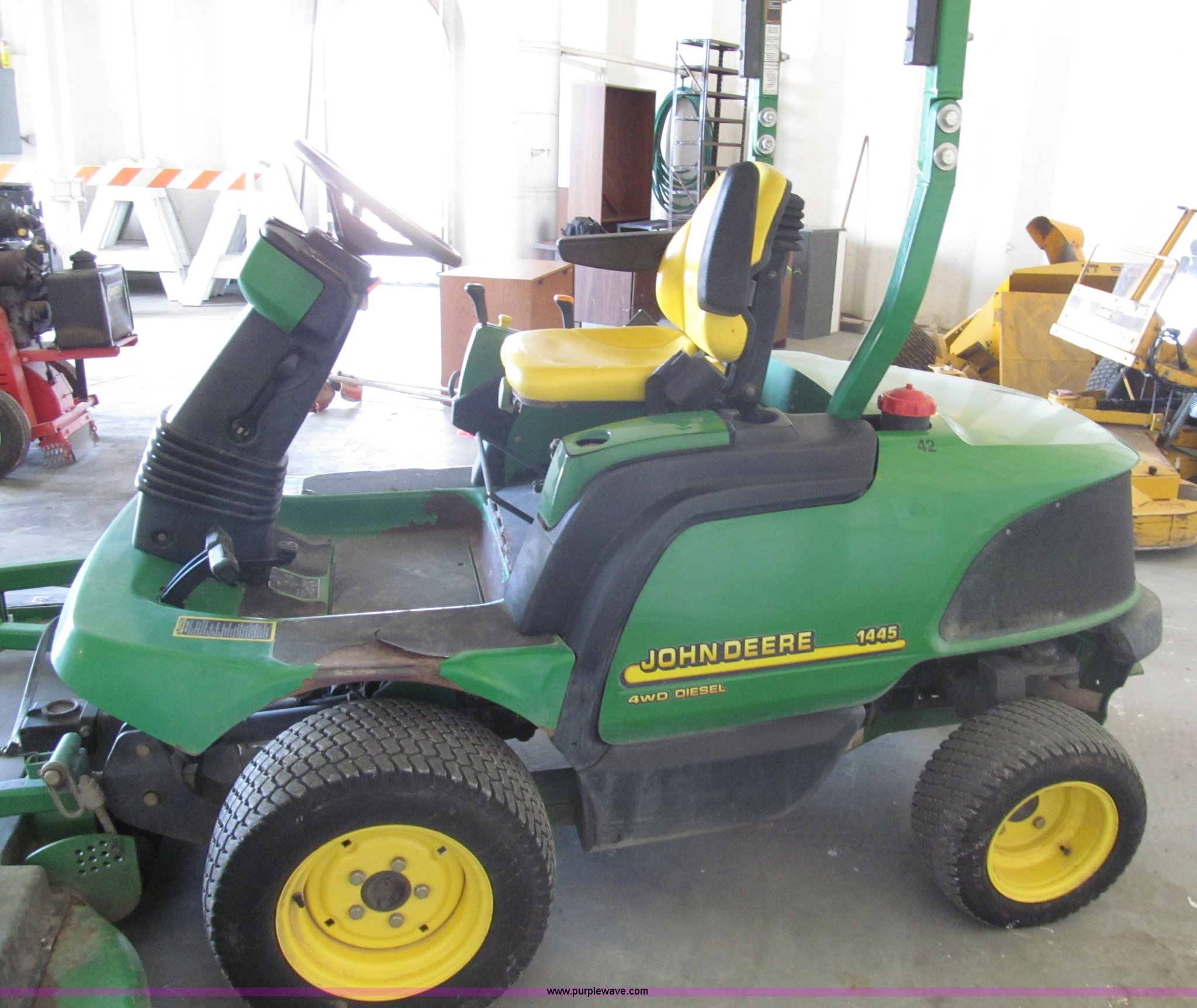 Purple Wave is selling a used Commercial Turf Mower in Kansas. This item is a John Deere 1445 lawn mower with the following: 809 hours on meter, 72" cutting capacity, Three cylinder diesel engine, Model 3012D008, Serial CH3512D030244, Hydrostatic transmission, Four wheel drive, Shop built canopy, Model 7 Iron Commercial 72 deck, Hydraulic deck raise and lower, 23 x 10.50-12 tires, Additional blades