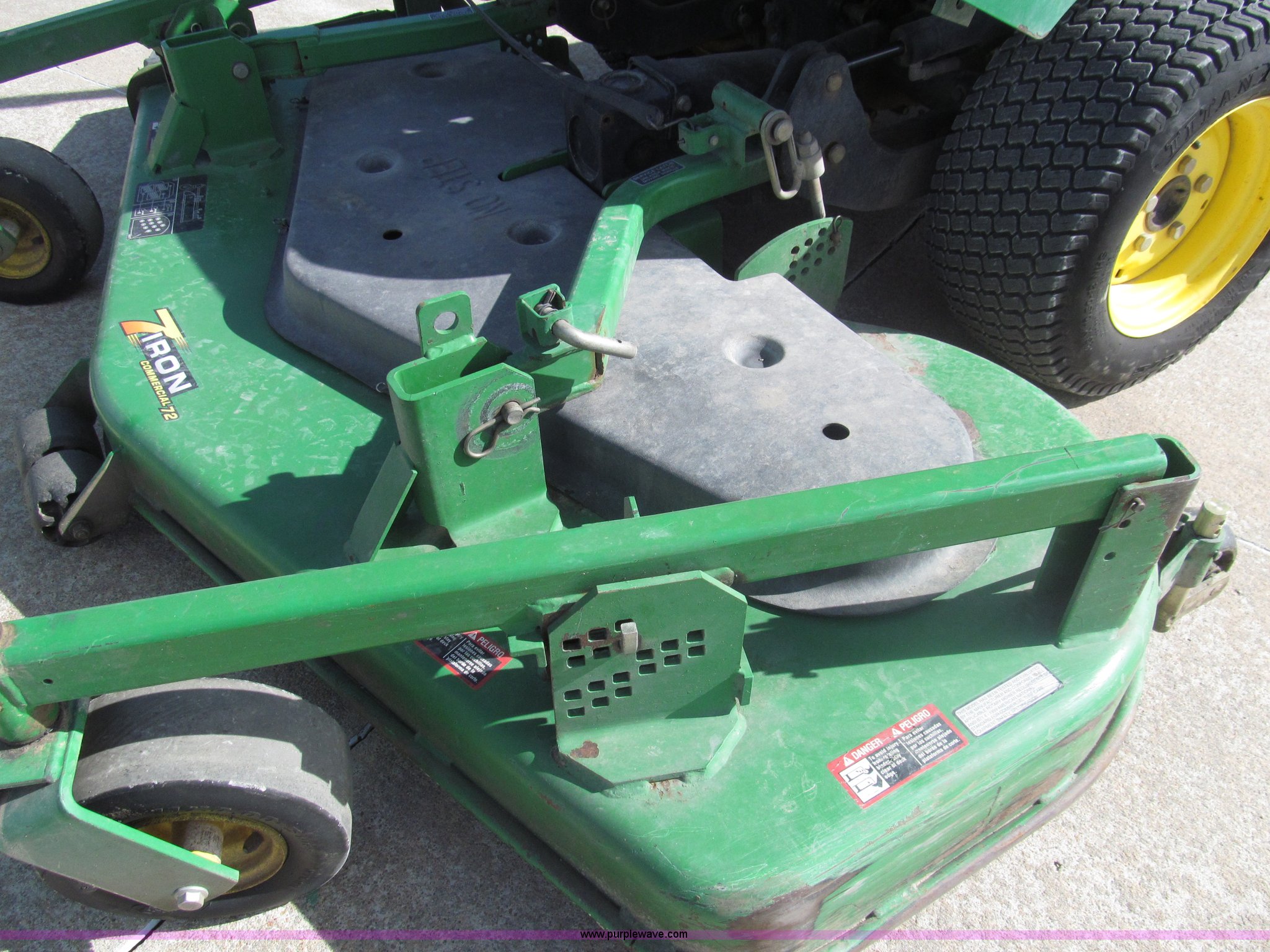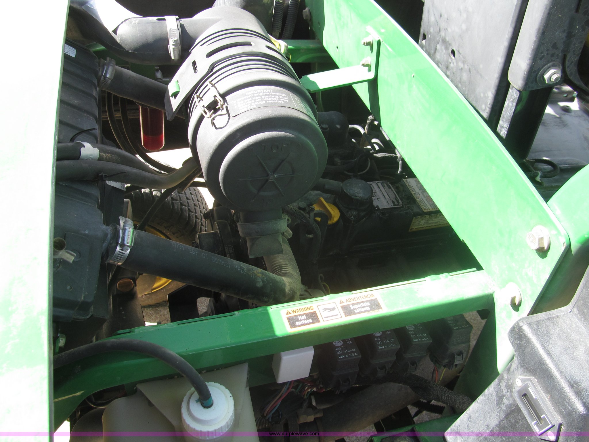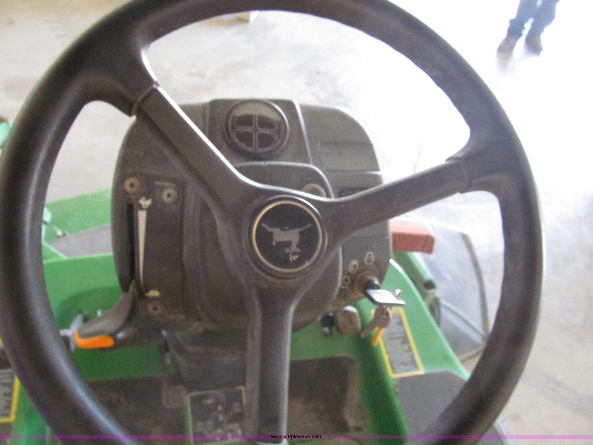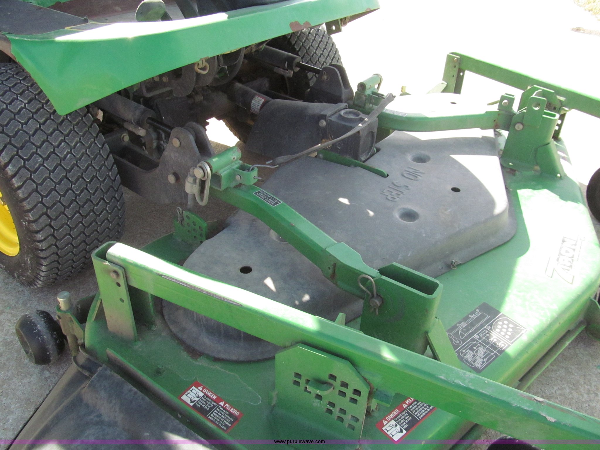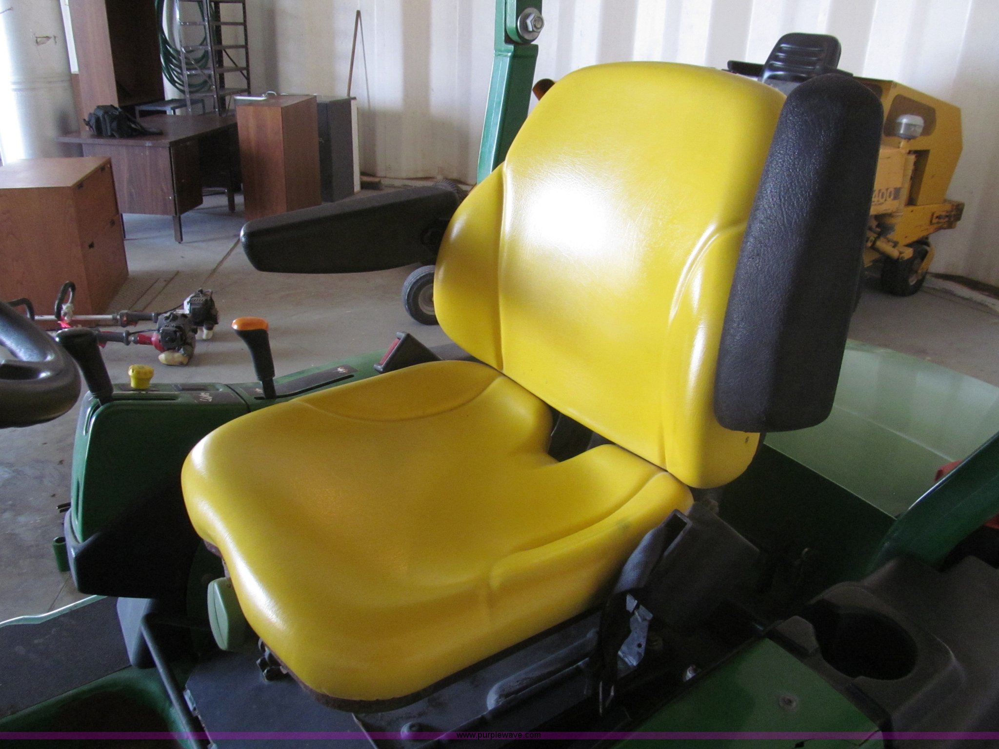 Purple Wave is selling a used Commercial Turf Mower in Kansas. This item is a John Deere 1445 lawn mower with the following: 809 hours on meter, 72" cutting capacity, Three cylinder diesel engine, Model 3012D008, Serial CH3512D030244, Hydrostatic transmission, Four wheel drive, Shop built canopy, Model 7 Iron Commercial 72 deck, Hydraulic deck raise and lower, 23 x 10.50-12 tires, Additional blades