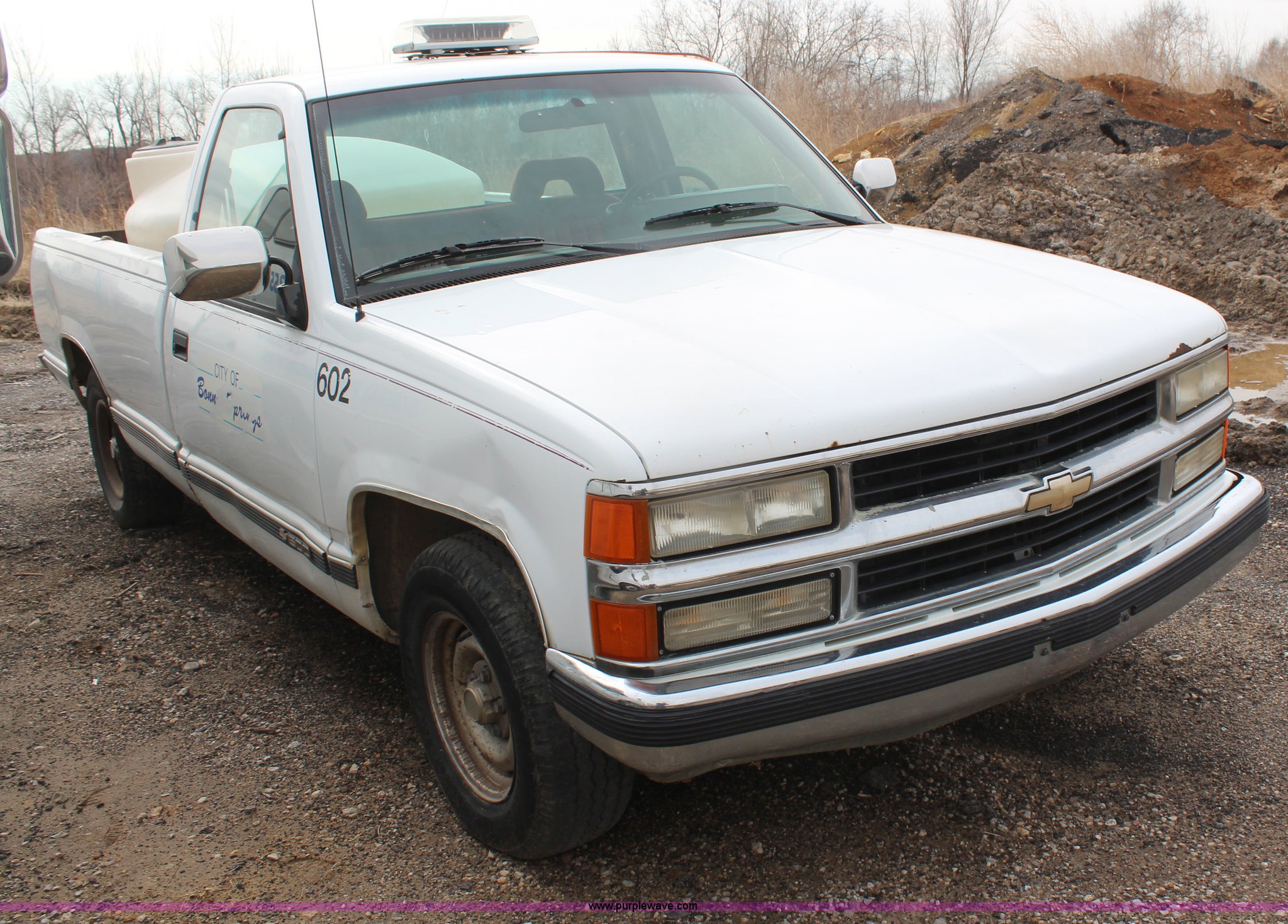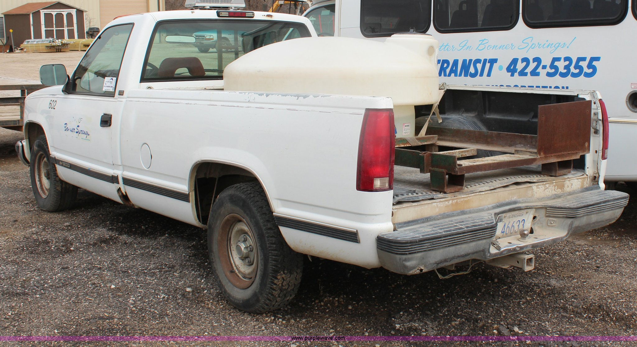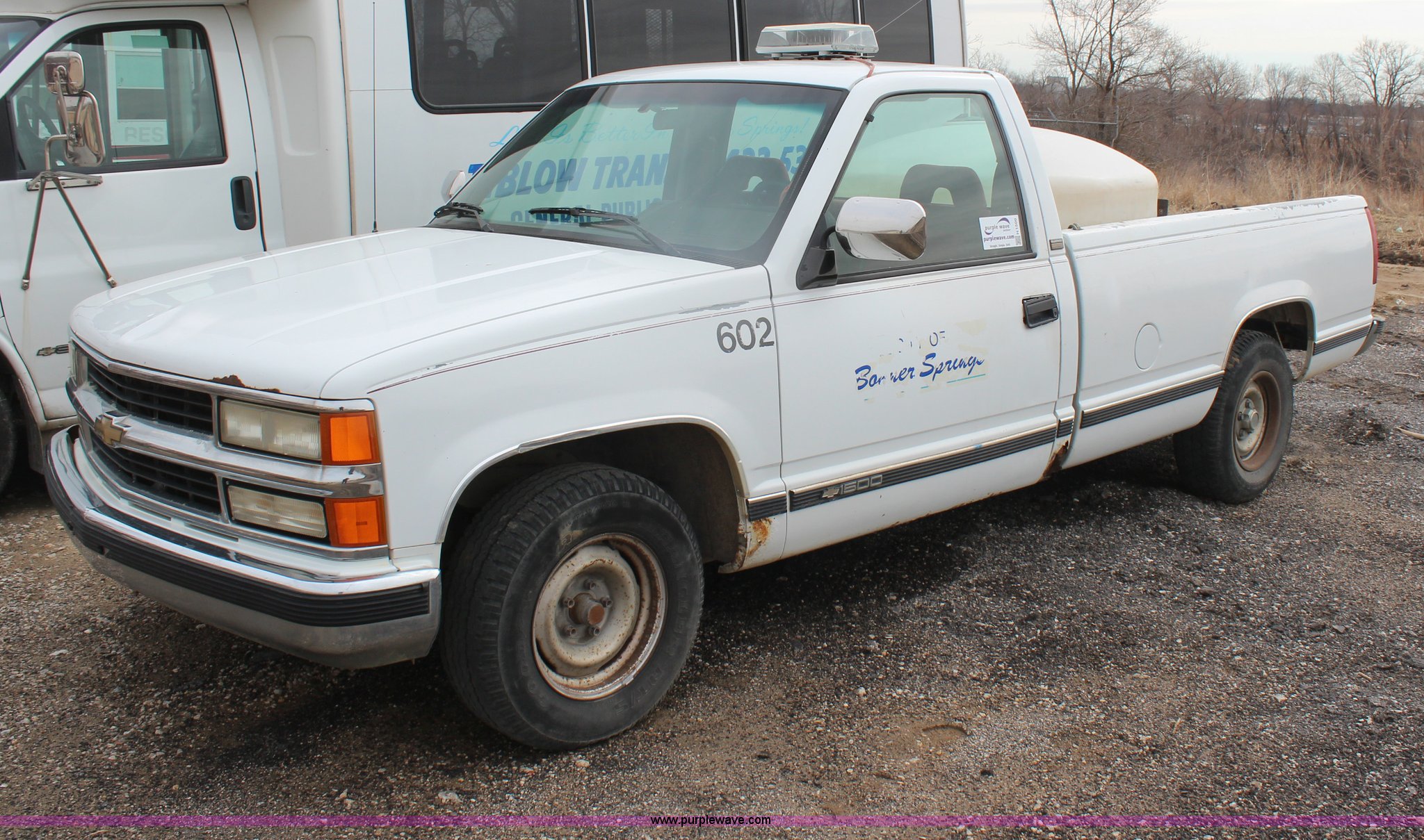 Purple Wave is selling a used 1/2 Ton Pickup or Van in Kansas. This item is a 1994 Chevrolet 1500 pickup truck with the following: 144,286 miles on odometer, 5.0L V8 VIH 16V gas engine, Automatic transmission, AC and heat, AC inoperable, Tilt, Cruise, Inoperable, AM/FM/cassette, Power windows and locks, Cloth interior, Long bed, Bed liner, Receiver hitch, 235/70R15 tires, Brake light on, Cracked windshield, Loose door handle, No tailgate, Star Beam light, water tank, and frame not included, Cosmetic damage, Exterior rust and dings, Driver's door panel missing, Unit# 602