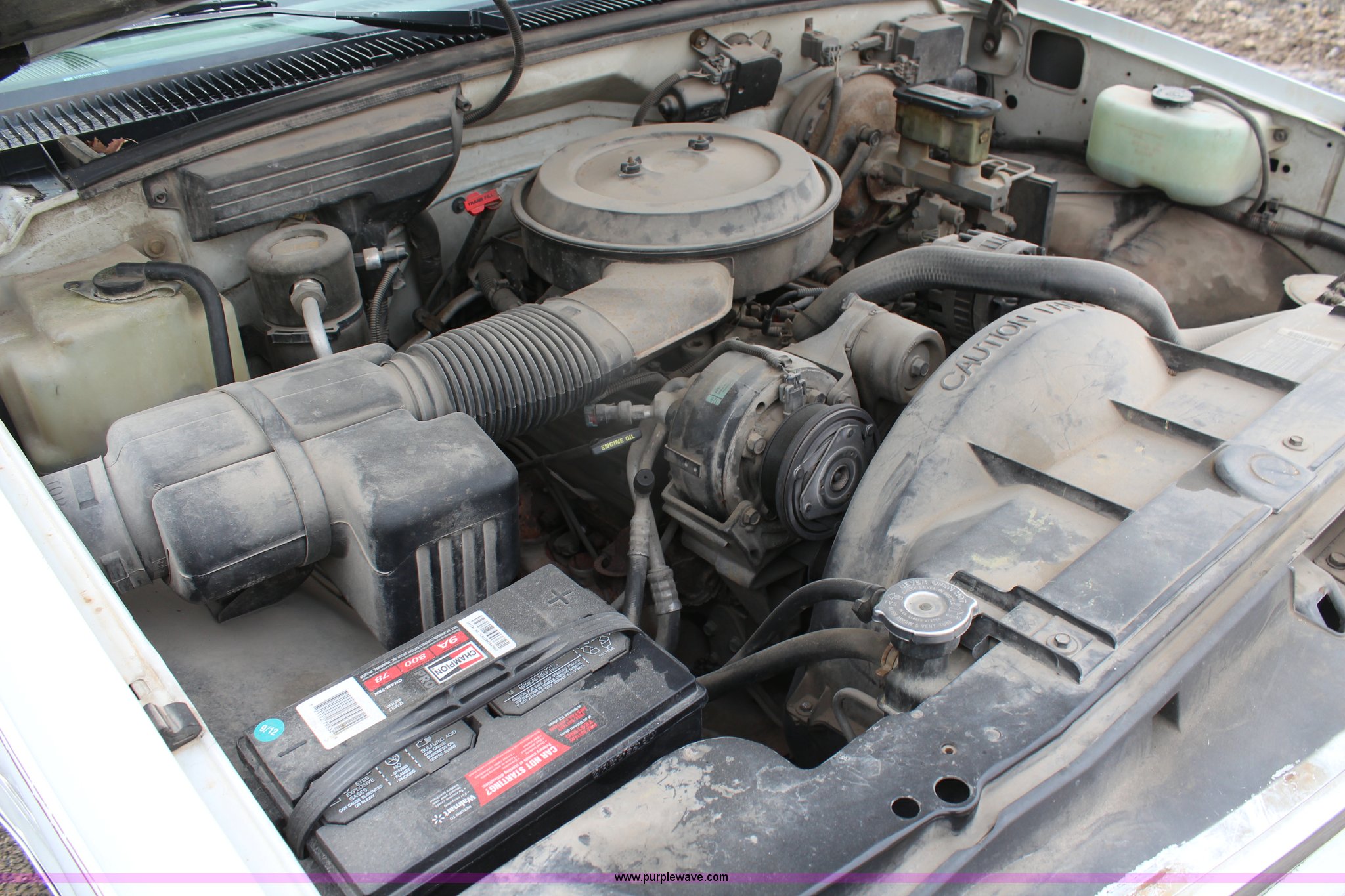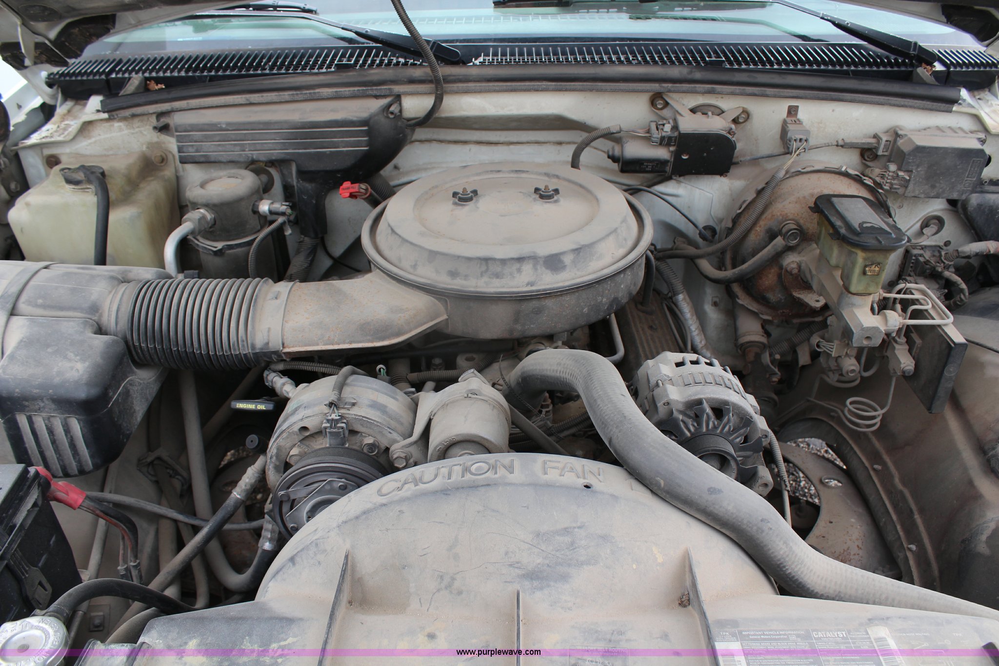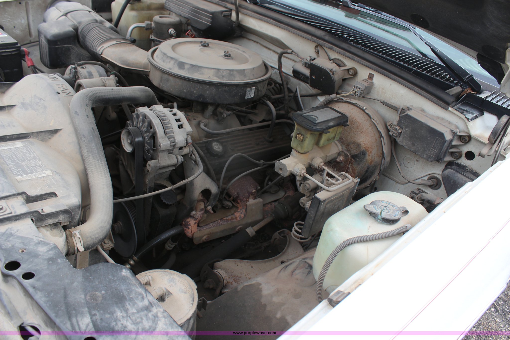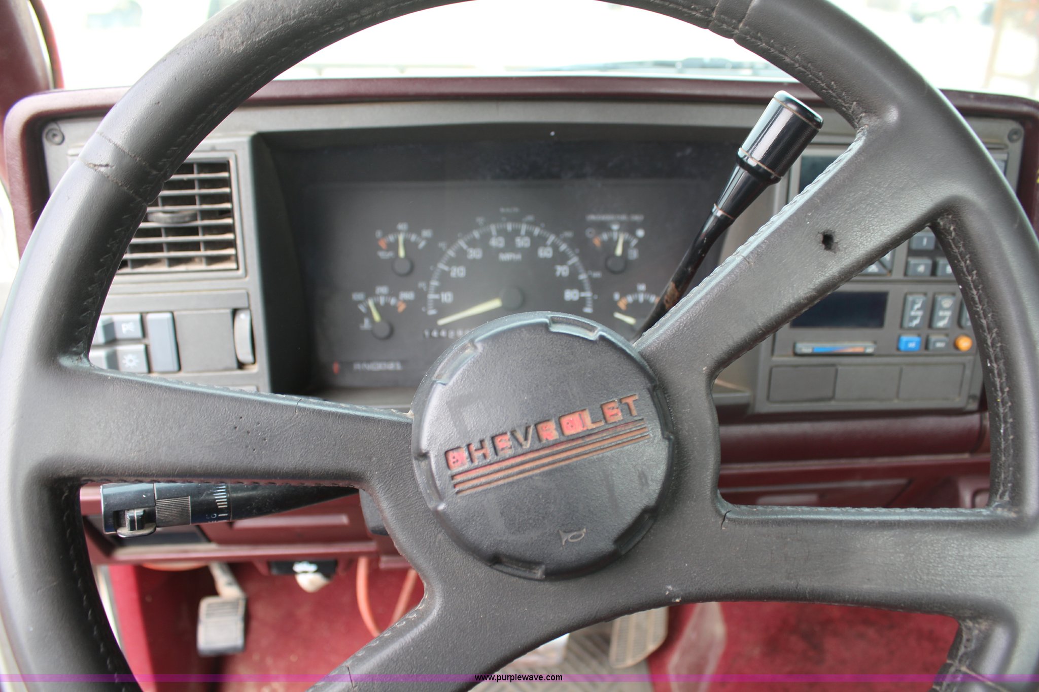 Purple Wave is selling a used 1/2 Ton Pickup or Van in Kansas. This item is a 1994 Chevrolet 1500 pickup truck with the following: 144,286 miles on odometer, 5.0L V8 VIH 16V gas engine, Automatic transmission, AC and heat, AC inoperable, Tilt, Cruise, Inoperable, AM/FM/cassette, Power windows and locks, Cloth interior, Long bed, Bed liner, Receiver hitch, 235/70R15 tires, Brake light on, Cracked windshield, Loose door handle, No tailgate, Star Beam light, water tank, and frame not included, Cosmetic damage, Exterior rust and dings, Driver's door panel missing, Unit# 602