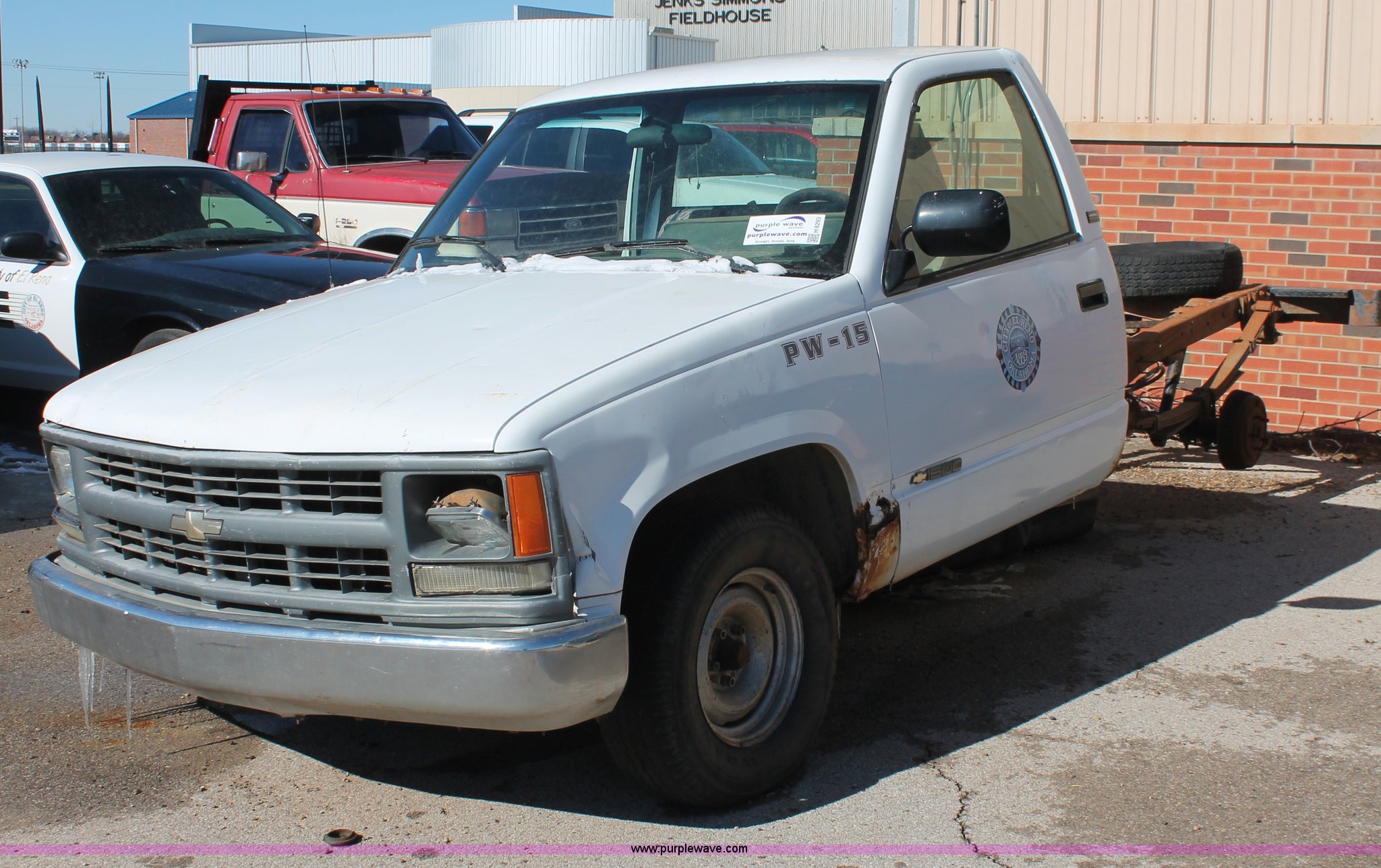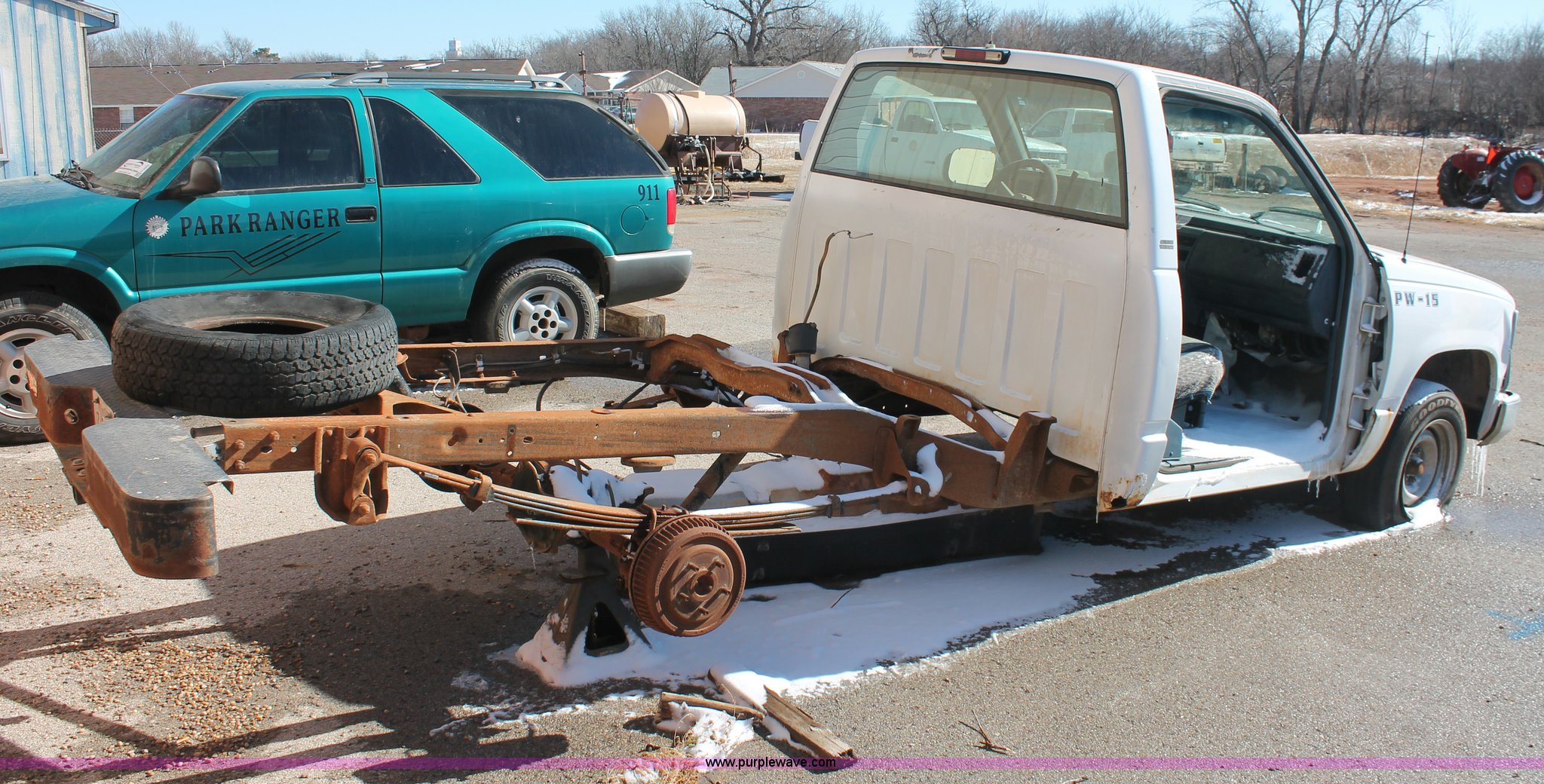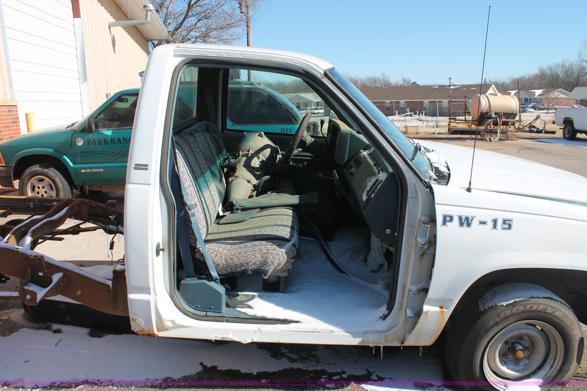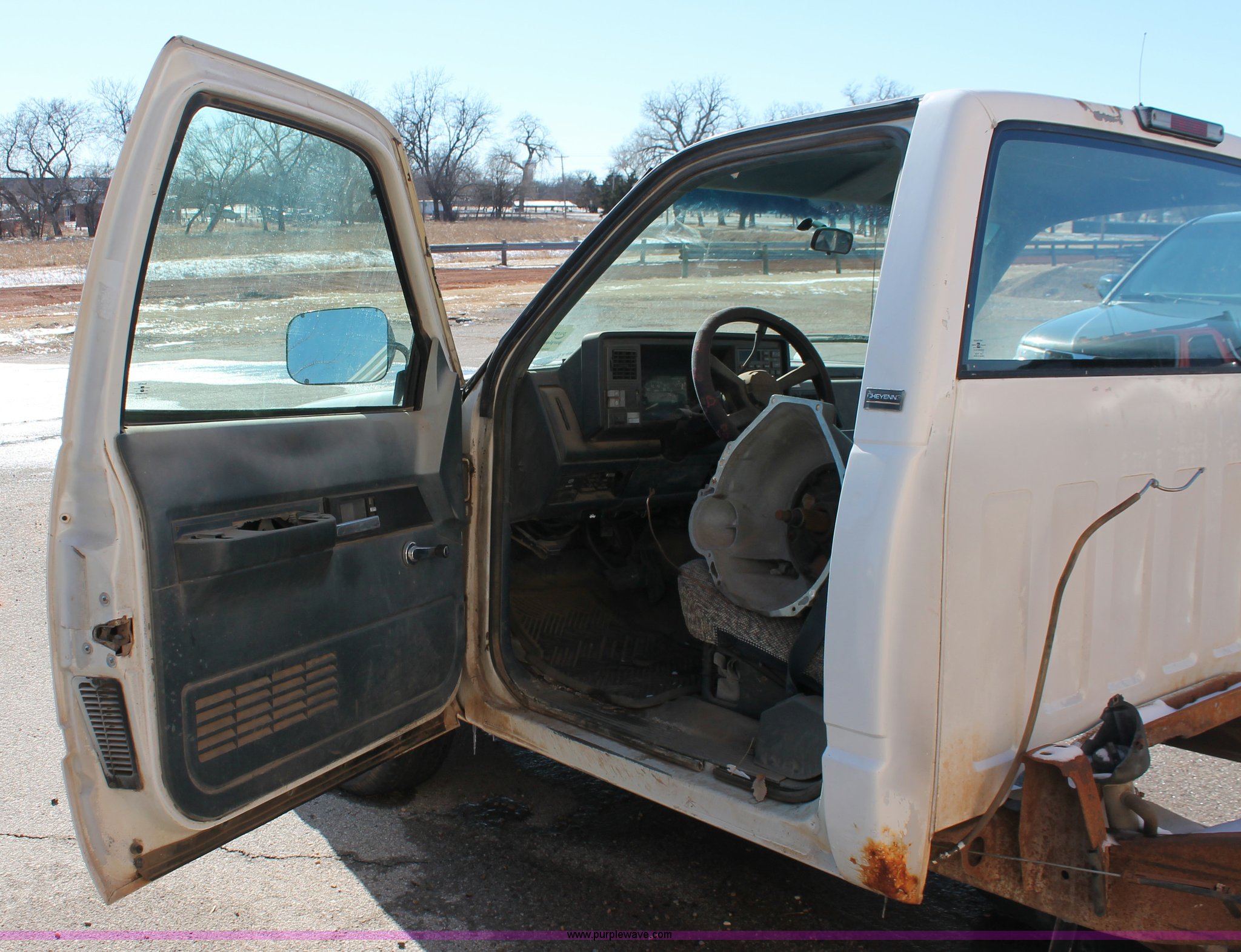 Purple Wave is selling a used Wrecked and Abandoned in Oklahoma. This item is a 1994 Chevrolet Cheyenne 1500 pickup truck cab and chassis with the following: 147,985 miles on odometer, 5.0L V8 VIH 16V gas engine, Automatic transmission, AC and heat, AM/FM, Manual windows and locks, 215/70R15 tires, Missing passenger door, rear wheels, taillights, and more, Unknown running condition, Unit# PW-15
