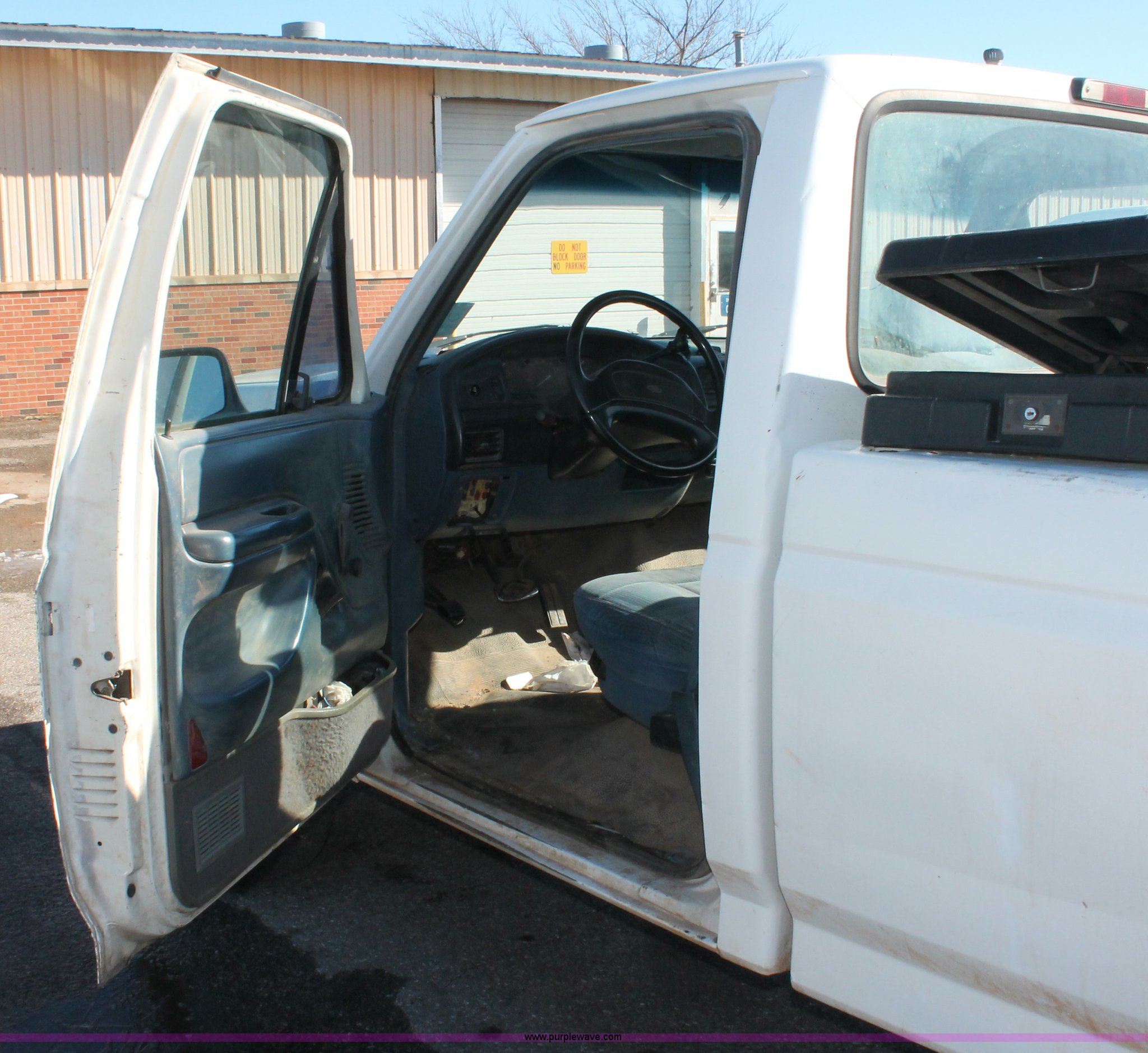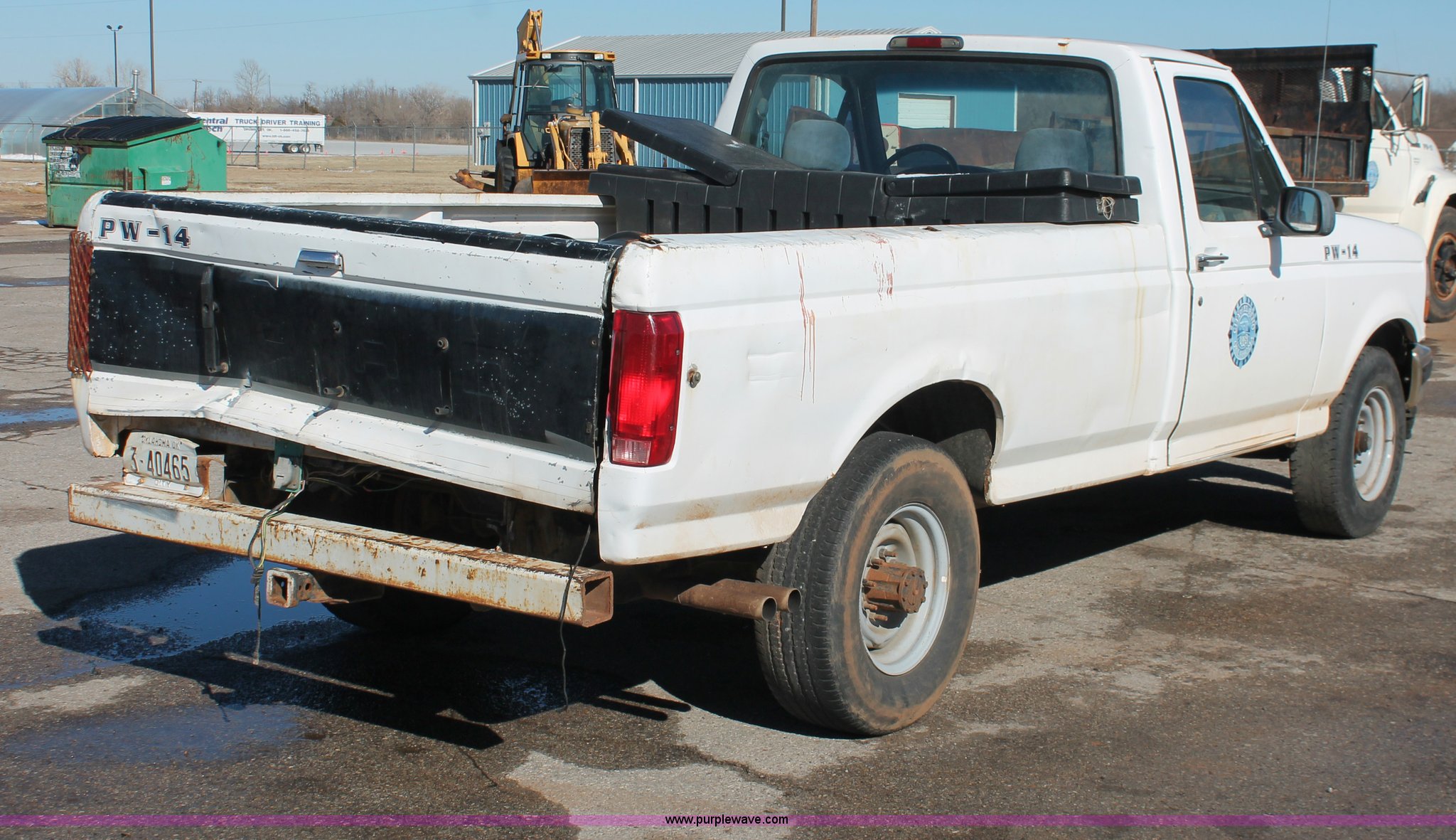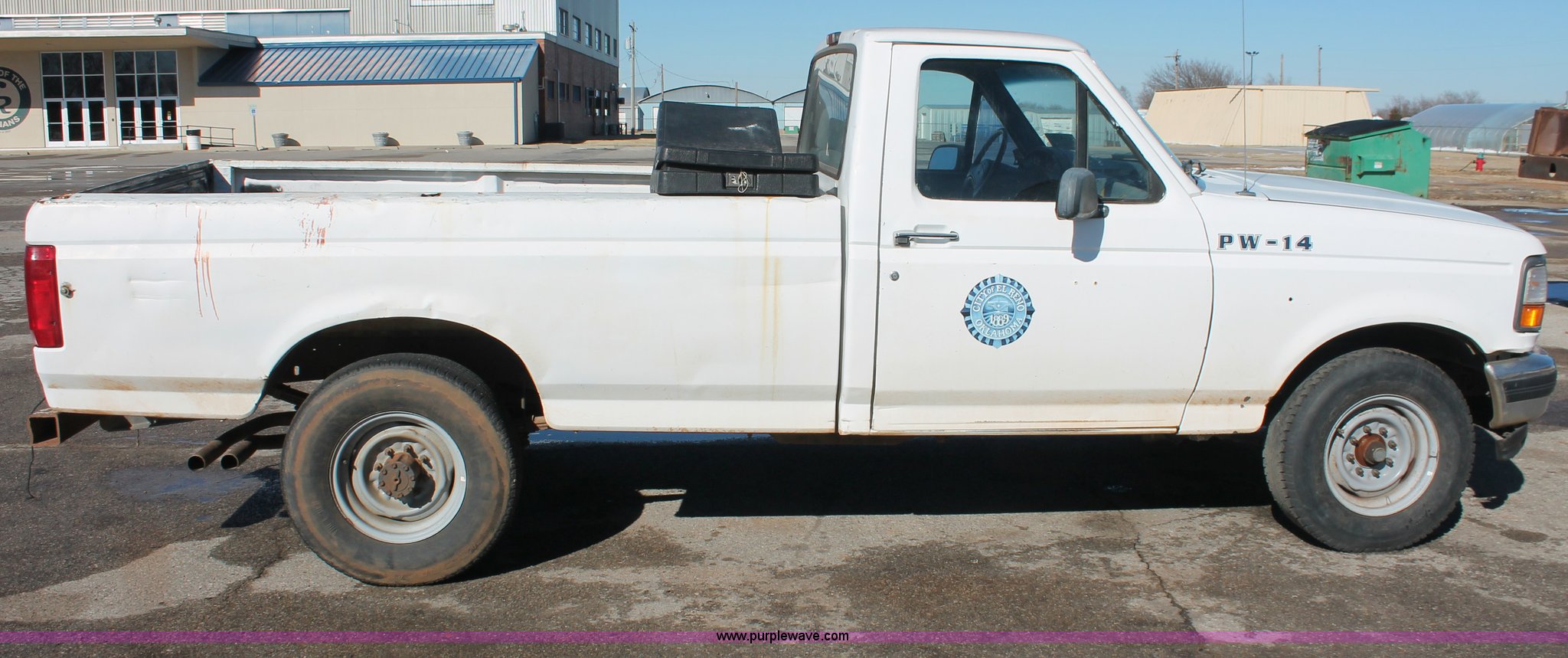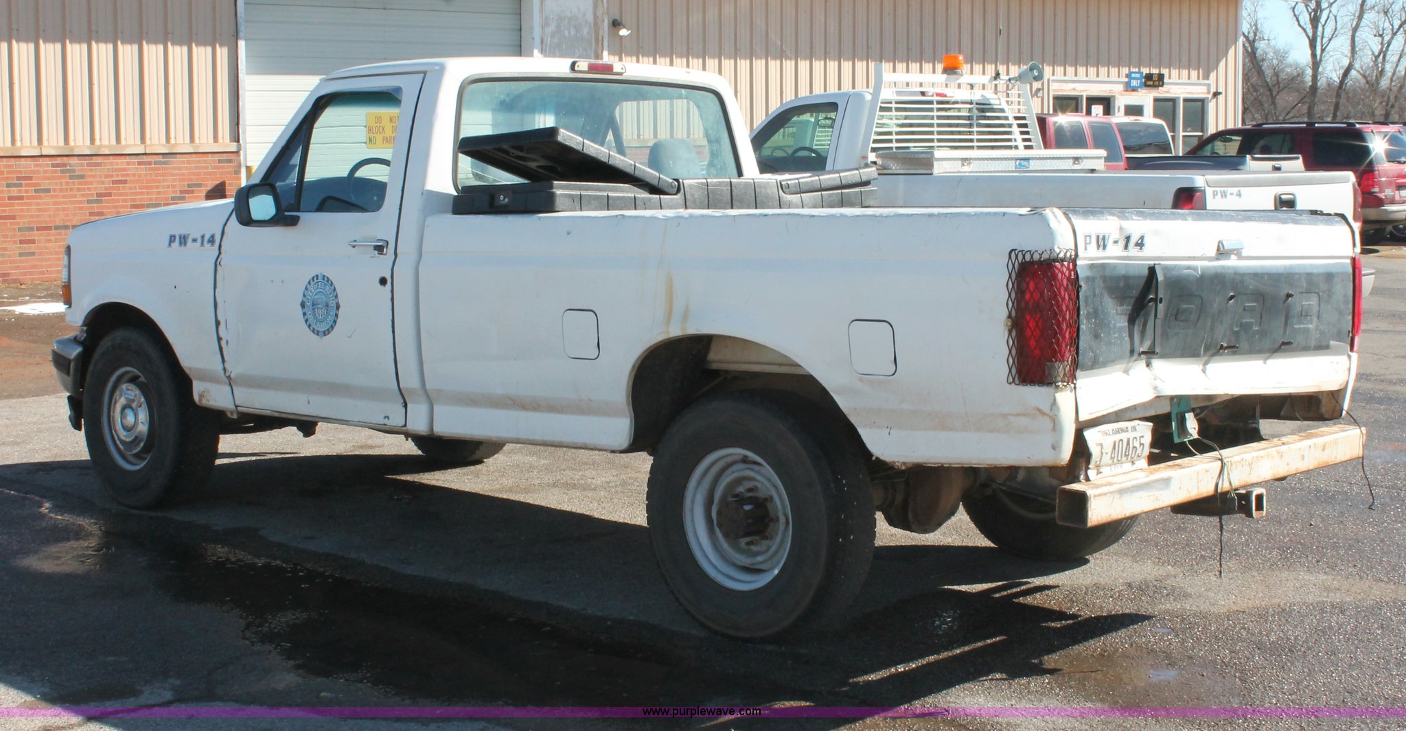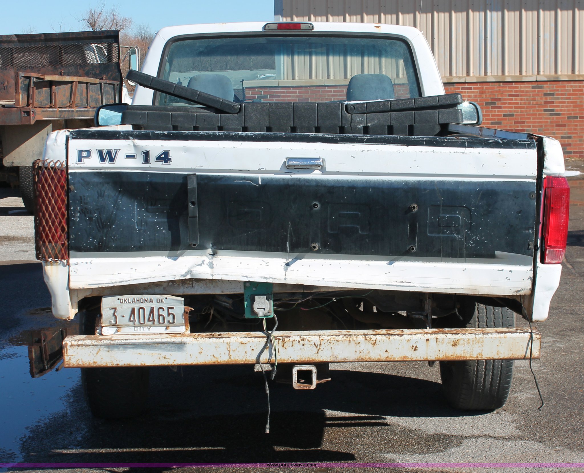 Purple Wave is selling a used 1/2 Ton Pickup or Van in Oklahoma. This item is a 1997 Ford F250 pickup truck with the following: Unknown miles on odometer, 5.8L V8 OHV 16V gas engine, Automatic transmission, Heat, AM/FM, Manual windows and locks, Cloth interior, Poly toolbox, Receiver hitch, Trailer wiring, LT215/85R16 tires, Undiagnosed transmission issues, Interior/exterior cosmetic damage, Tailgate damage, Driver's door lock missing, Cracked windshield, Weak battery, Unit# PW-14