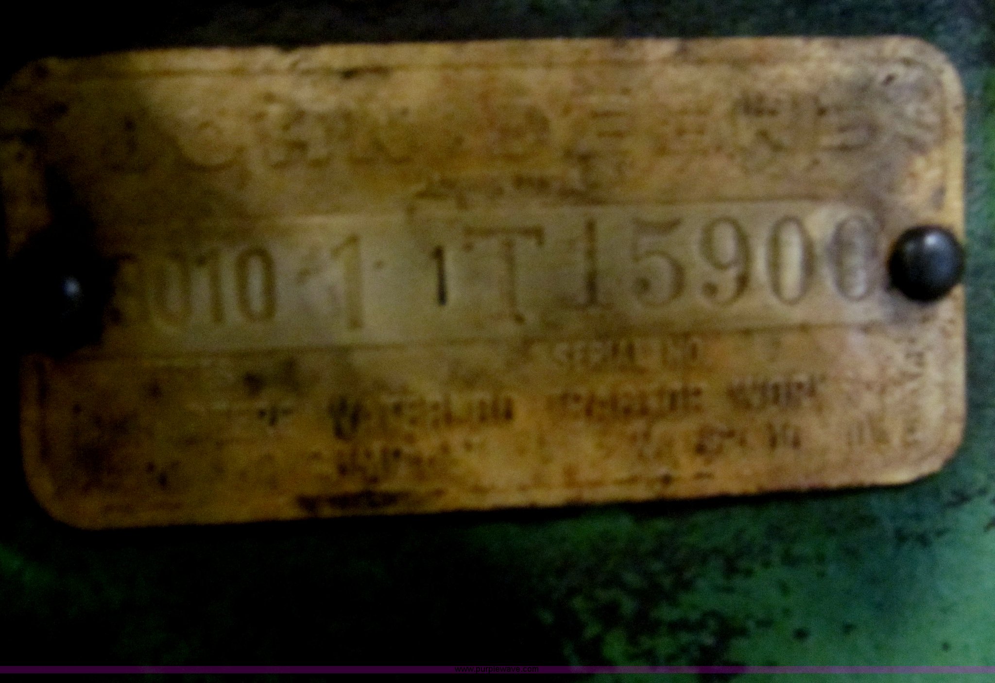 1962 John Deere 3010 tractor. 2,242 hours on meter, John Deere 3.3L four cylinder LP engine, Synchro transmission 8F-3R gears, Three point, Draw bar, 540 PTO, (2) rear hydraulic remotes, 7.50-16 front tires, 13.6-38 rear tires, Serial 15900. Northwest Kansas Technical College. 1209 Harrison. Goodland, KS 67735