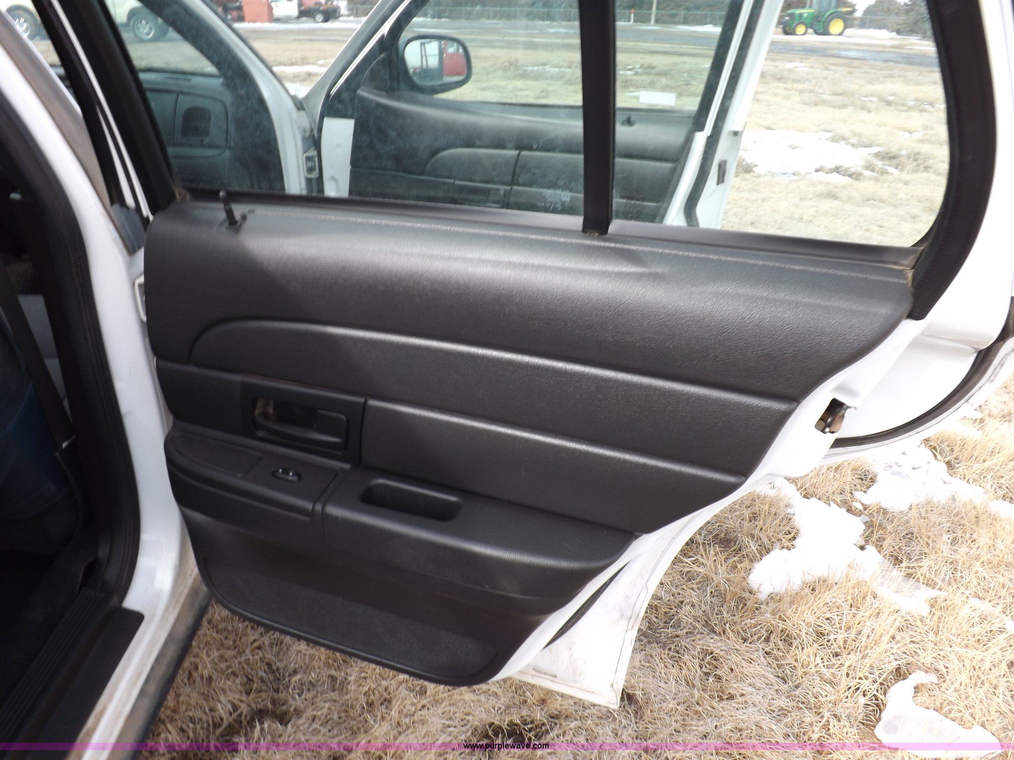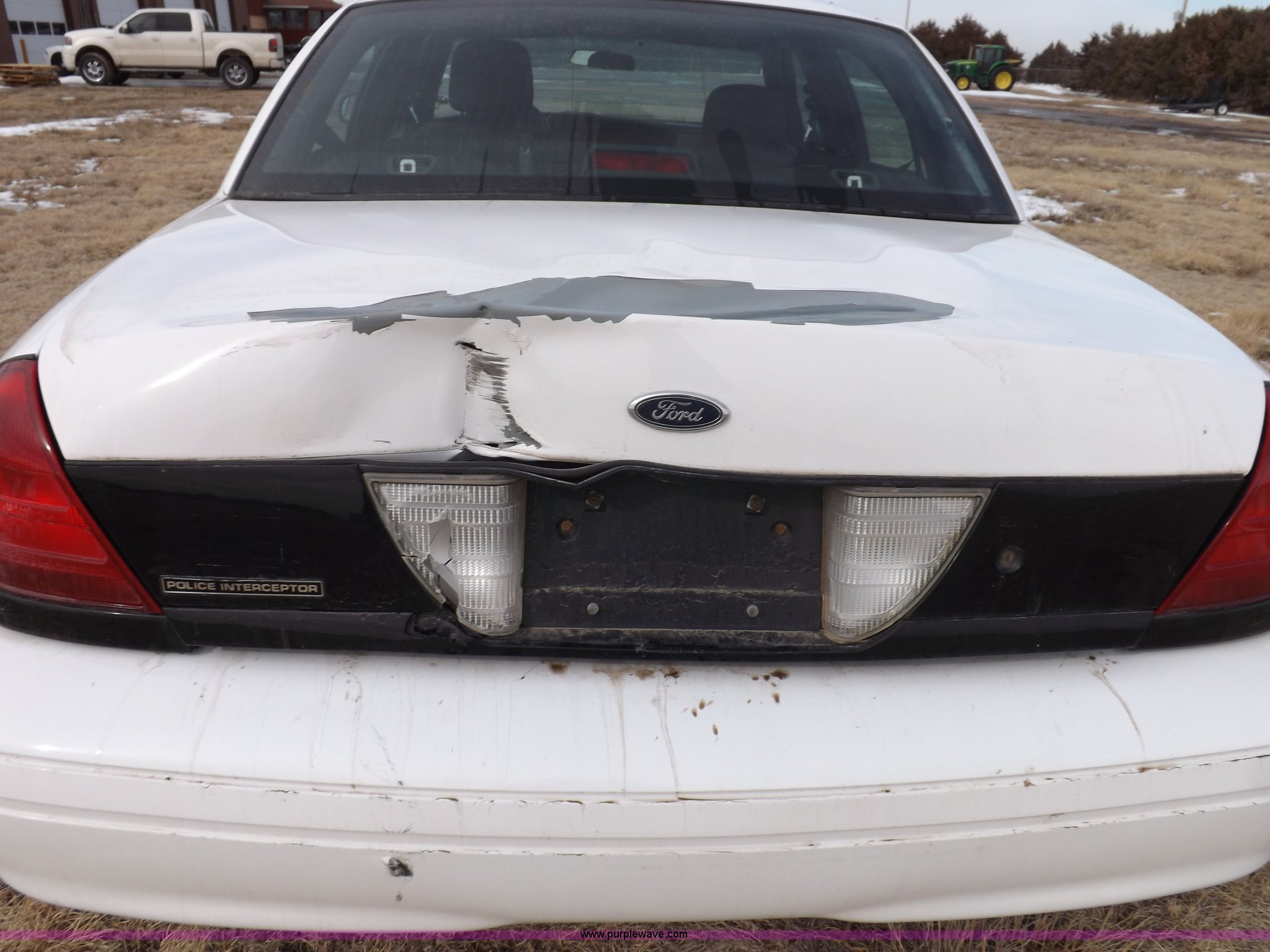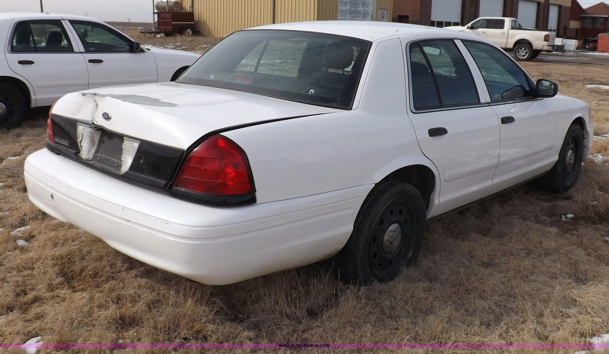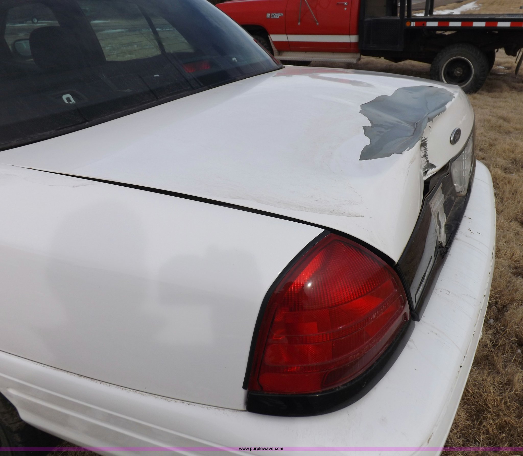 Purple Wave is selling a used Passenger Vehicle in Kansas. This item is a 2008 Ford Crown Victoria Police Interceptor with the following: 128,784 actual miles, 4.6L V8 SOHC 16V FFV gas engine, Automatic transmission, Transmission in April 2012, AC and heat, Tilt, Cruise, AM/FM/CD, Power windows, locks, mirrors, and seats, Cloth interior, Law Enforcement package, Spotlight, 235/55R17 tires, Dead battery, Needs repairs, Velcro on dash, Rear trunk and bumper damage, Right rear tire flat, Point damage, Roof drilled