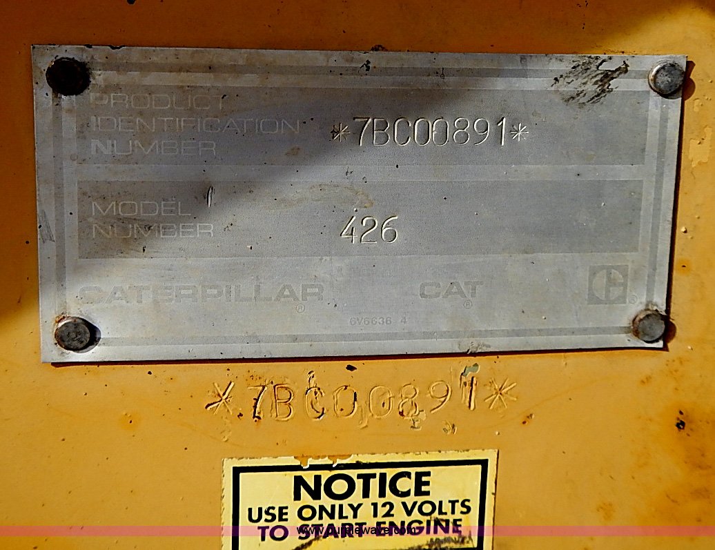 1987 Caterpillar 426 backhoe. 10,842 hours on meter, Caterpillar four cylinder diesel engine Type: 7C6075, Serial U154276P, Shuttleshift transmission 4F-1R gears, Type 9W7920, Serial C71542, Heat, Front and rear work lights, Joystick loader controls, Four lever backhoe controls, 86.5" x 30" x 30" loader bucket Bolt-on cutting edge, (4) top mounted hooks, 15' maximum backhoe reach 39" x 24" backhoe bucket Five bolt-on teeth, Rear outrigger pads, 11L-16 front tires, 19.5-24 rear tires, 14,254 lbs. base operating weight, Operator's manual, Windshield cracked, Has been shedded the last two years, Brakes need replaced, Minor oil leaks, Serial 7BC00891. View equipment video. 2979 Main Street. Talmage, KS 67482