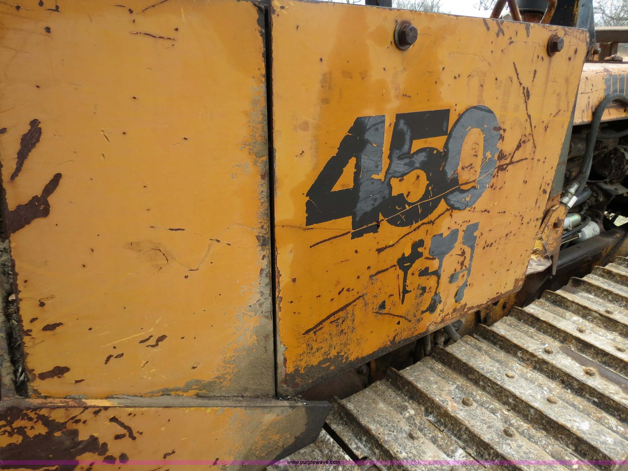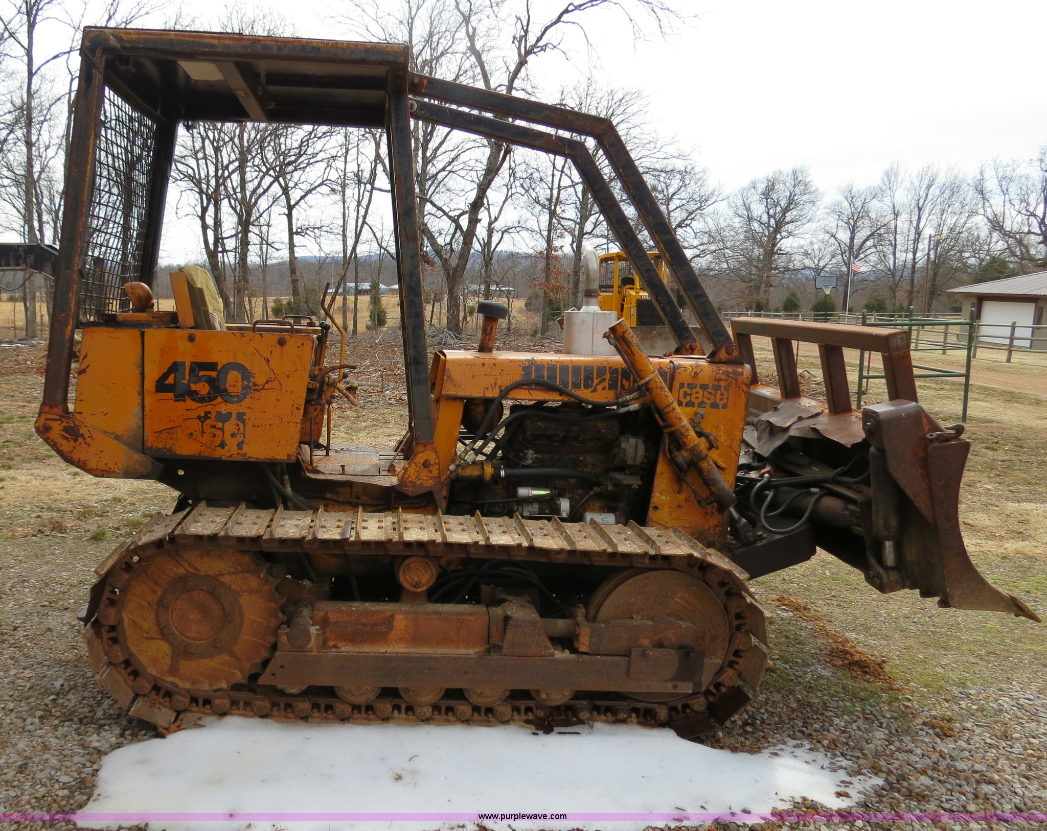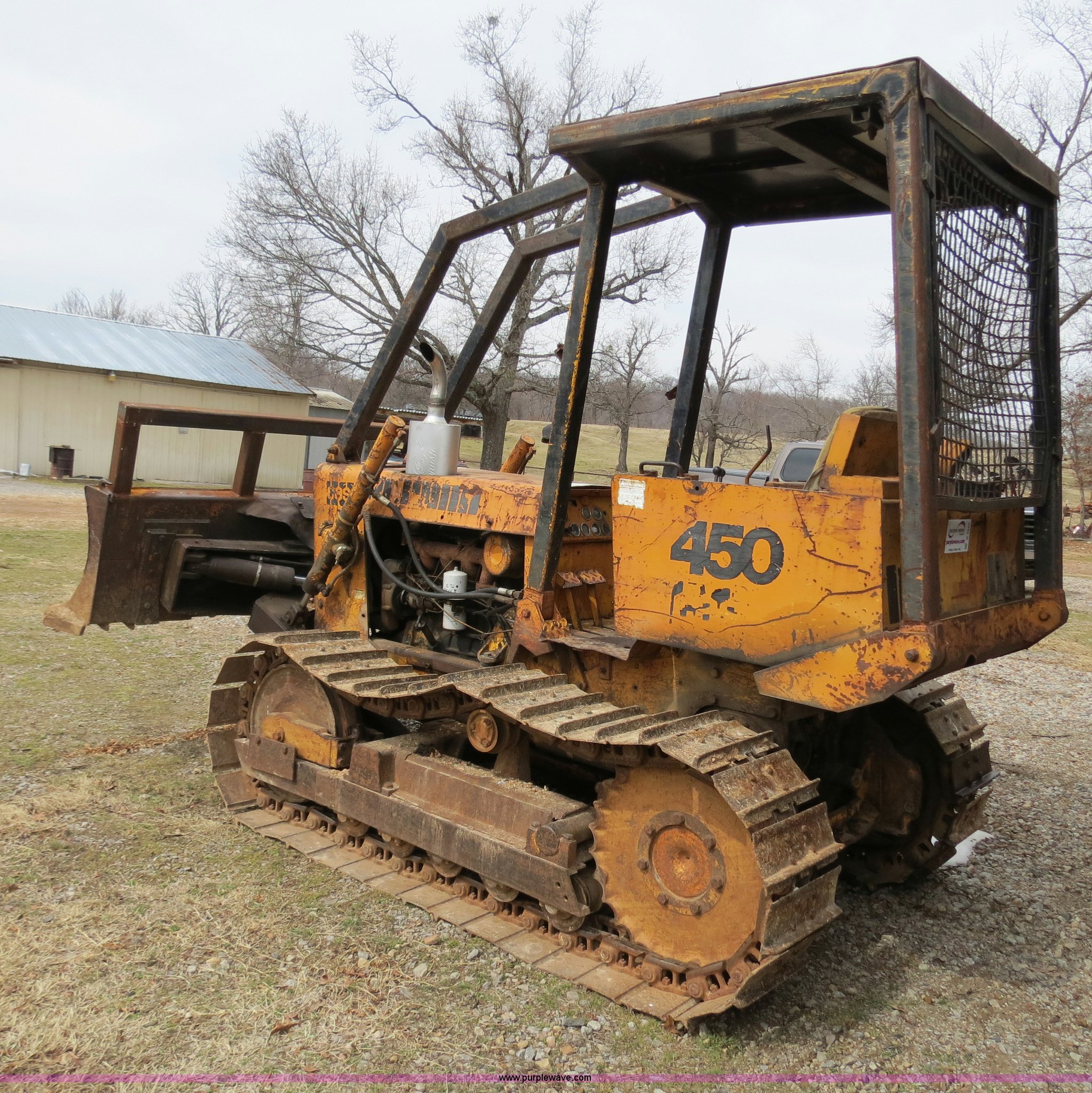 Purple Wave is selling a used Crawler Dozer in Oklahoma. This item is a Case 450 dozer with the following: Unknown hours on meter, Case four cylinder diesel engine, Engine work done one year ago, Hydrostatic transmission, Canopy, Sweeps, Rear screen guard, 88"W S-dozer six-way blade, Angle, Tilt, (5) bottom rollers, 16"W single grouser tracks, Needs battery