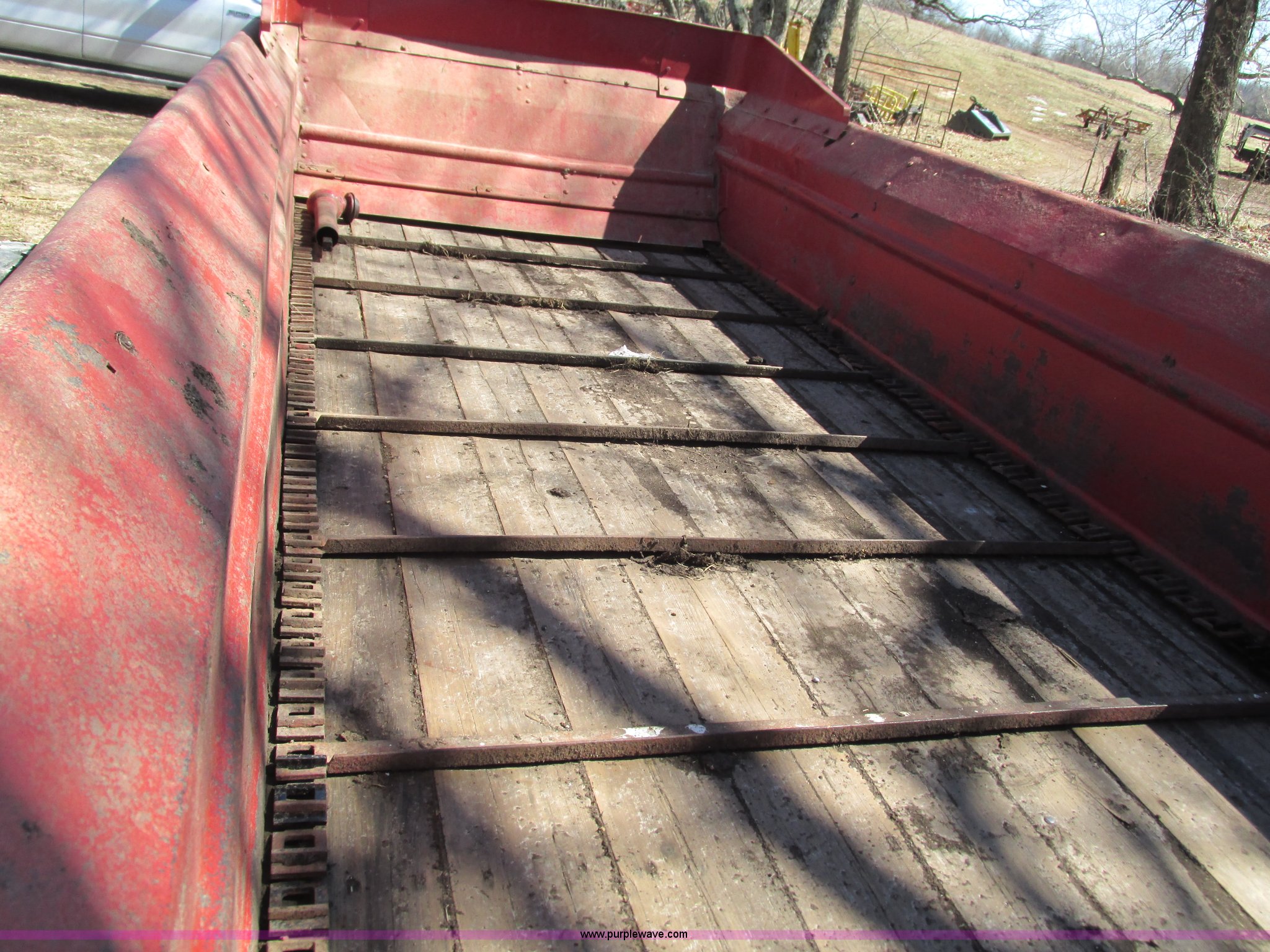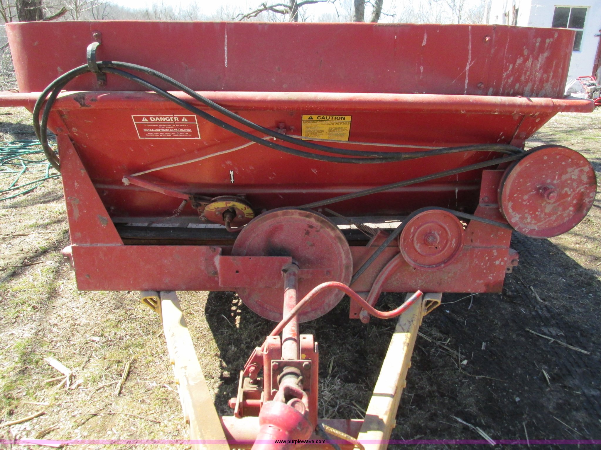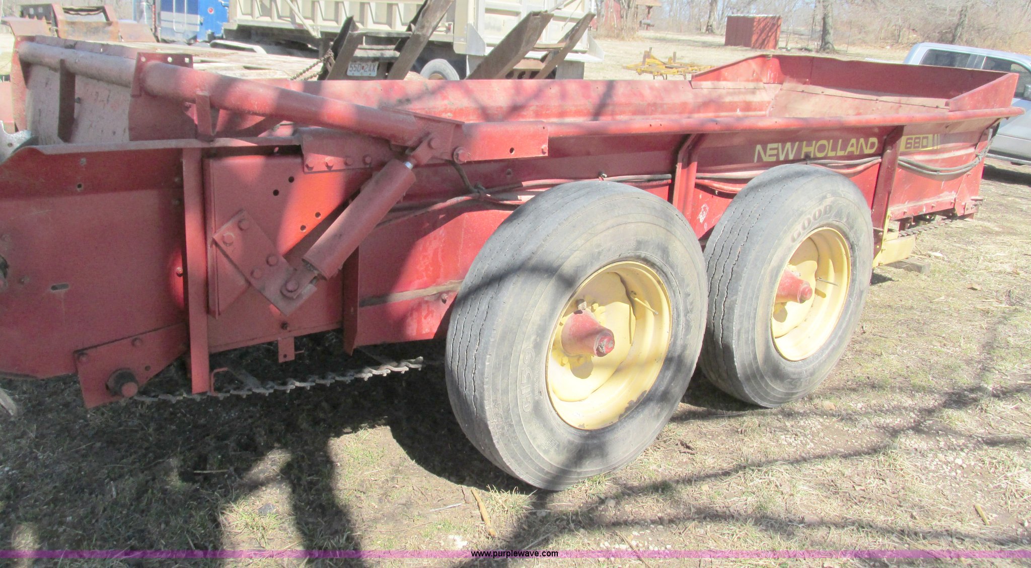Purple Wave is selling a used Manure Spreader in Missouri. This item is a New Holland 680 manure spreader with the following: Approx. 170"L x 60"W, Wood floor, 540 PTO, Pin hitch, Jack stand, 9R20 tires, Weather cracks on tires