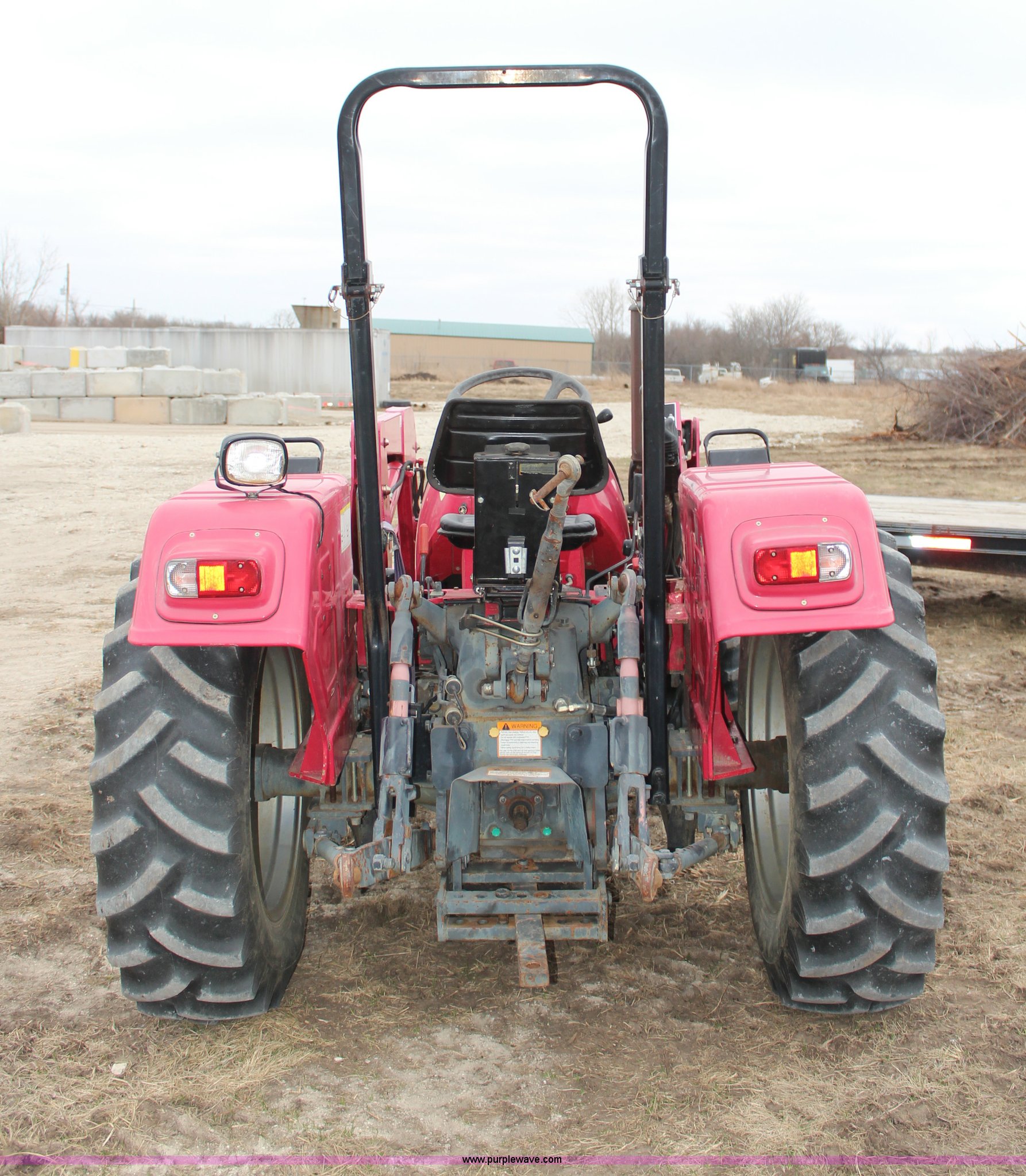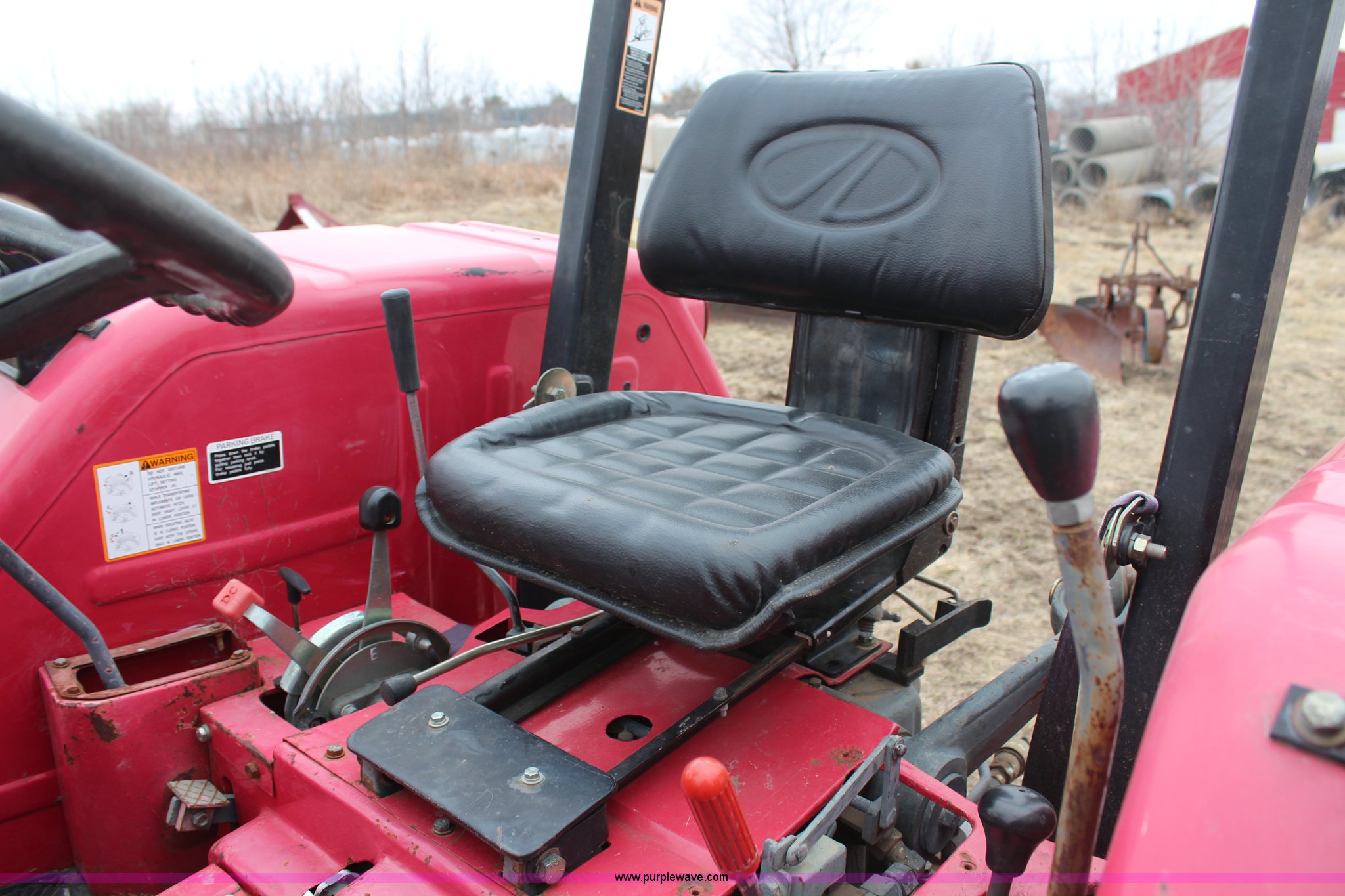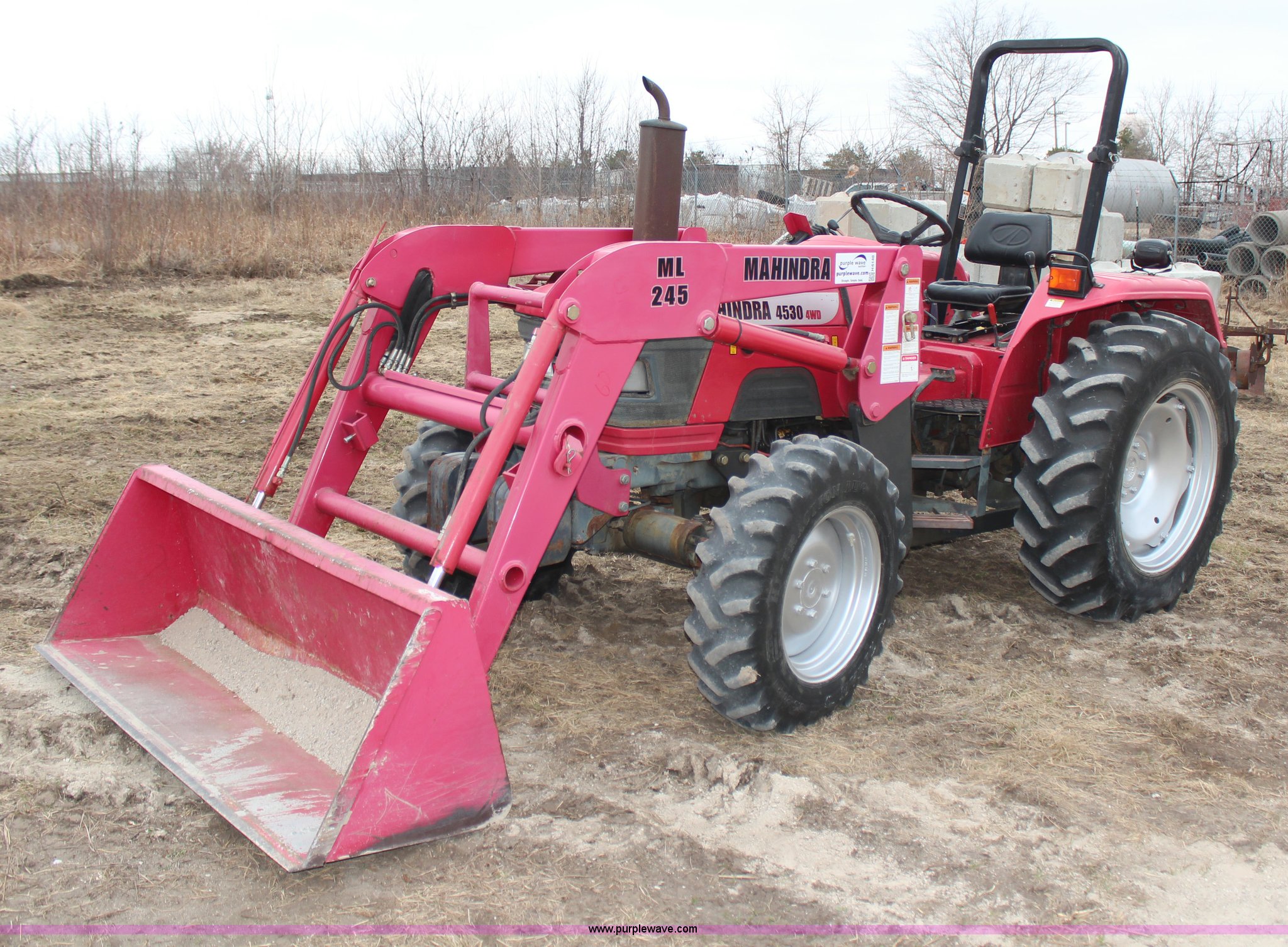 Purple Wave is selling a used Tractor in Kansas. This item is a 2001 Mahindra 4530 MFWD tractor with the following: 440 hours on meter, Mahindra 2.4L three cylinder diesel engine, 42 HP, Synchro shuttle shift transmission, 8F-8R gears, ML245 loader, 6'W bucket, Joystick controls, Three point, Draw bar, 540 PTO, One rear hydraulic remote, (6) suitcase weights, 17.1 gallon fuel tank, 9.5-20 front tires, 13.6-20 rear tires, 5,720 lbs. base operating weight, Serial USM1006