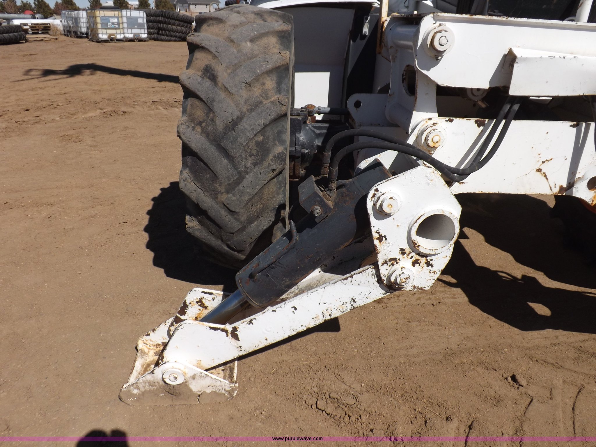 2003 Bobcat T40140 telehandler. 5,547 total hours on meter 5,189 hours on first meter, 358 hours on second meter, Perkins 1932/2200 four cylinder turbo diesel engine 74.5 kW, Serial AKS1383,U597759K, Hydrostatic transmission, Four wheel drive, Crab steer, Circle steer, 40'L reach length, (3) boom sections, 47"L forks Holes cut in forks, Quick attach forks, 4,000 kg lift capacity, Hydraulic outriggers, Hydraulic leveling, 15.5/80-24 left front and right rear tires, 400/80-24 right front and left rear tires, 10,000 kg base operating weight, Overhead window cracked door missing, Brake lever missing, Serial 360315041. View equipment video. 1587 Cottonwood. Sublette, KS 67877