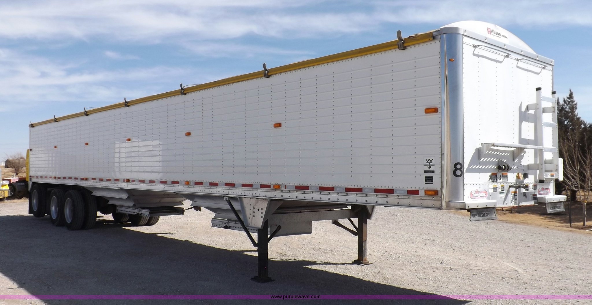 Purple Wave is selling a used Grain or Commodity Trailer in Kansas. This item is a 2011 Wilson DWH550 Pace Setter double hopper grain trailer with the following: 50'5"L x 8'W x 15'H, 72"H sides, Shurlok rollover tarp system, Air operated load indicator gauges, Front and rear ladders, platforms, and hand rails, Houston Vibrator Inc. pneumatic hopper vibrator, Approx. 10' 3/8" hose and valve, Dual leg two speed landing gear, Air suspension, Triple axle, 80" third axle spread, Aluminum wheels, Recently replaced 285/75R24.5 tires, GVWR 75,000 lbs