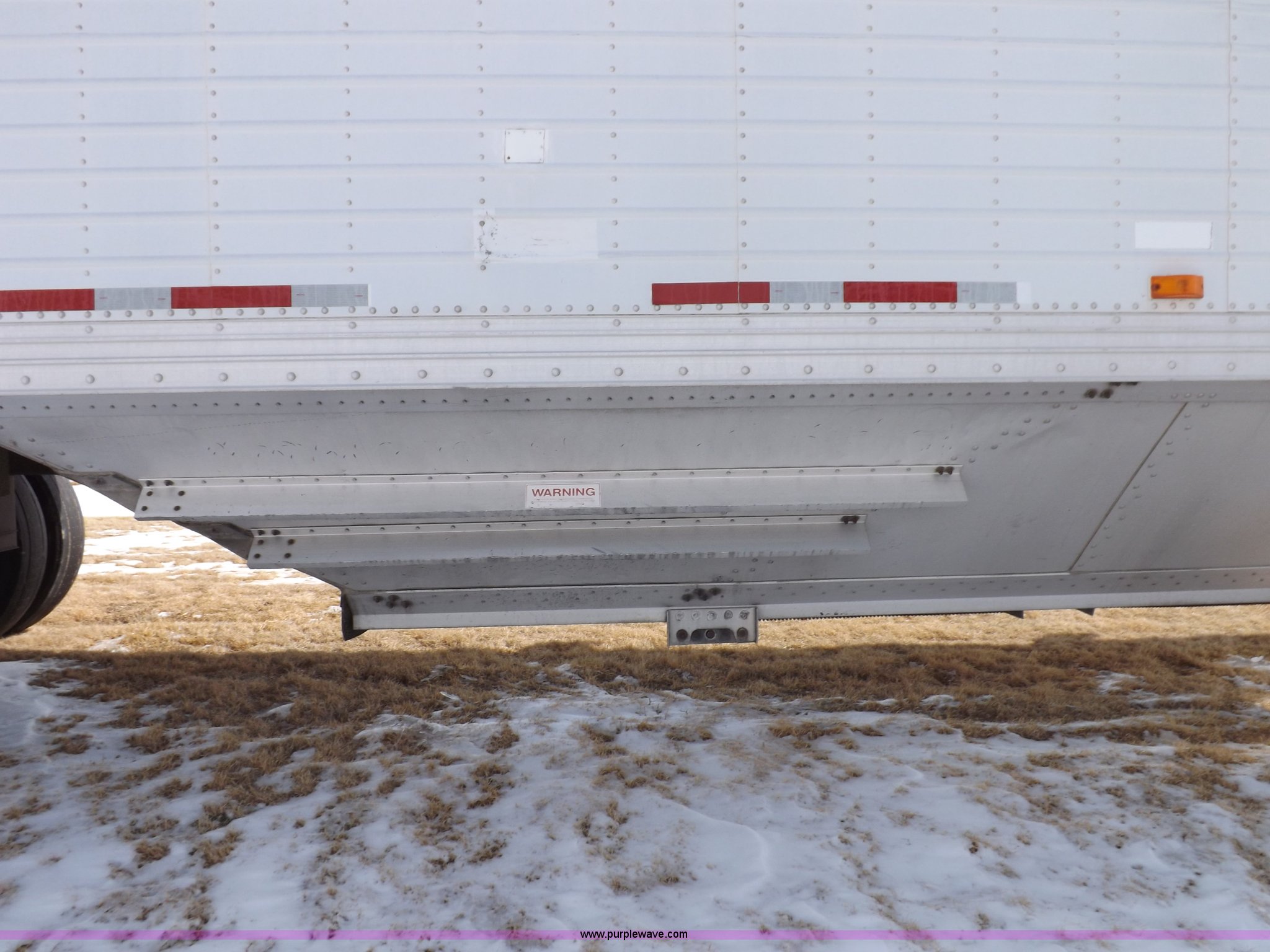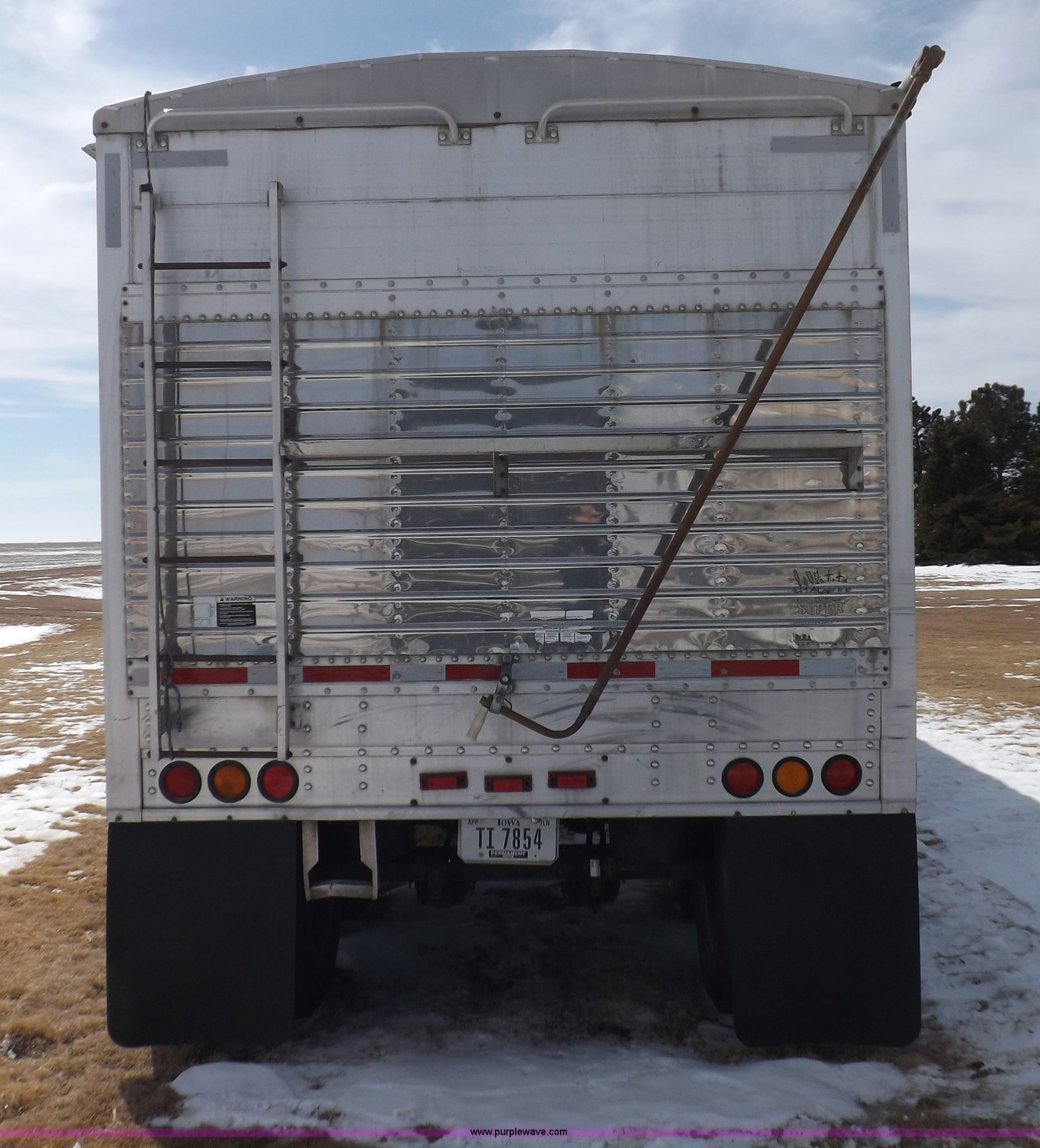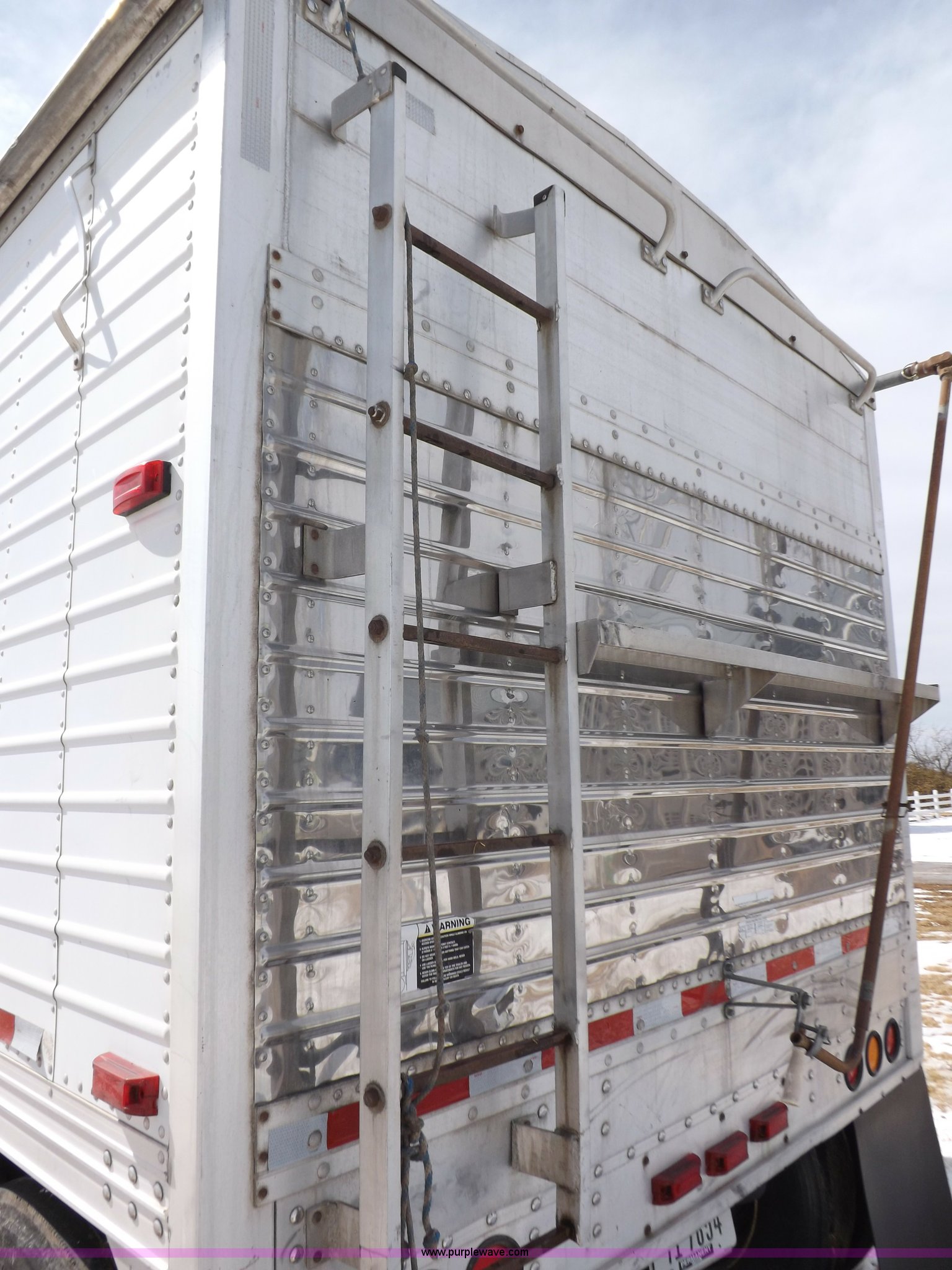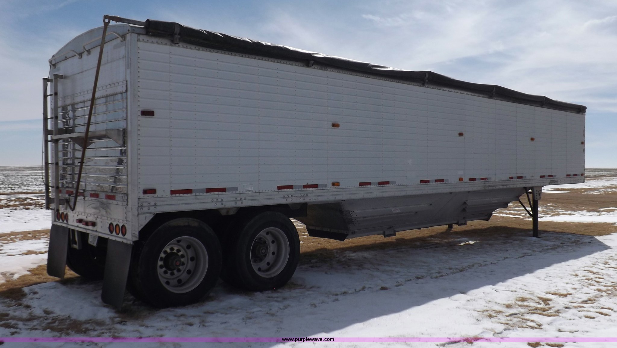 Purple Wave is selling a used Grain or Commodity Trailer in Kansas. This item is a 1998 Timpte Super Hopper grain trailer with the following: 43'L x 8.5'W x 10'8"H, 77"H sides, Rollover tarp, Recently replaced tarp, Front and rear ladders and platforms, Vibrator mounting brackets, Load cell equipped, Dual leg two speed landing gear, Air suspension, Aluminum wheels, 11R24.5 tires, Sides damaged, Load cell control door missing, Landing gear bracket weld broken, Rear damage, Rear ladder rungs have been replaced