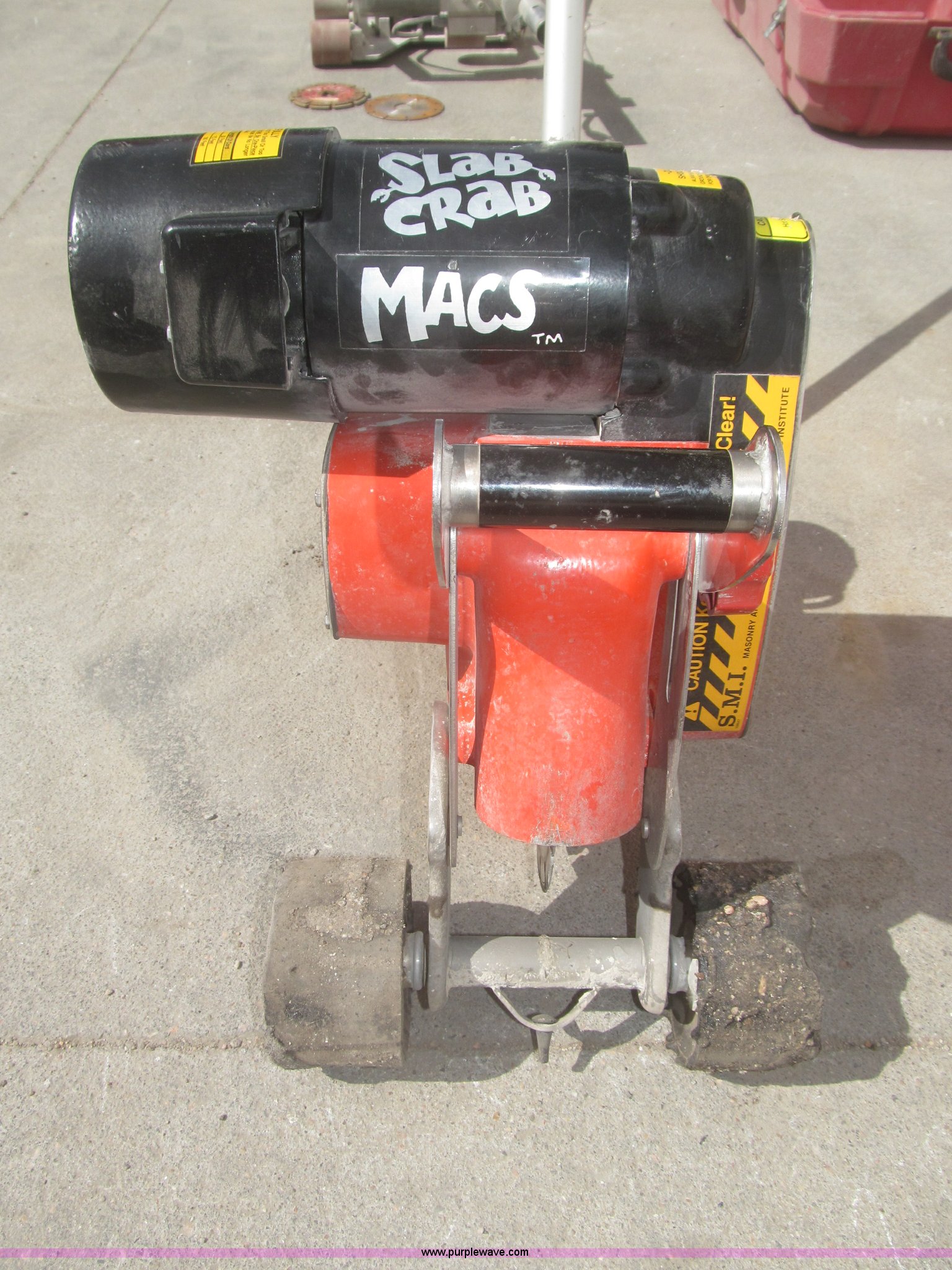 Purple Wave is selling a used Concrete Equip. or Acces. in Nebraska. This item is a Clipper Slab Crab self-propelled early entry saw with the following: 128.5 hours on meter, Baldor blade motor, Spec 31894J, Serial F029T665, Baldor continuous duty drive motor, Spec 31765, 20 amp three pront twist lock connector, (8) 8" diamond blades, Five unused, Three used, Plastic carrying case