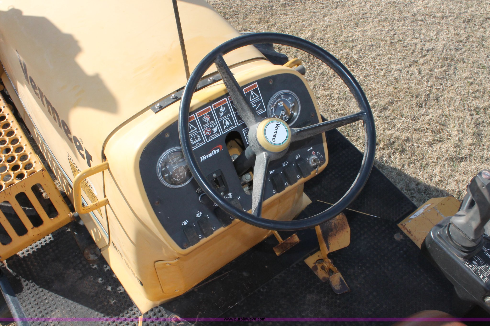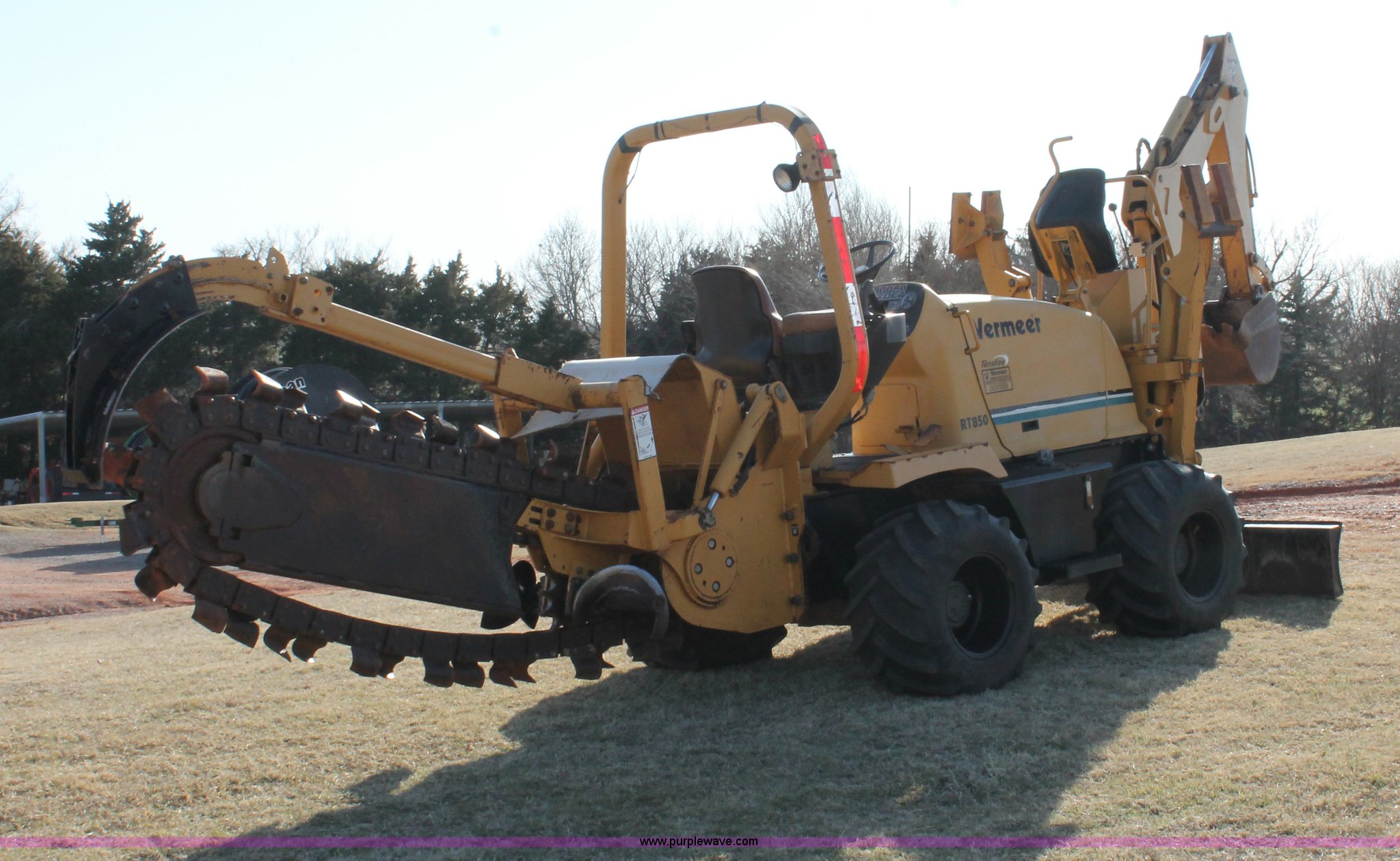 Purple Wave is selling a used Trencher or Rock Saw in Oklahoma. This item is a Vermeer RT850 trencher with the following: 1,695 hours on meter, 2001 John Deere PowerTech 4.5L diesel engine, Model 4045DF150, 63 kW output, Serial PE4045D144710, Hydrostatic transmission, Hi-Lo, Locking differential, OROPS, Four wheel steer, Auto dig, Manual or auto rear end, Vermeer 8300 backhoe, Serial 1VRW080N711000190, Hydraulic outriggers, Terrafire 18"W bucket, (4) bolt-on teeth, 75" six way blade, Vermeer TR300 trencher, 12" discharge auger, 11"W on current setting, 6' maximum digging depth, Serial 1VRW040P311000150, Titan 35 x 19.00-16 NHS tires, Serial 1VRW092C611000151