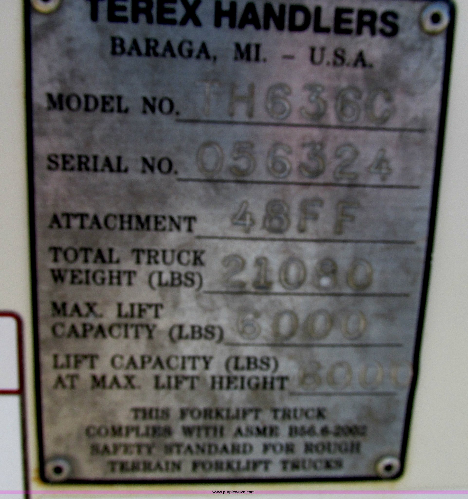 Purple Wave is selling a used Telehandler in Missouri. This item is a 2005 Terex TH636 telehandler with the following: 5,067 hours on meter, Hours may vary, unit is still in use, John Deere four cylinder turbo diesel engine, Powershift transmission, 3F-3R gears, Four wheel drive, Crab steer, Circle steer, 6,000 lbs maximum lift capacity, 36' maximum reach, Three boom sections, 48"L forks, Hydraulic leveling, 13.00-24 foam filled tires, 21,080 lbs. base operating weight, Service records available, Serial 056324, Unit# 3150