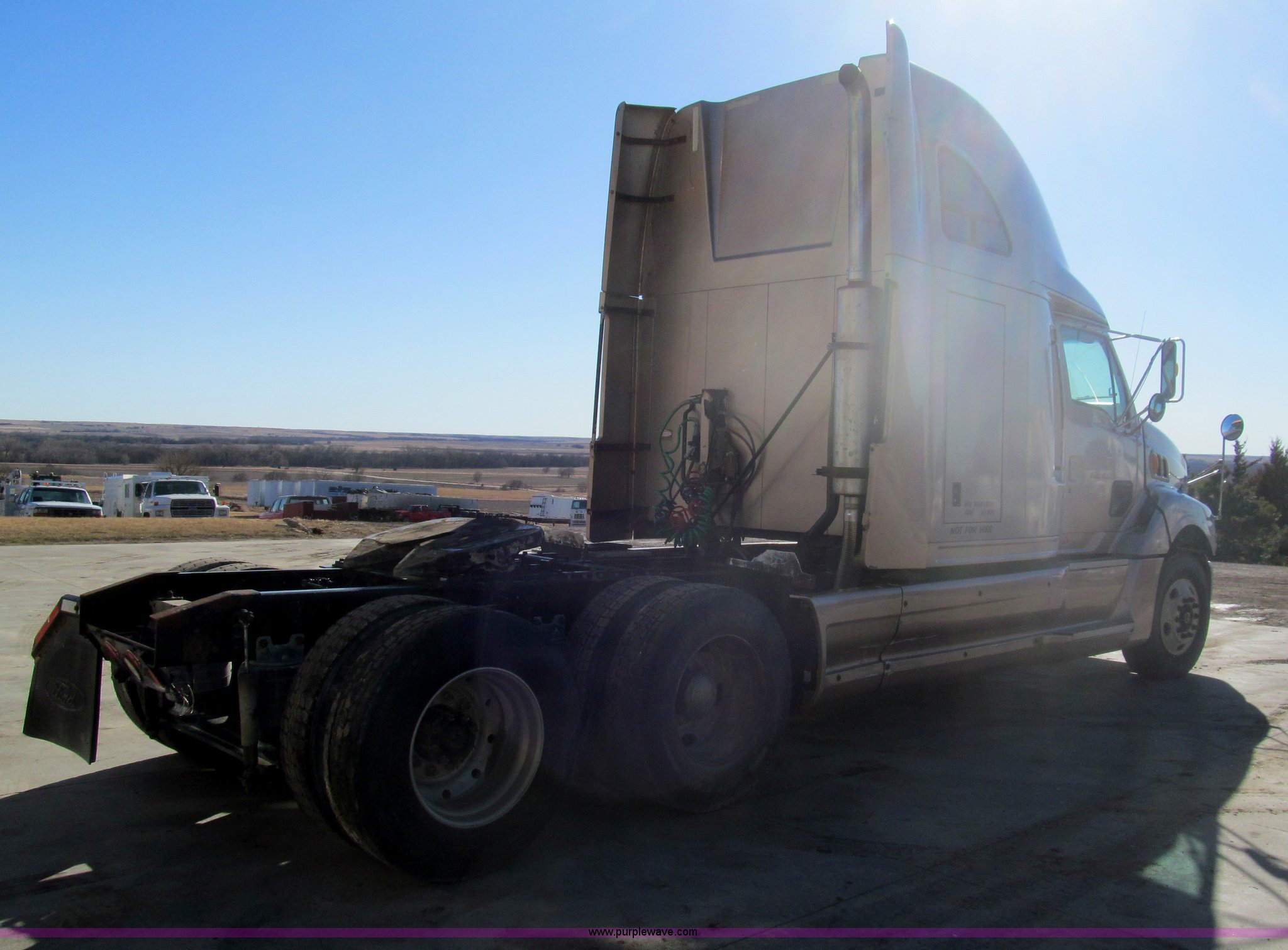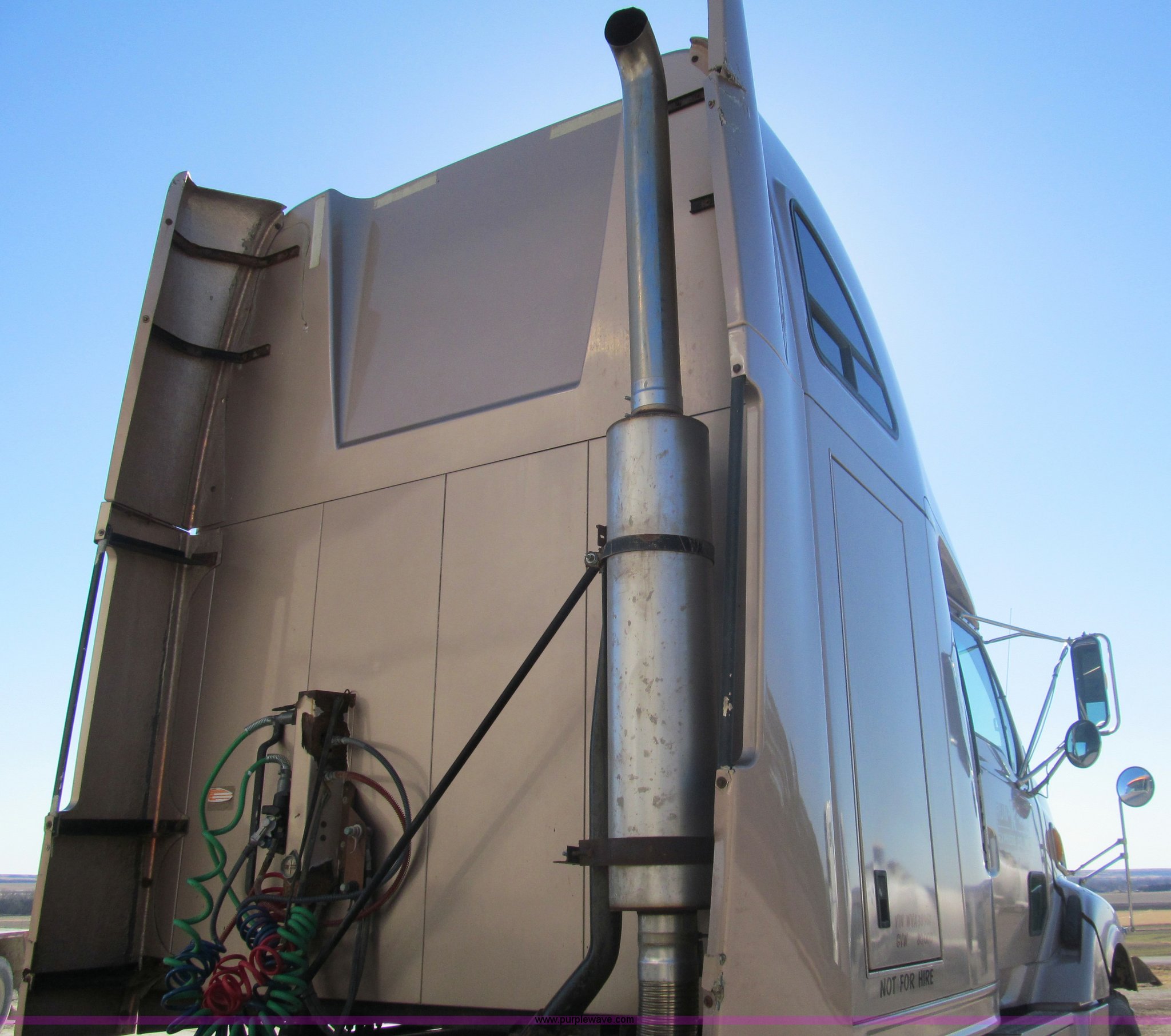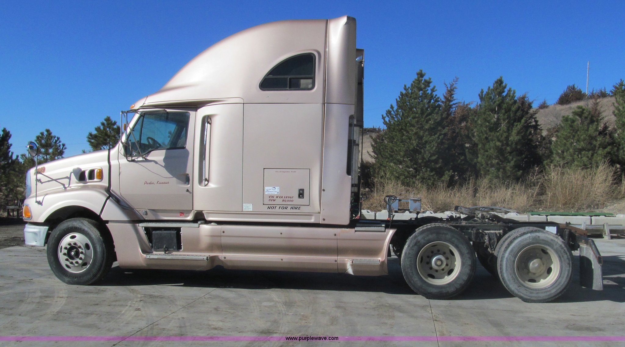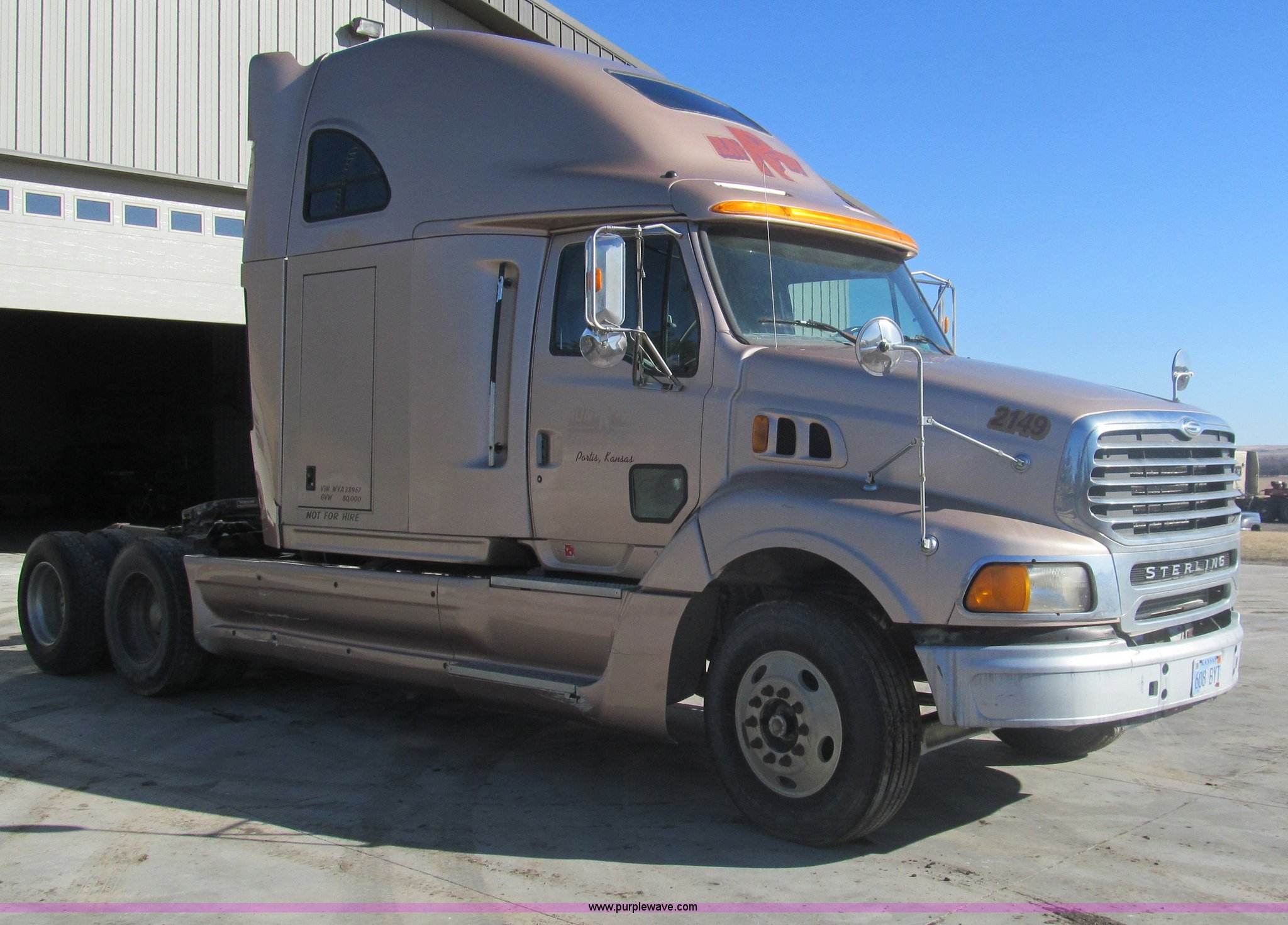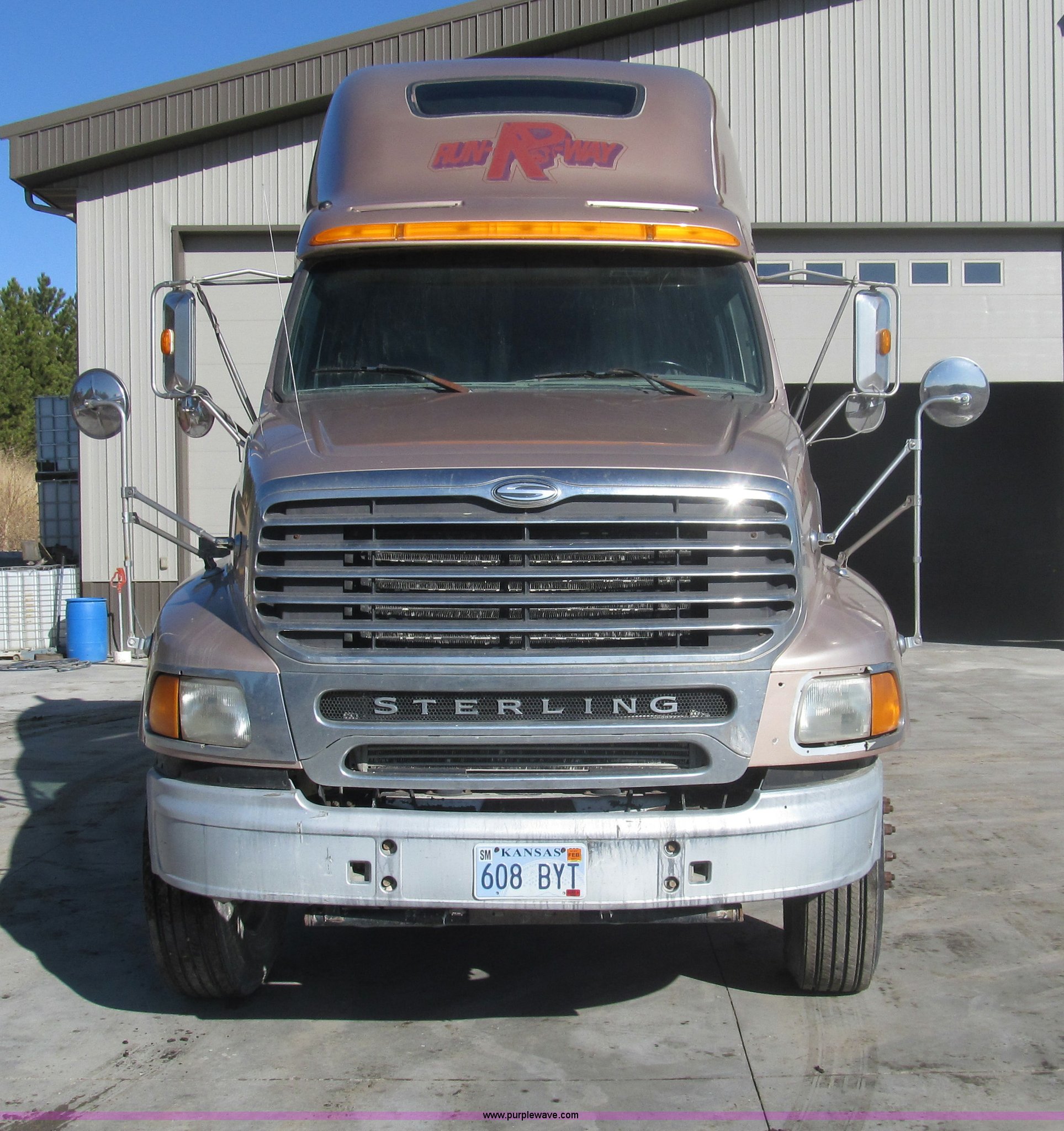 Purple Wave is selling a used Truck Tractor in Kansas. This item is a 1998 Sterling AT9522 semi truck with the following: 916,438 miles on odometer, Cummins N14 14.0L L6 diesel engine, Rockwell 10 speed manual transmission, Twin screw, AC and heat, Tilt, Cruise, AM/FM/CD, Passenger daylight door, Air suspension seat, Power windows, Heated mirrors, Visor, Air slide fifth wheel, Dual 120 gallon fuel tanks, Single rear exhaust stack, Aluminum deck plate, Full fenders, Single sleeper with storage, Dump valves, Air suspension, Air brakes, Jake brake, GVWR 52,000 lbs, FAWR 12,000 lbs, IAWR 20,000 lbs, RAWR 20,000 lbs, 275/80R22.5 tires, 232" wheel base, Exterior cosmetic damage