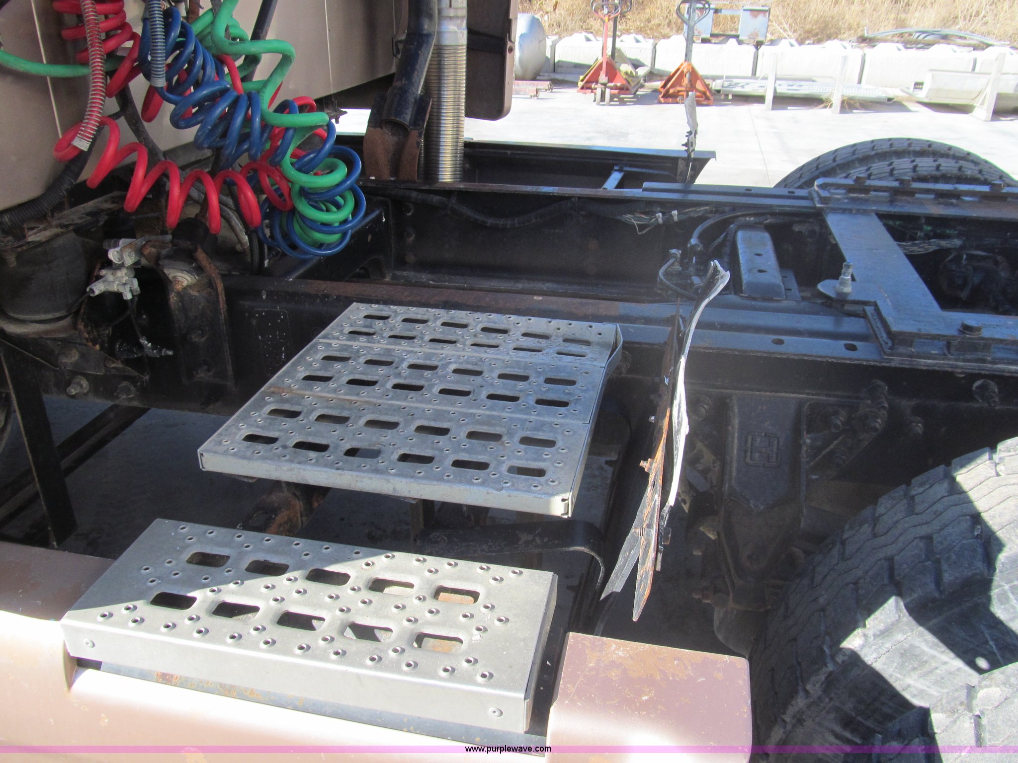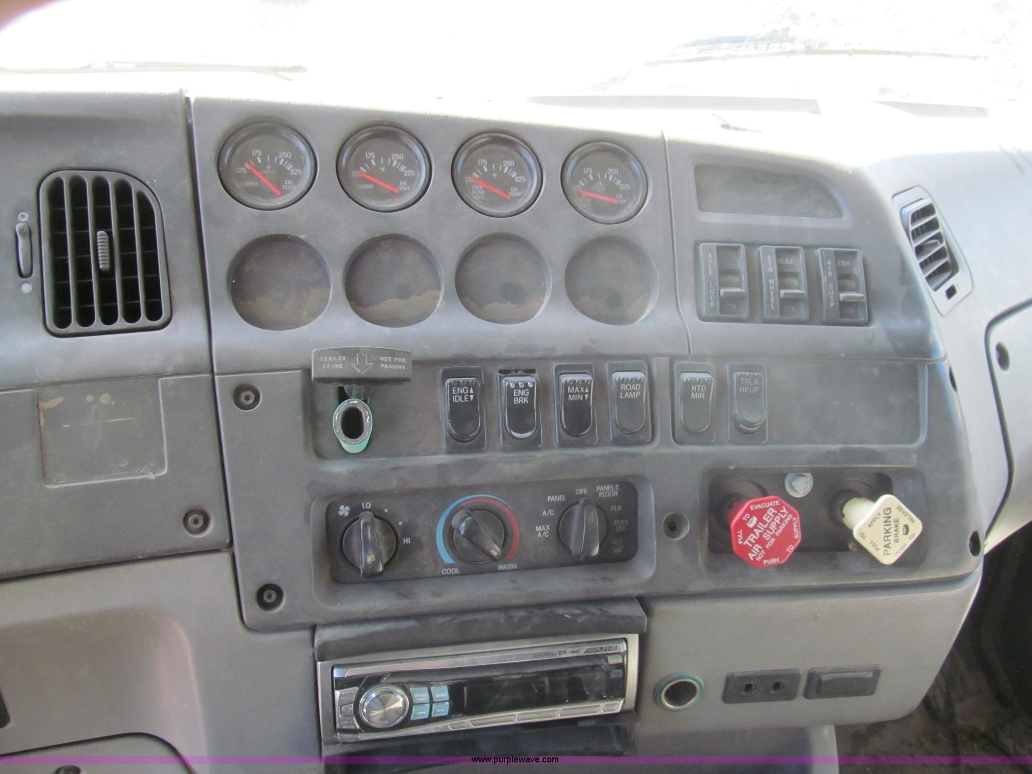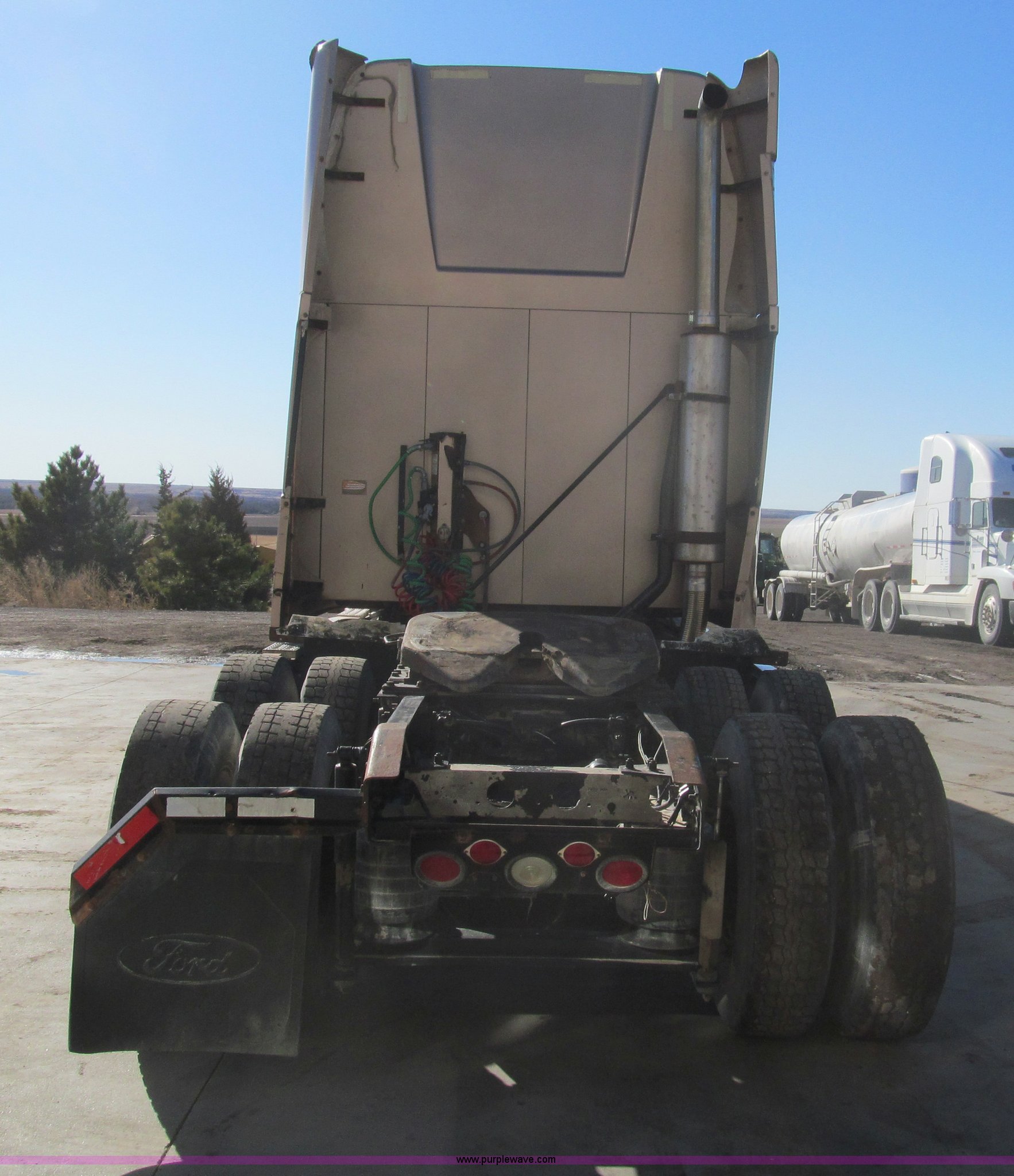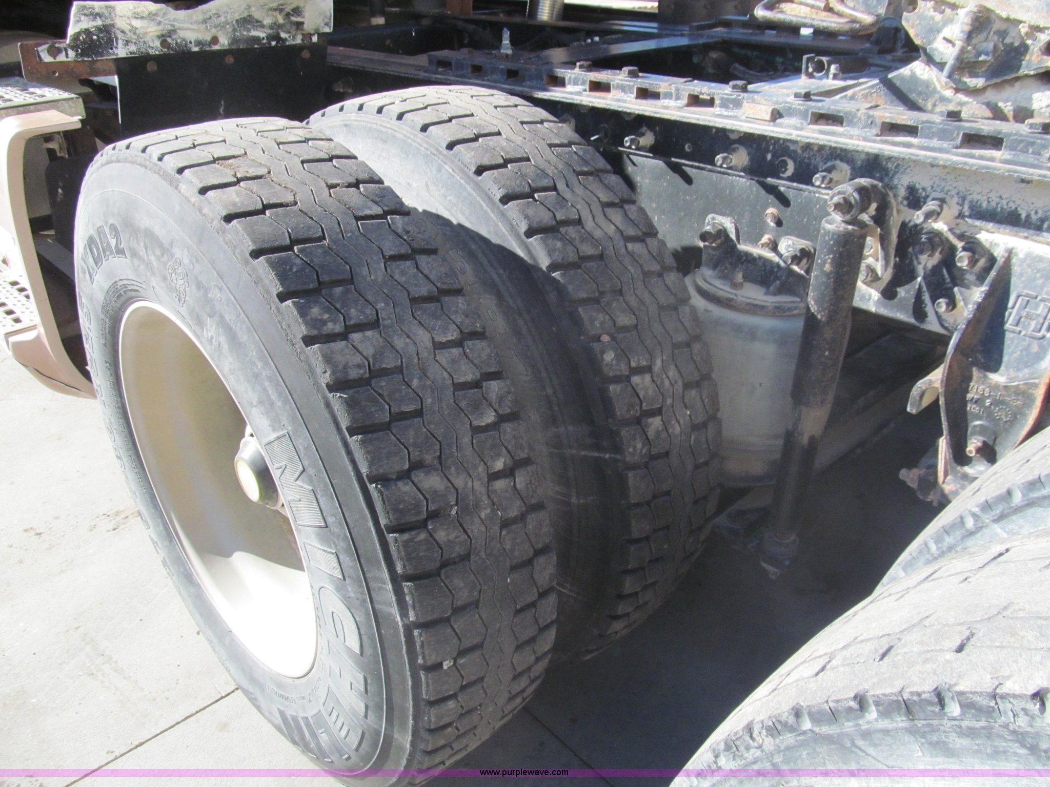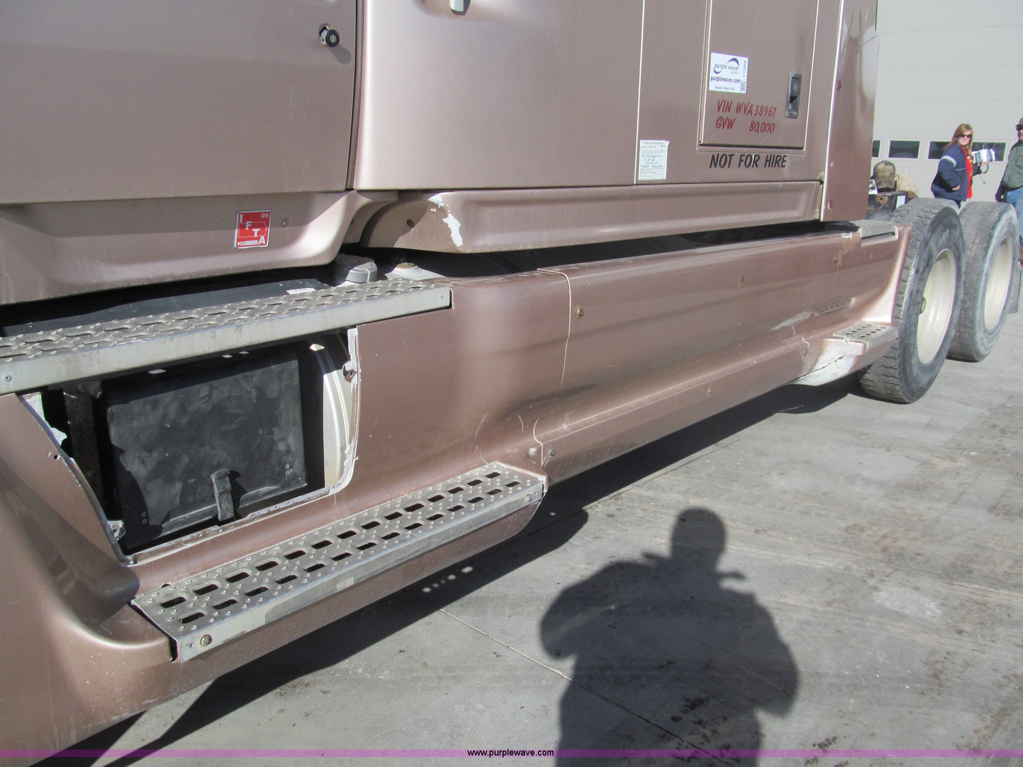 Purple Wave is selling a used Truck Tractor in Kansas. This item is a 1998 Sterling AT9522 semi truck with the following: 916,438 miles on odometer, Cummins N14 14.0L L6 diesel engine, Rockwell 10 speed manual transmission, Twin screw, AC and heat, Tilt, Cruise, AM/FM/CD, Passenger daylight door, Air suspension seat, Power windows, Heated mirrors, Visor, Air slide fifth wheel, Dual 120 gallon fuel tanks, Single rear exhaust stack, Aluminum deck plate, Full fenders, Single sleeper with storage, Dump valves, Air suspension, Air brakes, Jake brake, GVWR 52,000 lbs, FAWR 12,000 lbs, IAWR 20,000 lbs, RAWR 20,000 lbs, 275/80R22.5 tires, 232" wheel base, Exterior cosmetic damage