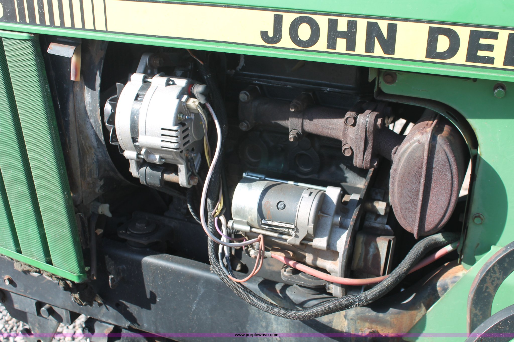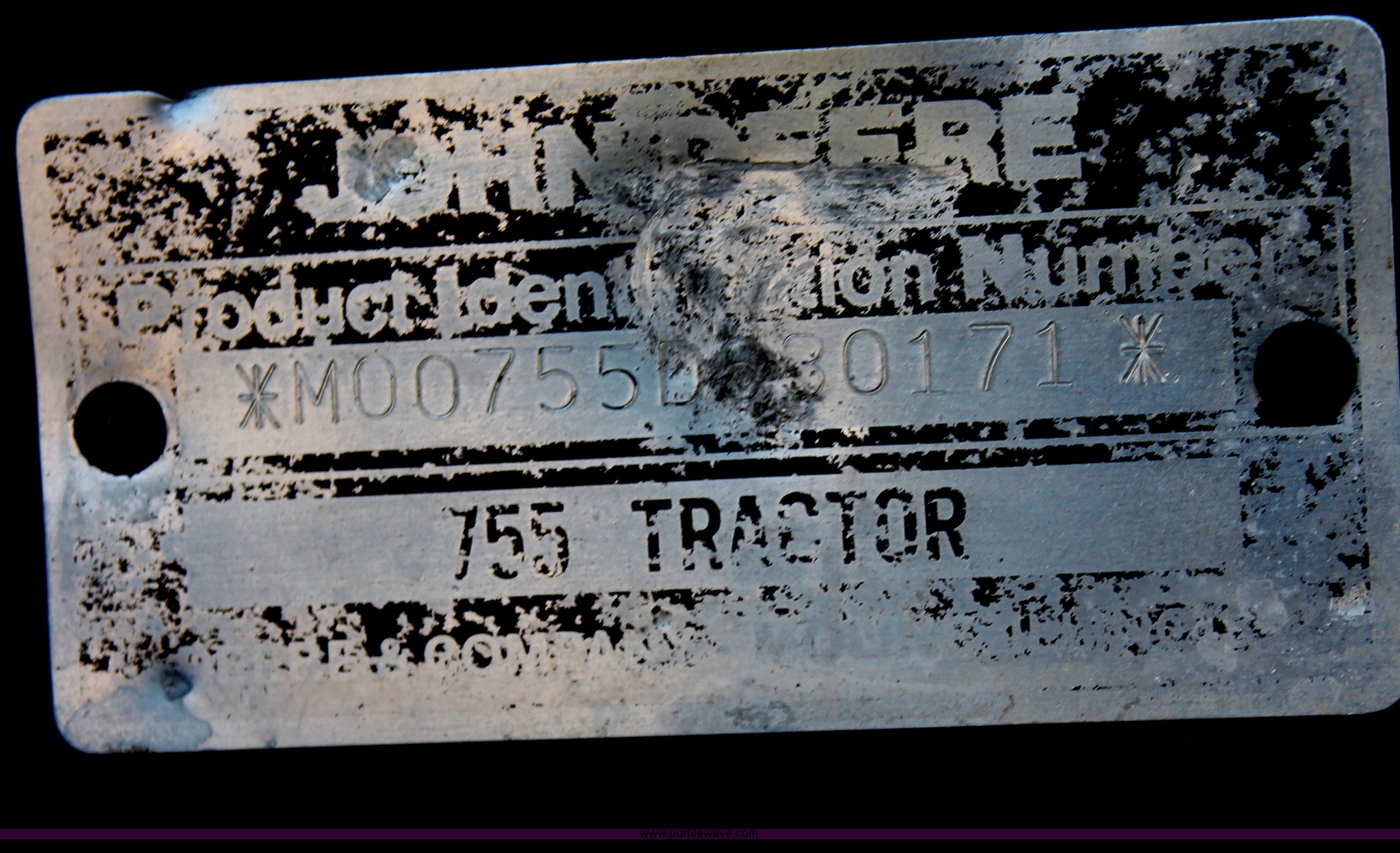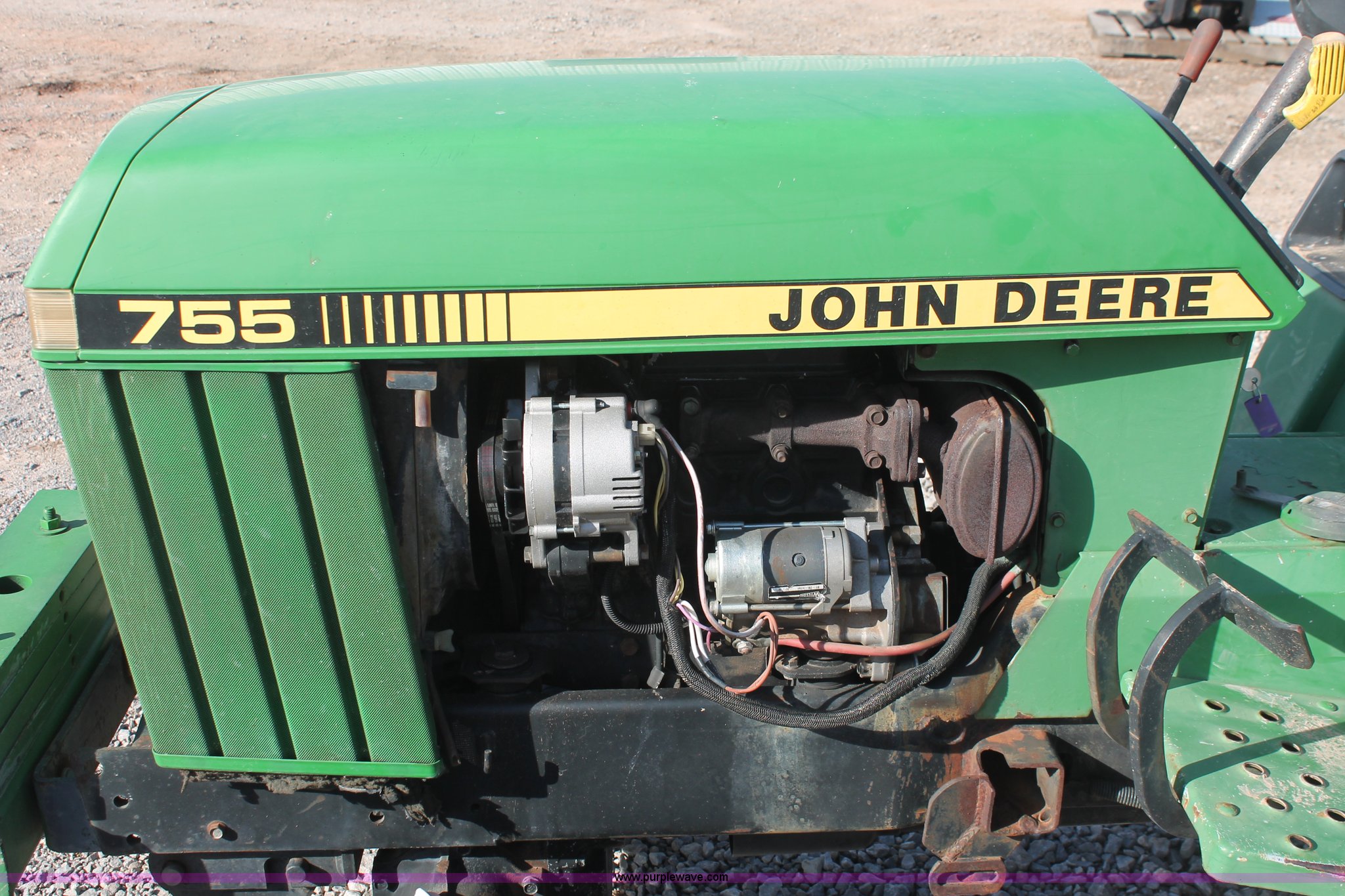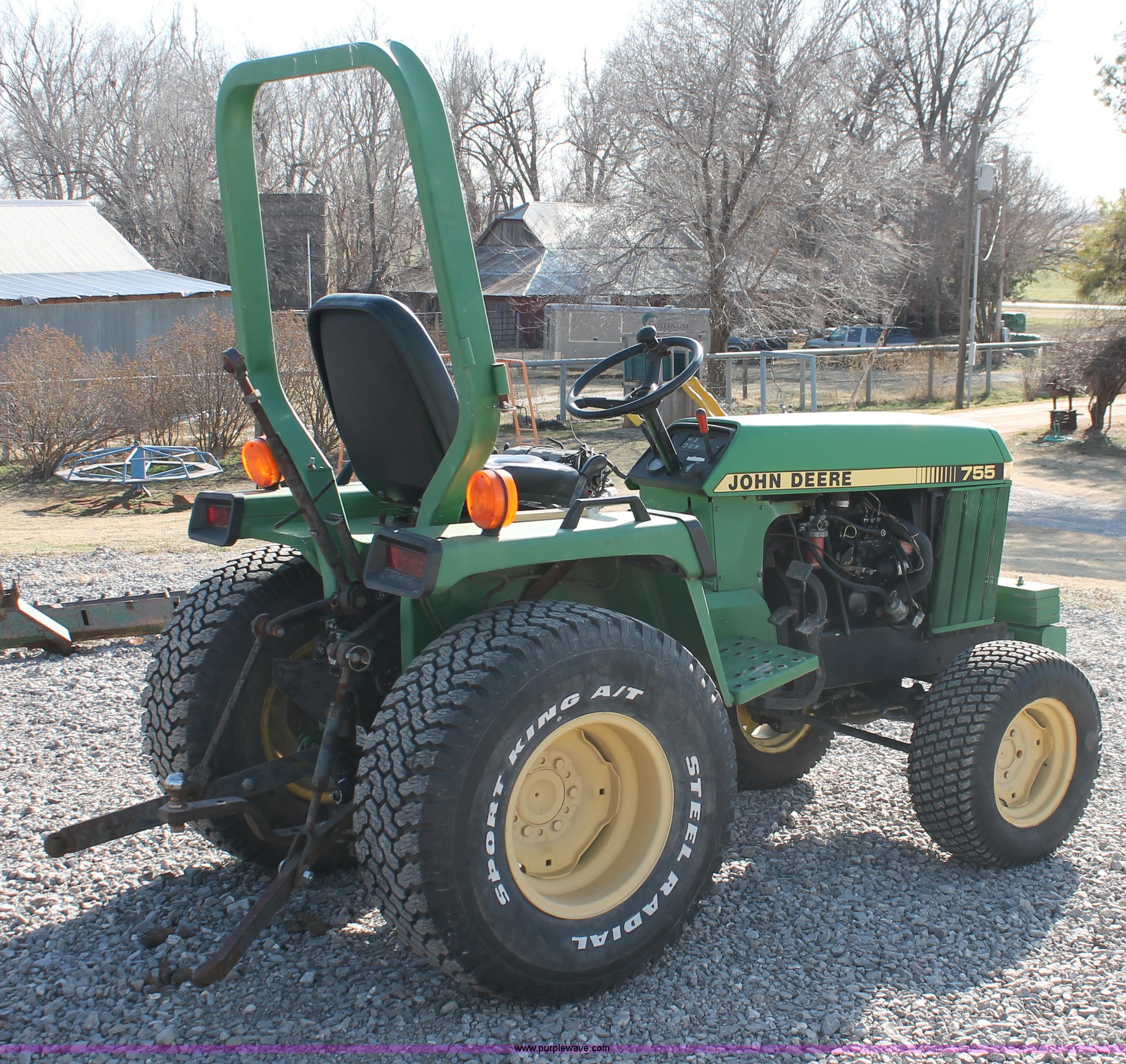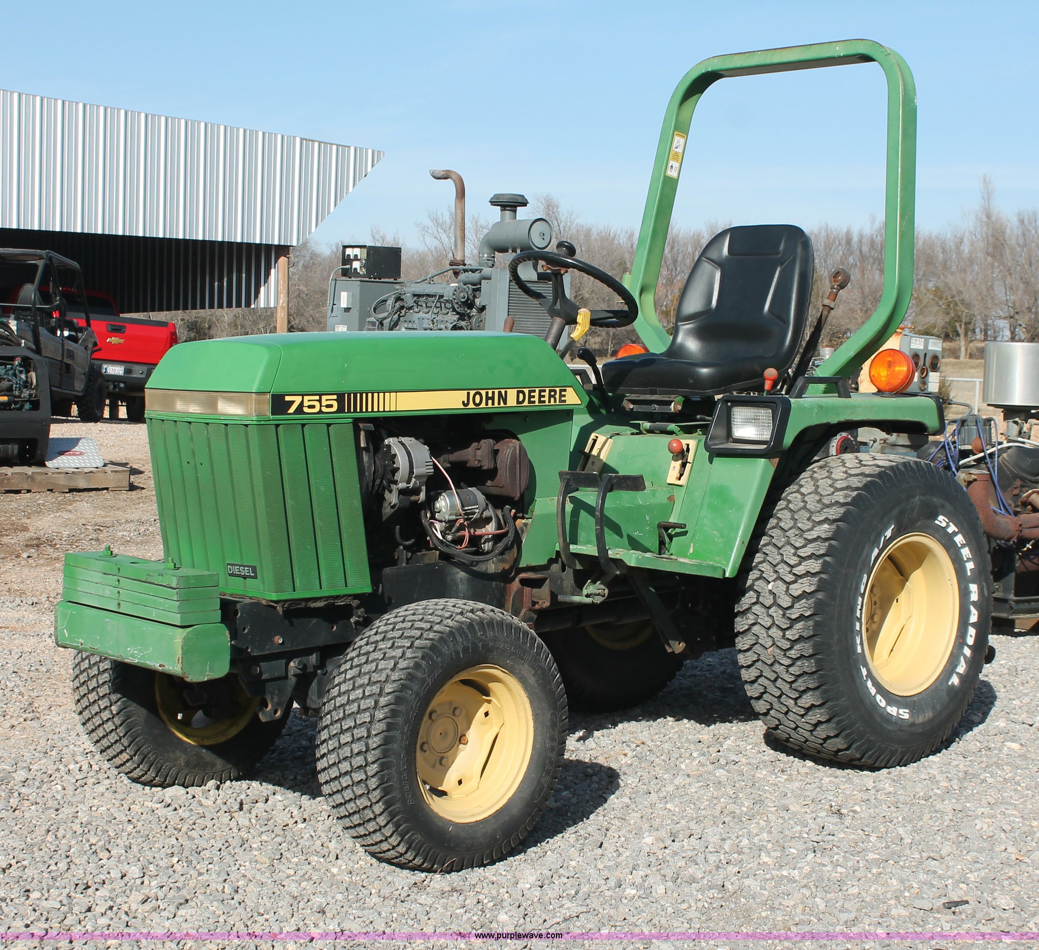 Purple Wave is selling a used Tractor in Oklahoma. This item is a 1988 John Deere 755 MFWD tractor with the following: 1,661 hours on meter, Yanmar three cylinder diesel engine, 20 HP, Hydrostatic transmission, Differential lock, ROPS bar, Spring suspension seat, Three point, Draw bar, 540 PTO, 2" ball, (4) front suitcase weights, 57" wheelbase, 23x9.50-12 front tires, 33x12.50R15 rear tires, Instructor's manual included, 4.4 gallon fuel tank, Serial M00755D530171