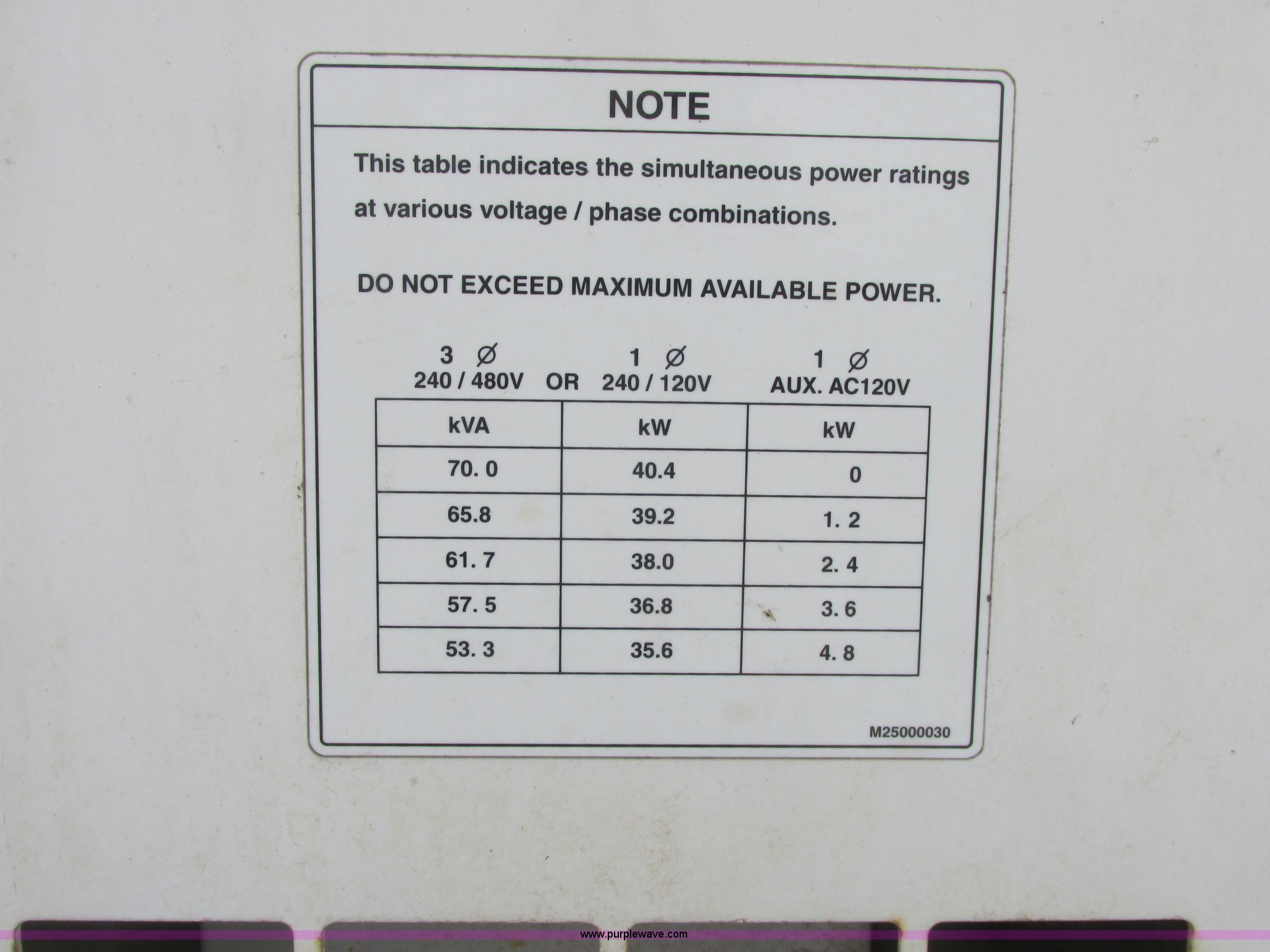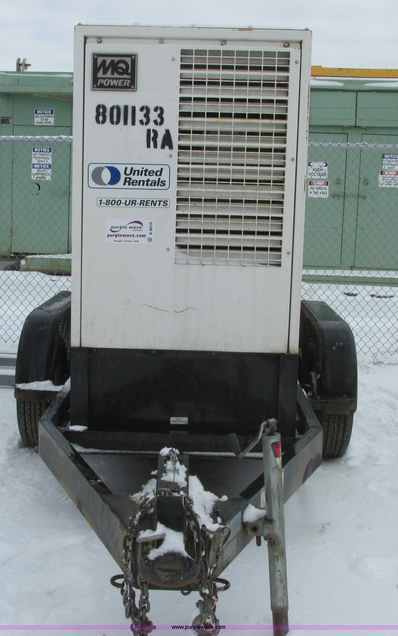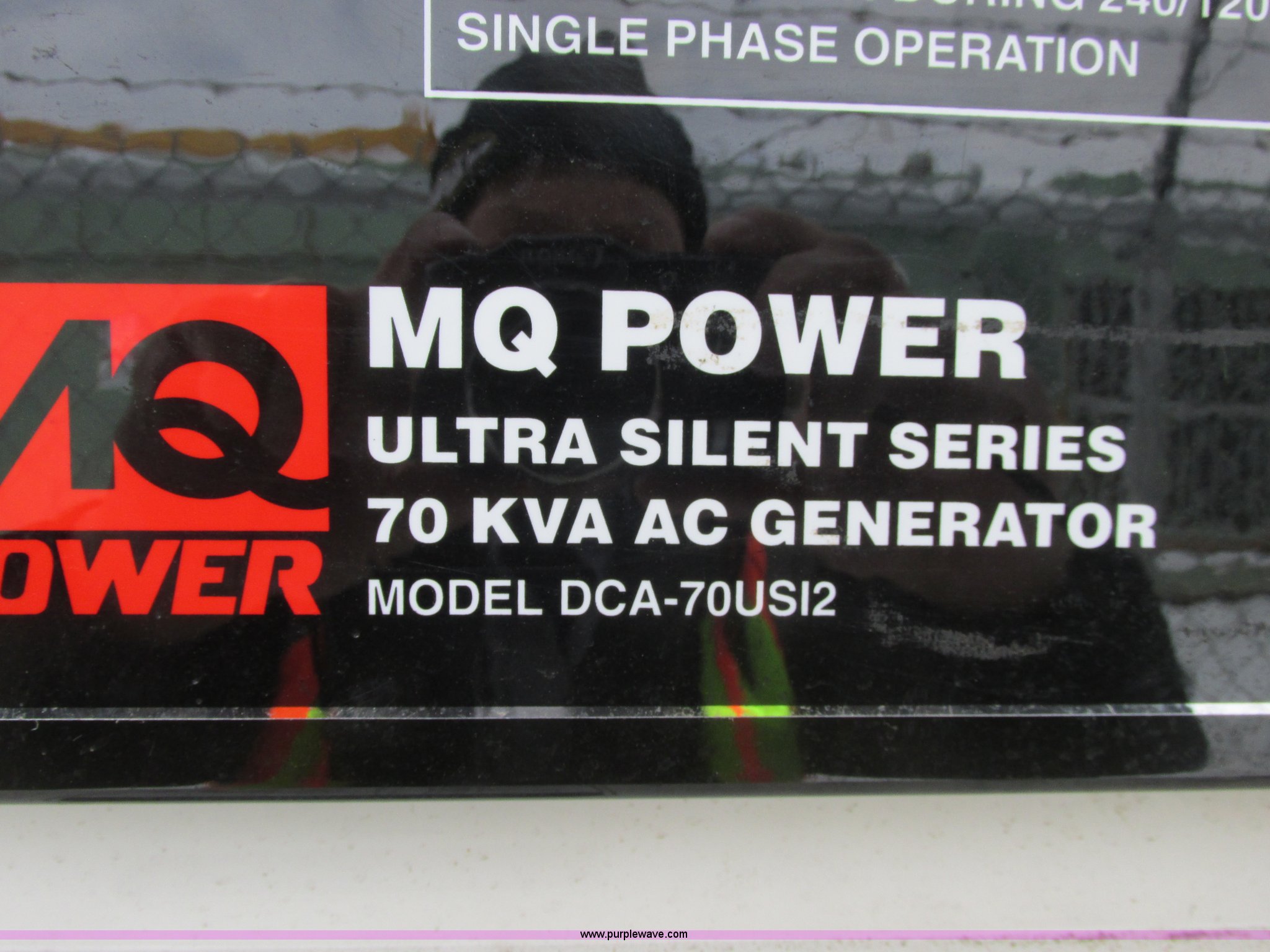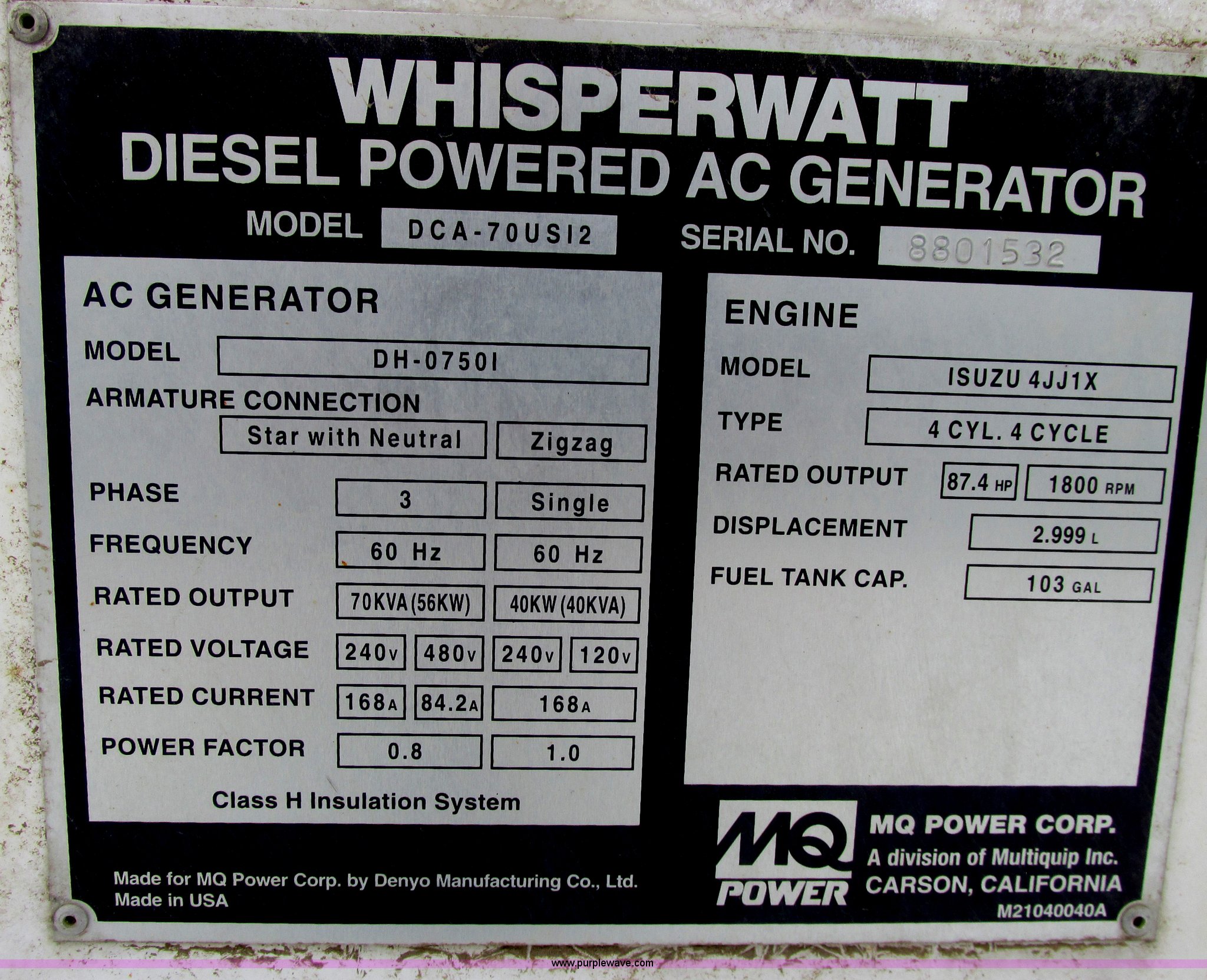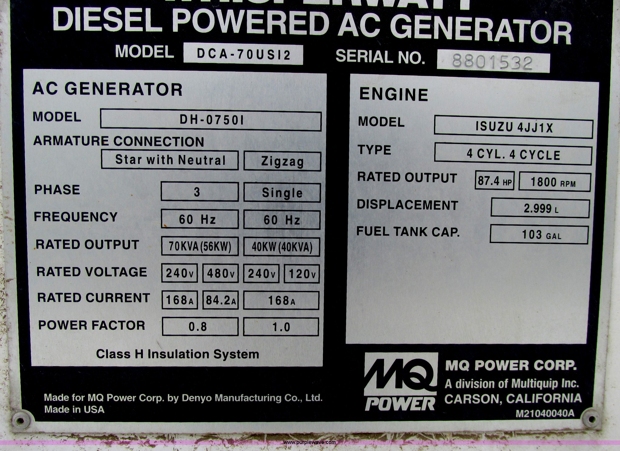 Purple Wave is selling a used Generator Set in North Dakota. This item is a 2010 Multiquip DCA70USI2C generator with the following: 11,000 hours on meter, Isuzu 4JJ1X diesel engine, 87 HP, 56 kW output, Three phase, 40 kW output, Single phase, Denco AC generator, Pintle hitch, 103 gallon fuel tank, Torsion suspension, Surge brakes, ST205/75R15 tires, Engine is inoperable, Blows smoke out of exhaust, Slight miss, May have a broken oil ring, Burns oil, Serial 8801532, EIN 801133RA