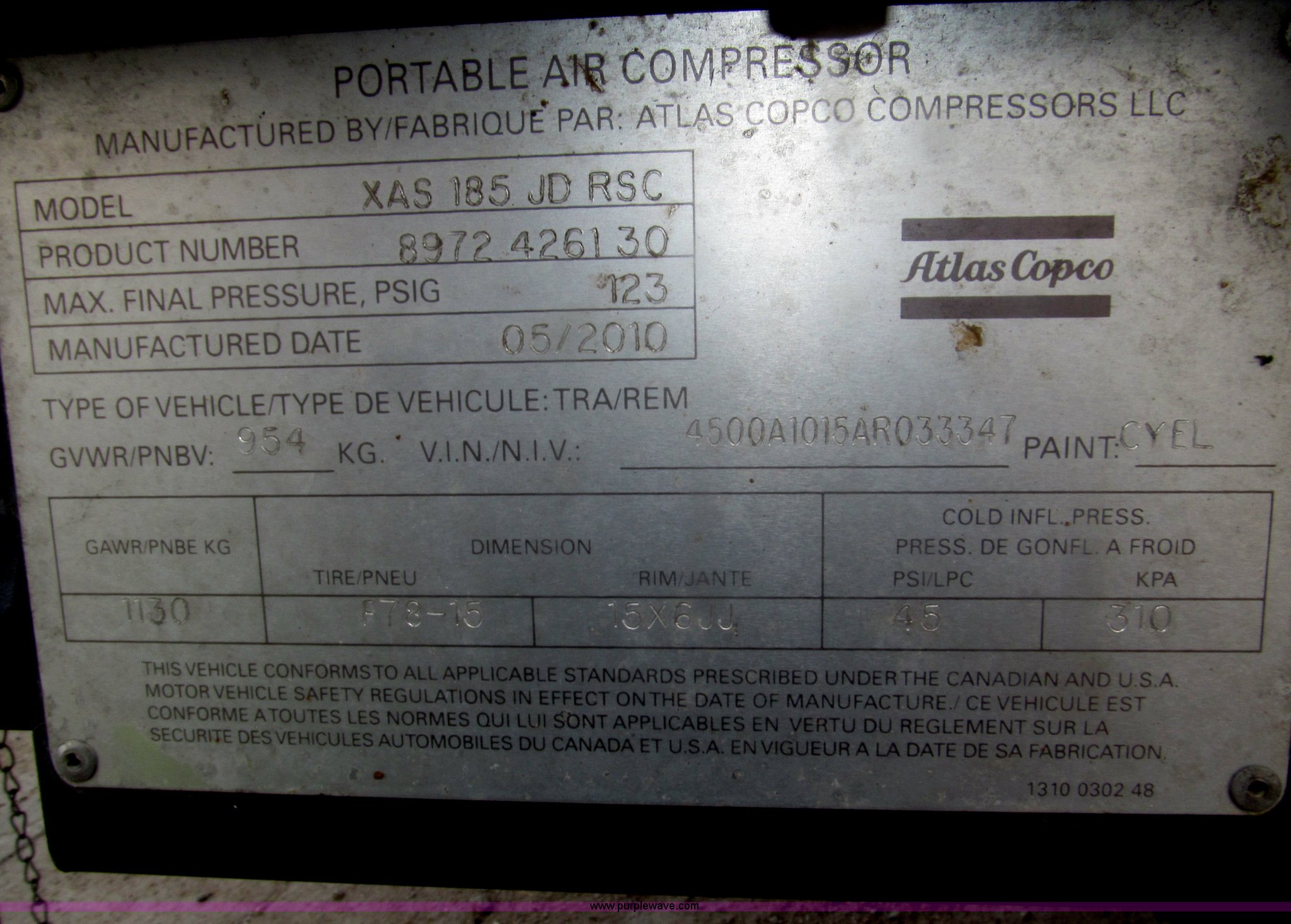 2010 Atlas Copco XAS185JDRSC air compressor has sold in Omaha, Nebraska for $9350. Item F7336 sold on April 22nd, 2014.