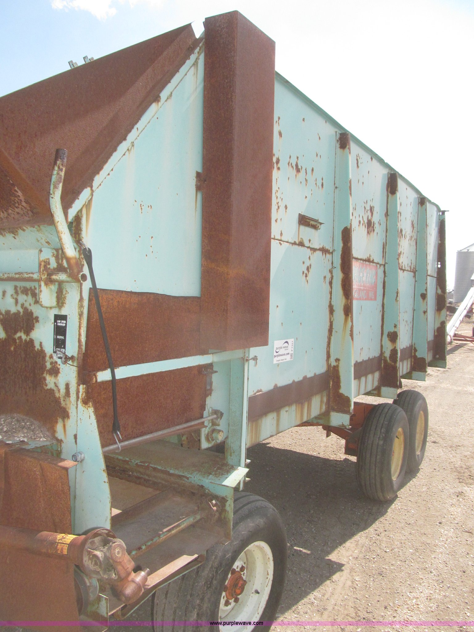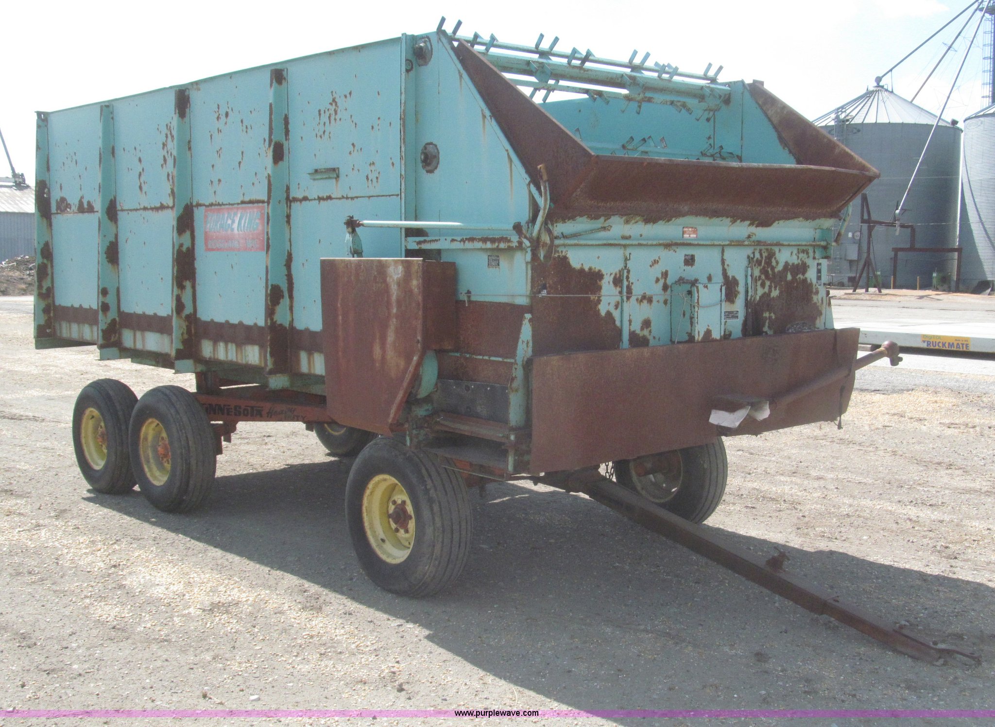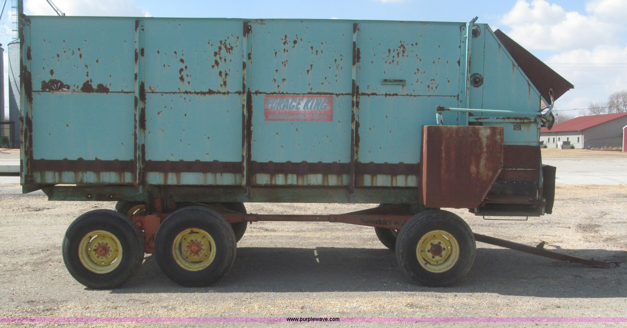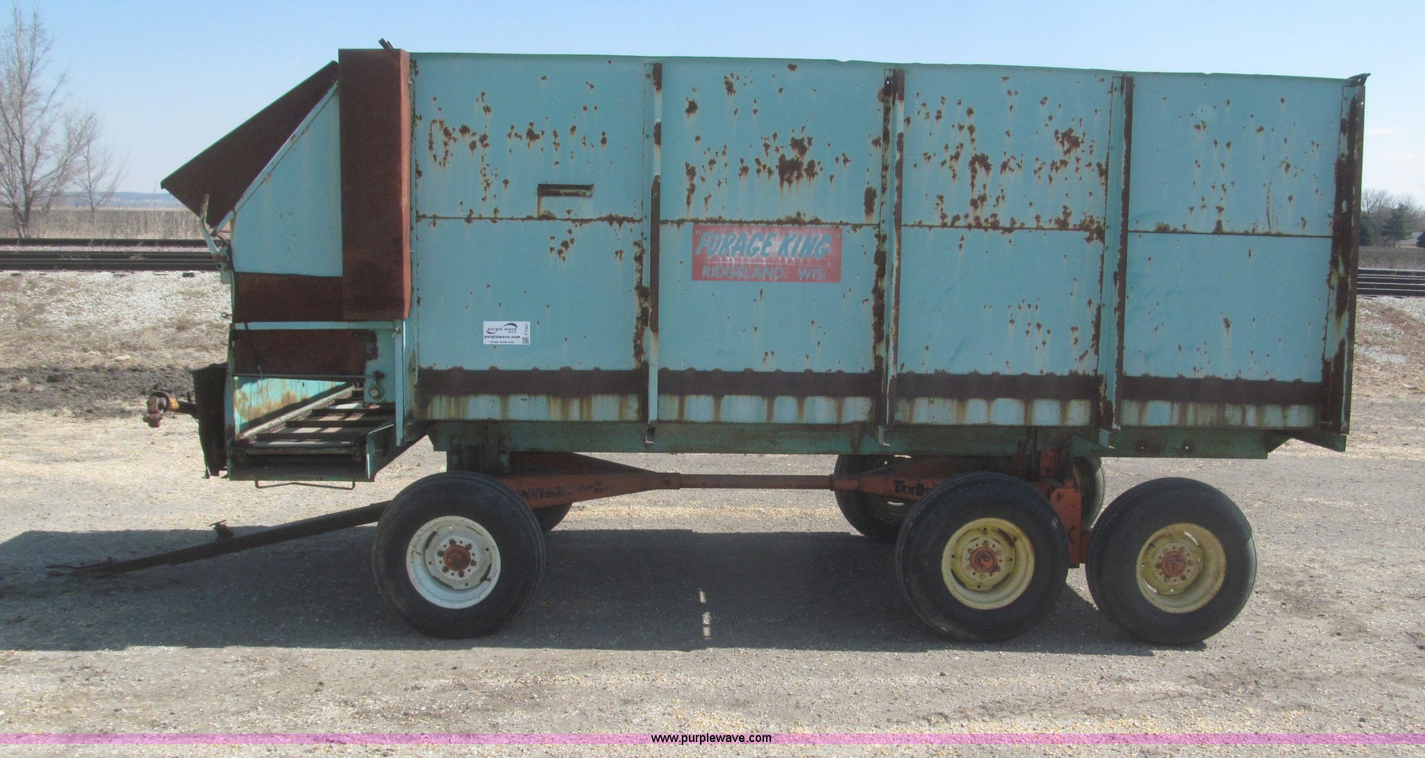 Purple Wave is selling a used Forage Head or Silage Handling in Iowa. This item is a Forage King A186 forage wagon with the following: 540 PTO, Two speed apron, Rear end gate, Approx. 16'L x 7'W O.D. box, Approx. 100"H ground to top of side rail, Adjustable length pin hitch tongue, Rear pin hitch, Minneota Tandem 12 running gear, Model12078, Six hole steel wheels, 11L-15 tires, Tires cracking, Floor showing wear, Serial 1068