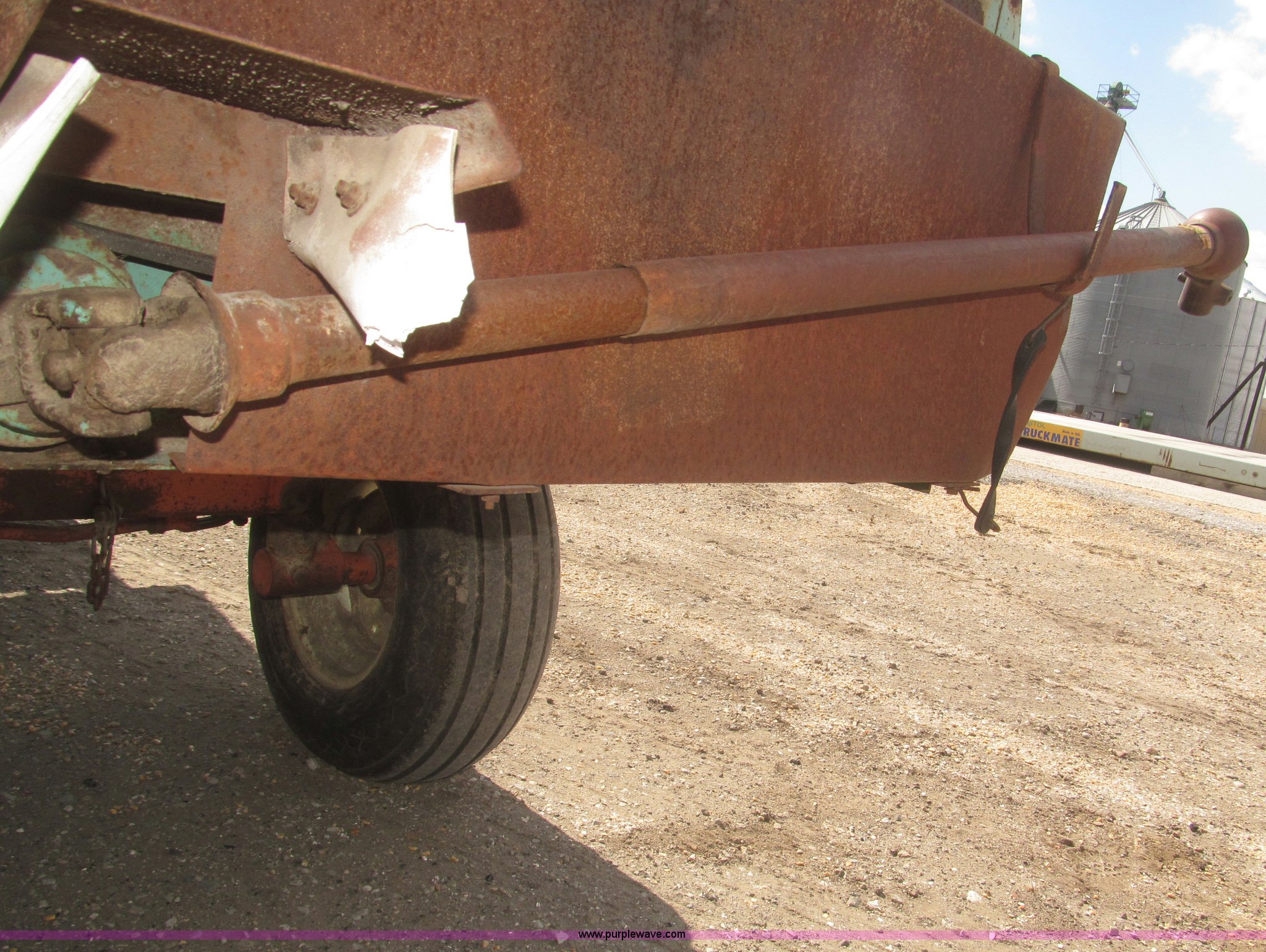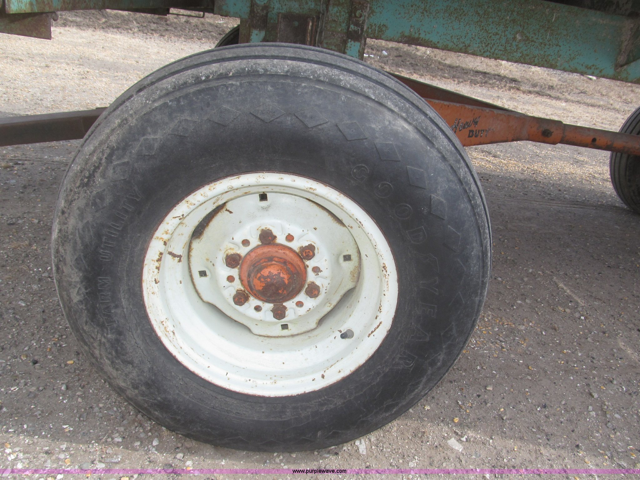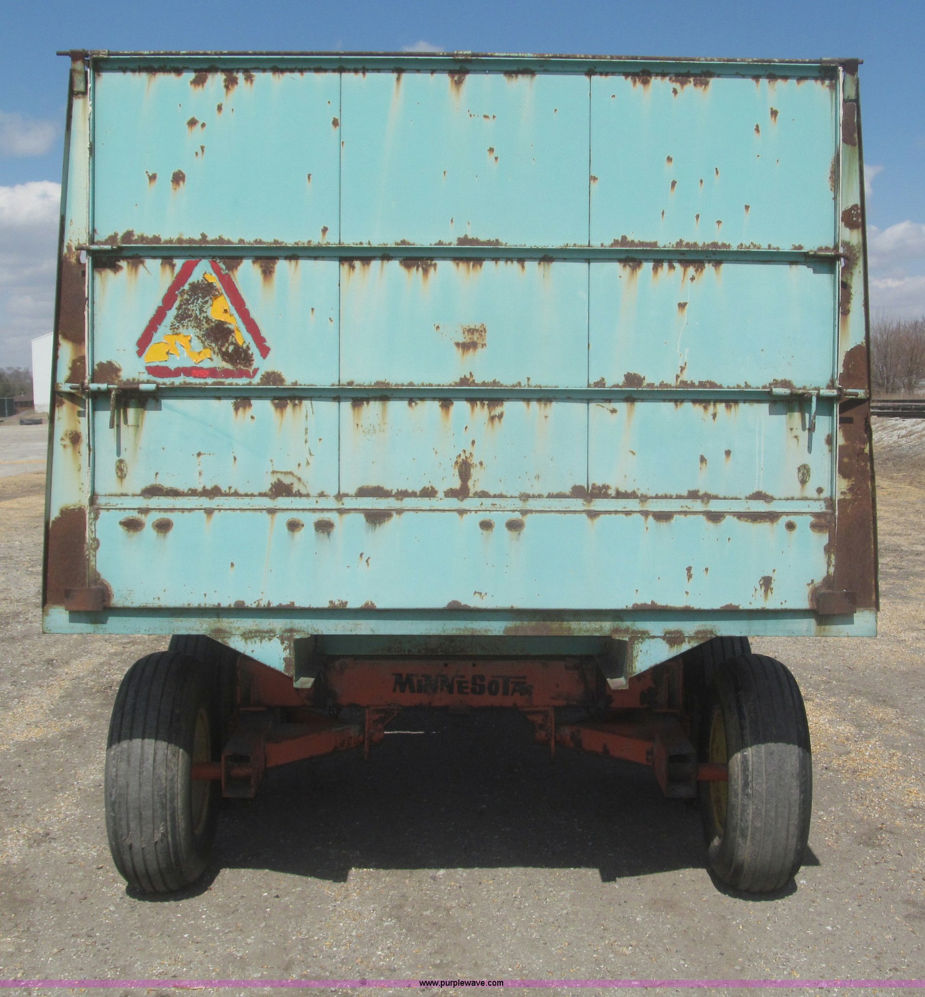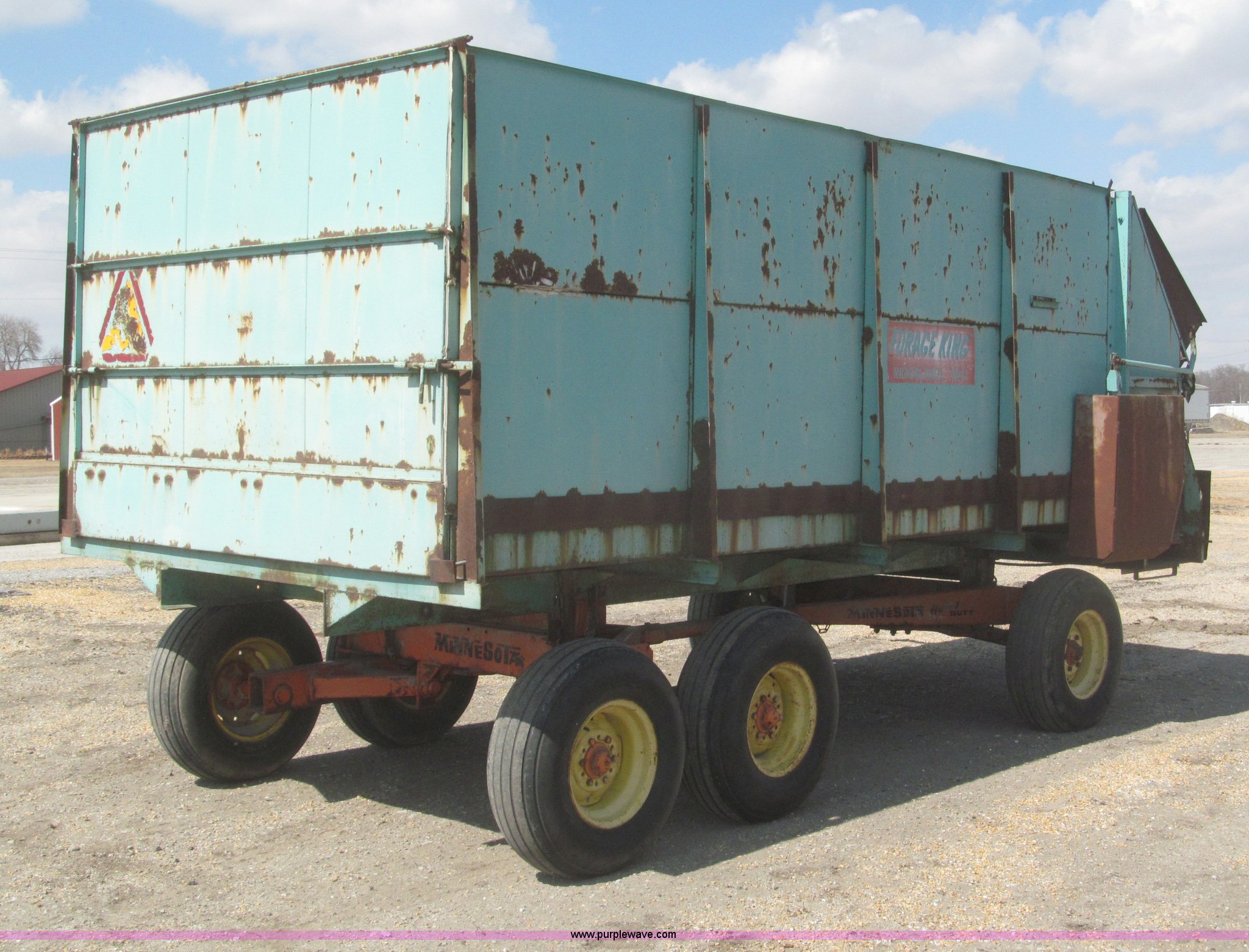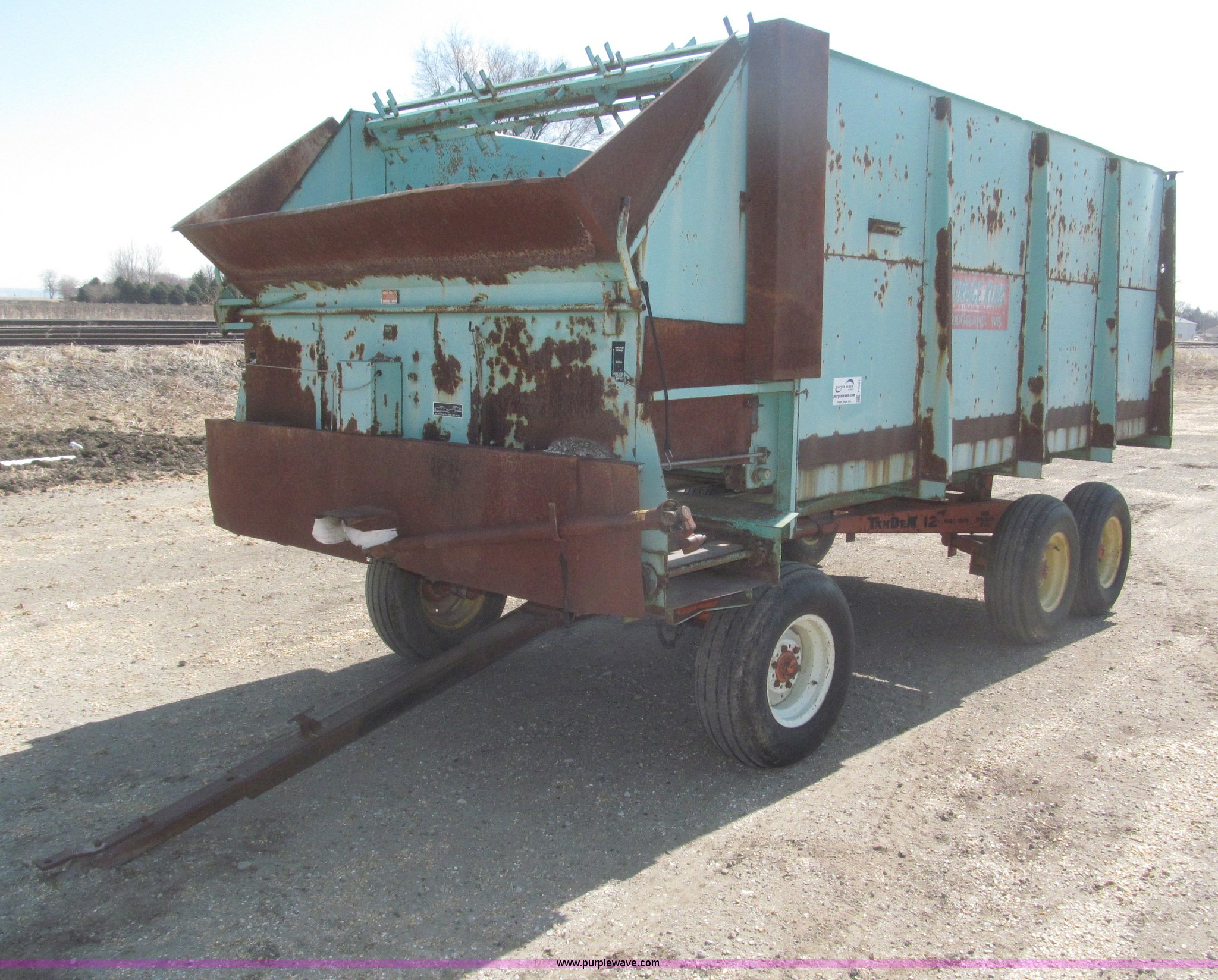 Purple Wave is selling a used Forage Head or Silage Handling in Iowa. This item is a Forage King A186 forage wagon with the following: 540 PTO, Two speed apron, Rear end gate, Approx. 16'L x 7'W O.D. box, Approx. 100"H ground to top of side rail, Adjustable length pin hitch tongue, Rear pin hitch, Minneota Tandem 12 running gear, Model12078, Six hole steel wheels, 11L-15 tires, Tires cracking, Floor showing wear, Serial 1068